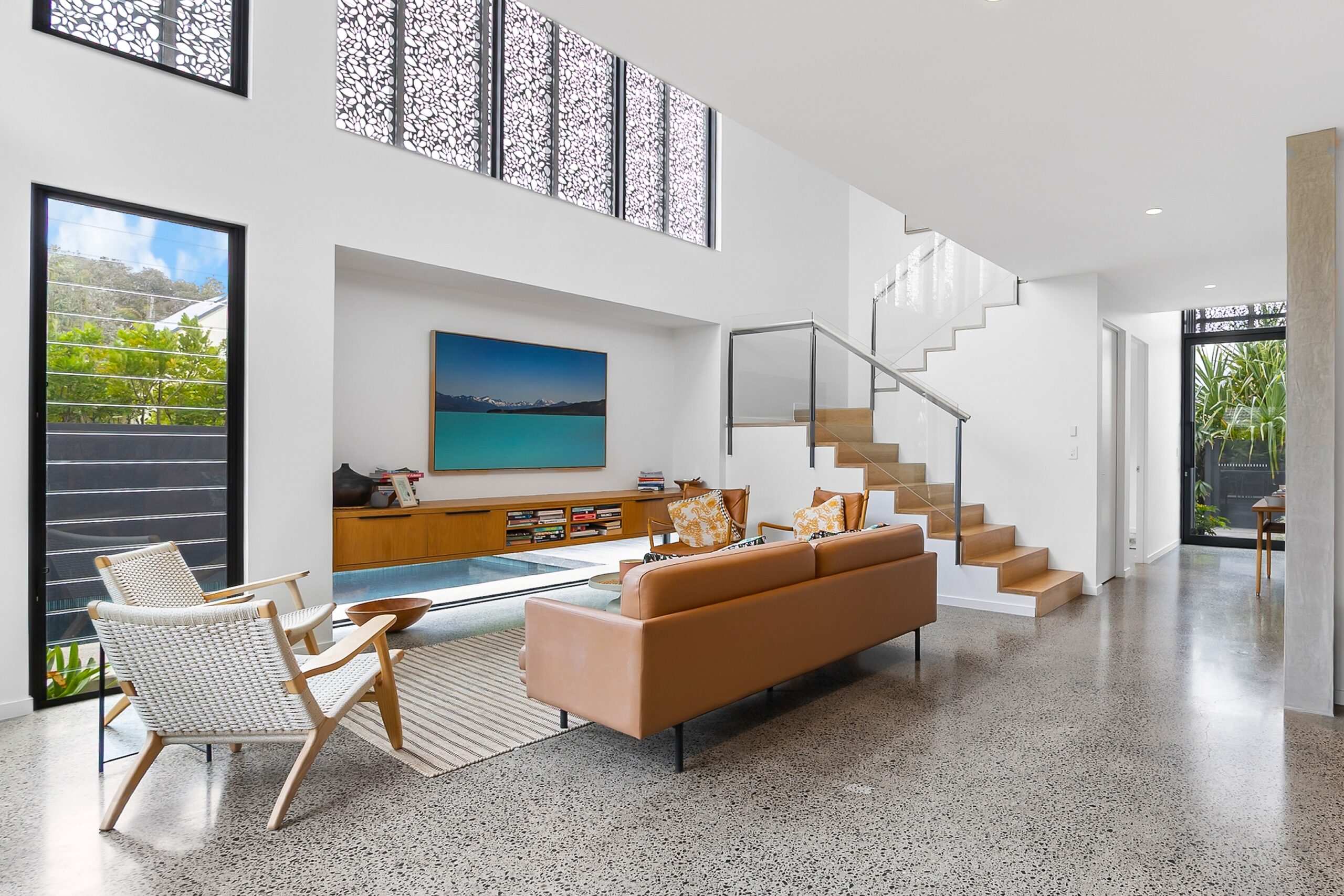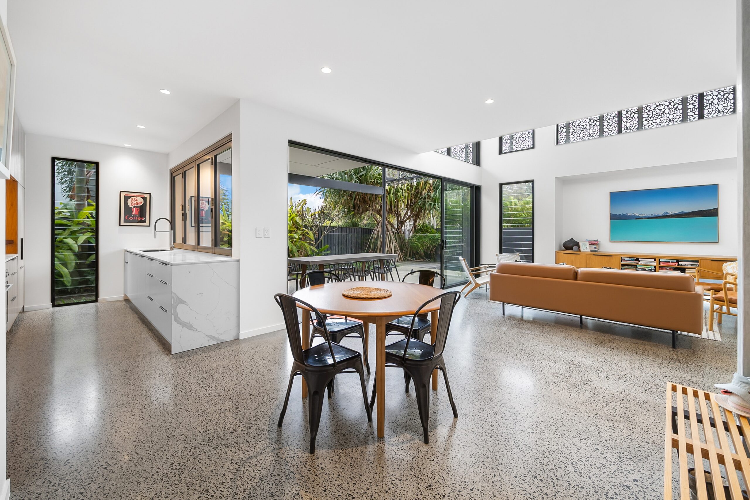 The open living and dining areas seamlessly flow through to the kitchen, with a bi-fold servery window extending from the indoor kitchen to the undercover outdoor area, offering easy entertaining overlooking the sparkling pool and enjoying the soothing sound of ocean waves.