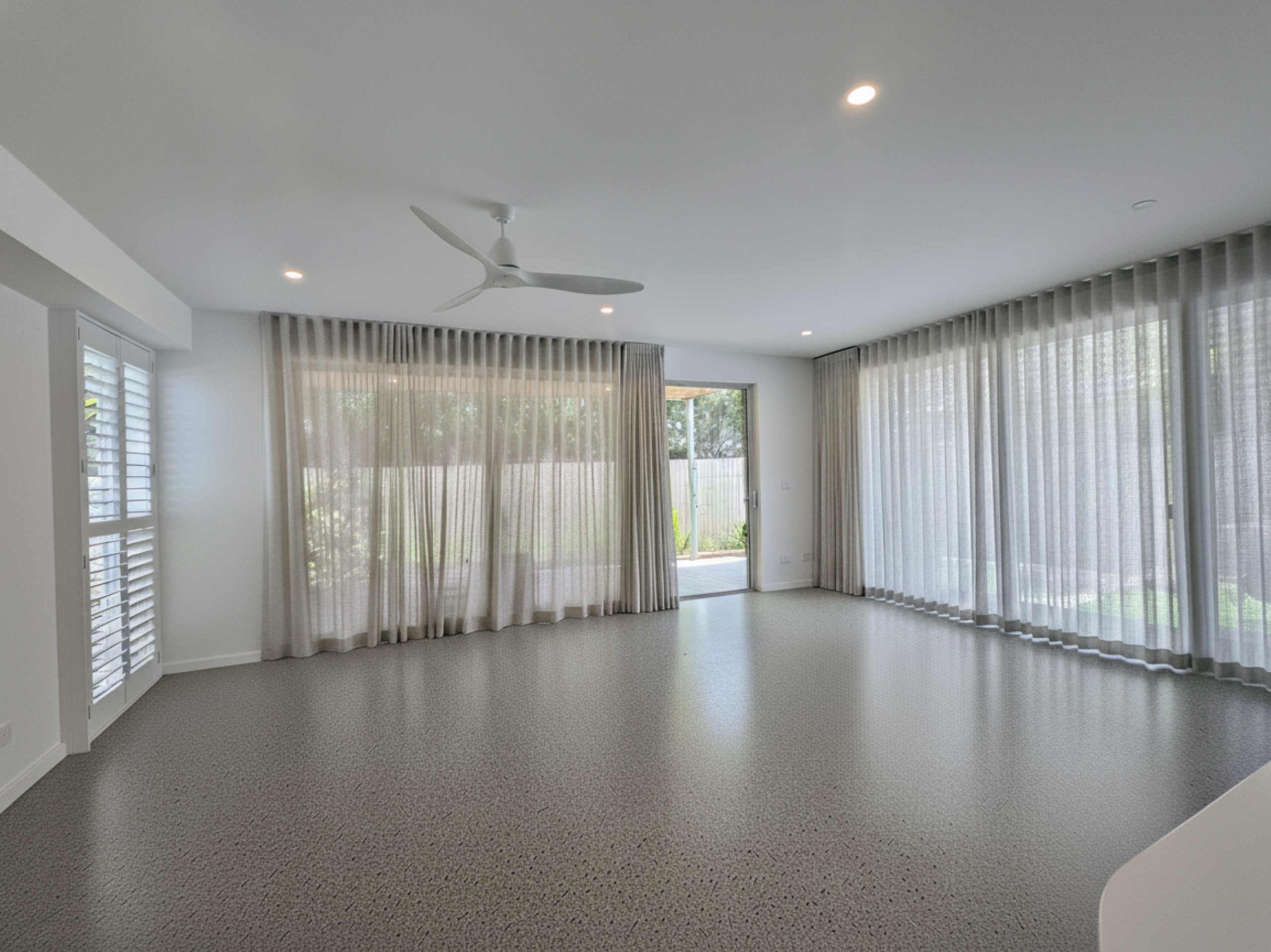 Step inside to double height ceilings, a statement chandelier, polished concrete flooring and an abundance of natural light create an inviting atmosphere. The open-plan living area is the true heart of the home, seamlessly connecting to the outdoor entertaining area and plunge pool.