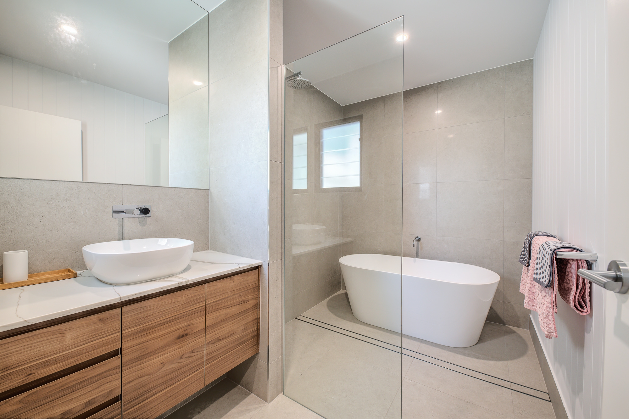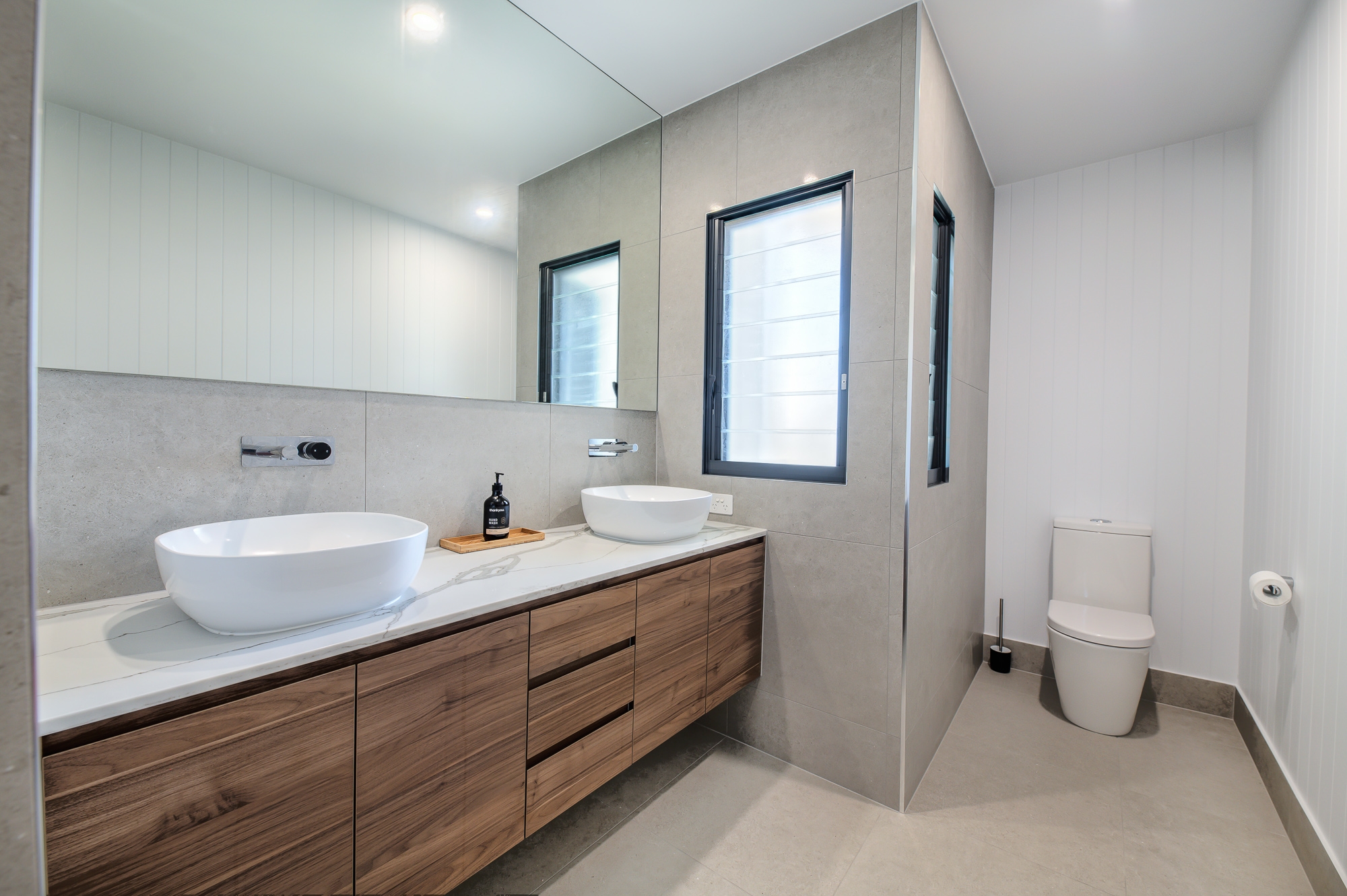 • Stylish family bathroom with marble vanity, freestanding bath, walk-in shower, and separate WC