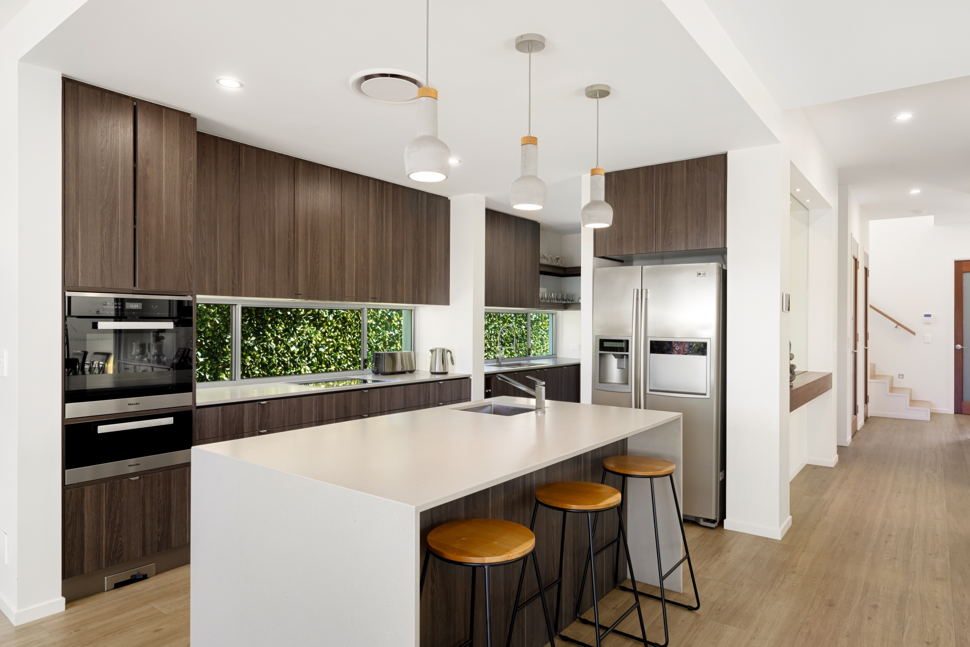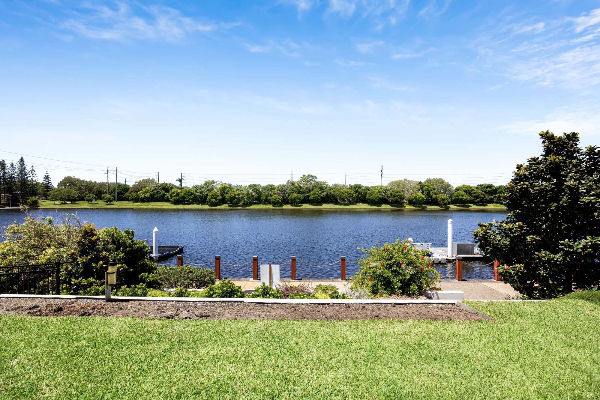 The open plan living, dining and kitchen all have views over the canal. The elegant kitchen boasts exquisite stone benchtops, butler’s pantry, Miele appliances, two-pak soft close cabinetry and abundant storage.