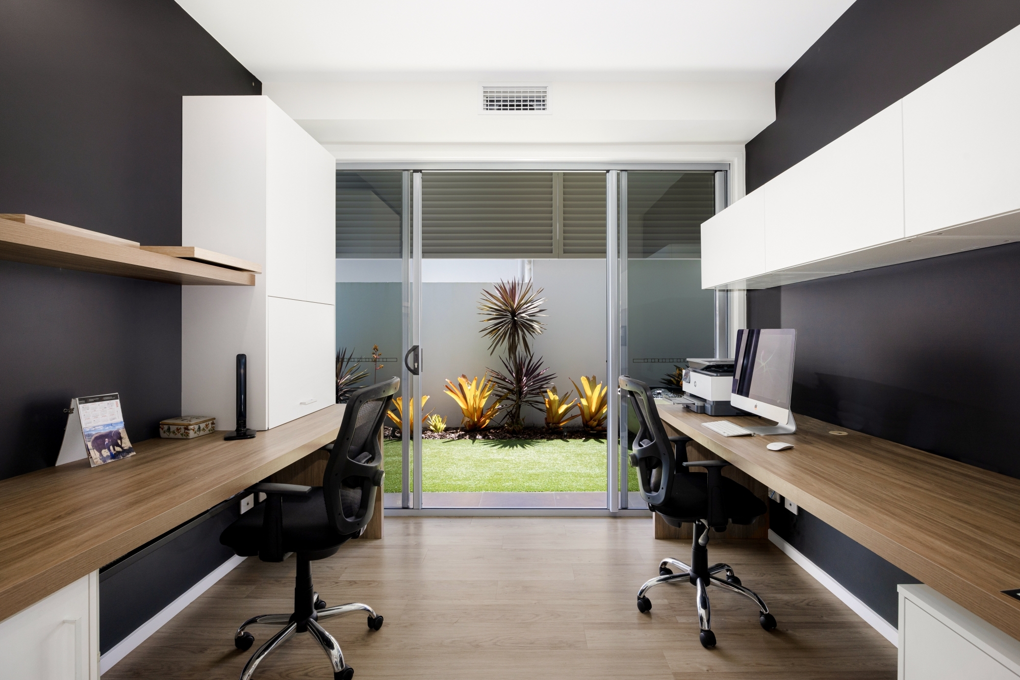 Further down the hallway there is a large laundry with stone benchtops and modern cabinetry. There is a very spacious home office which has been designed with two work stations and comes complete with built-in desks and cupboards.