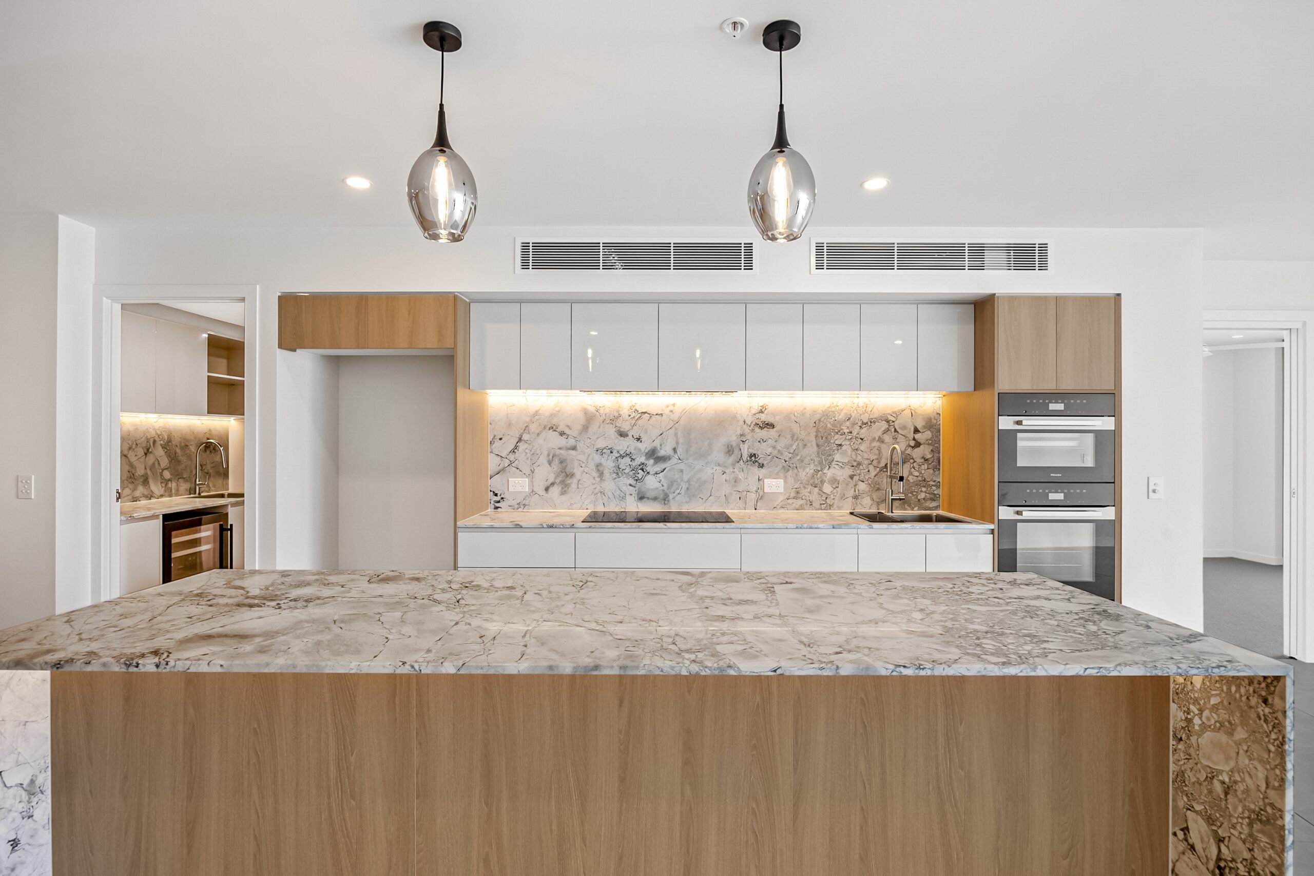 Durable, elegant stone benchtops complete the kitchen, adding a timeless, polished look that enhances the kitchen’s modern appeal