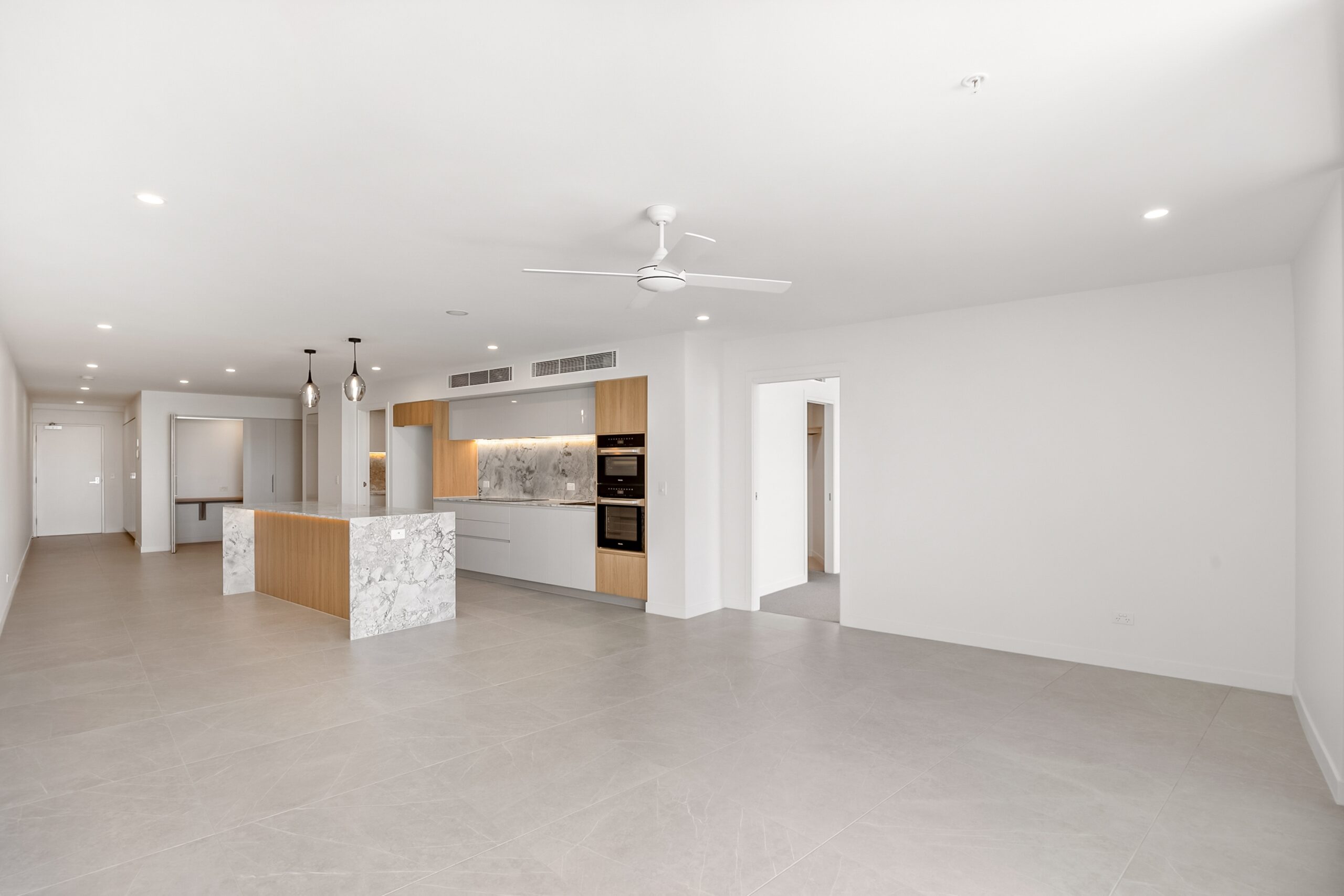 Ducted air conditioning throughout the apartment ensures comfort in every season, while ceiling fans offer added airflow in each room
