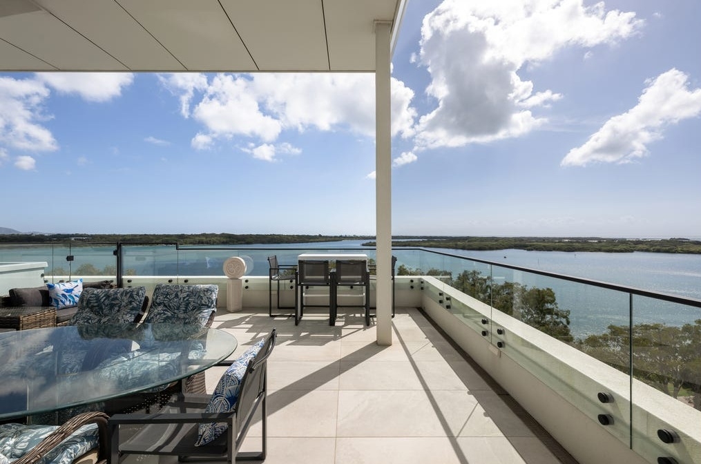 Experience an exceptional lifestyle from this expansive, light-filled penthouse in the prestigious The Ivy at Picnic Point. Offered unfurnished, this house-sized residence delivers space, privacy, and breathtaking 270° north-easterly views across the Maroochy River, coastline and hinterland. Designed across a generous floorplan with two distinct wings connected by a striking glass skybridge, this is a rare opportunity to enjoy elevated waterfront living with resort-style facilities and unbeatable convenience.