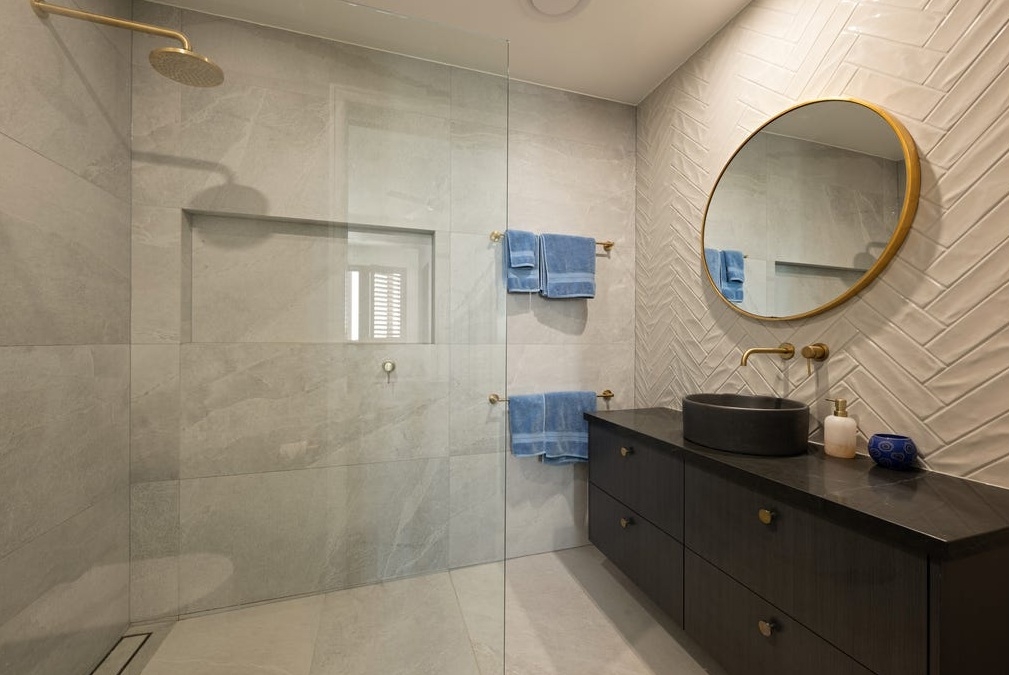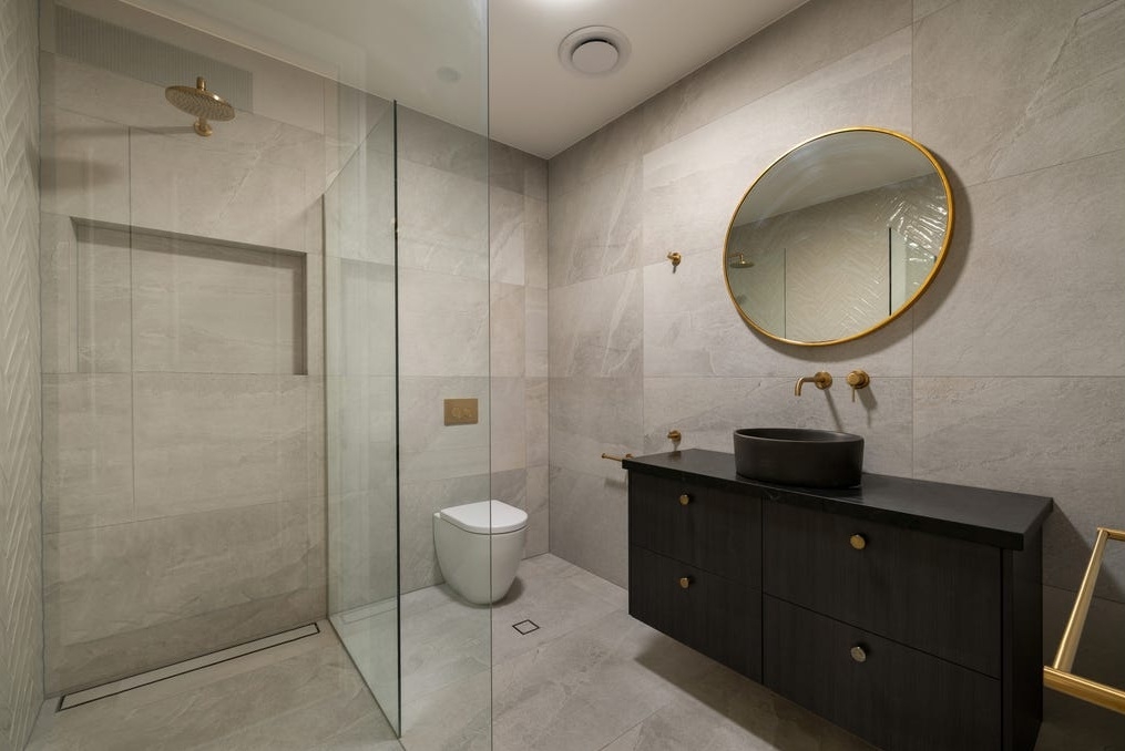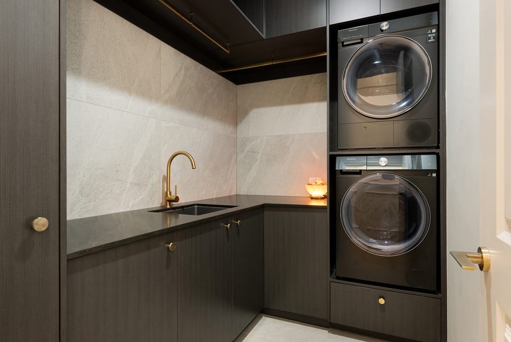 • Three fully tiled bathrooms plus powder room: Finished with high-end fixtures, including brushed brass tapware and quality stone finishes