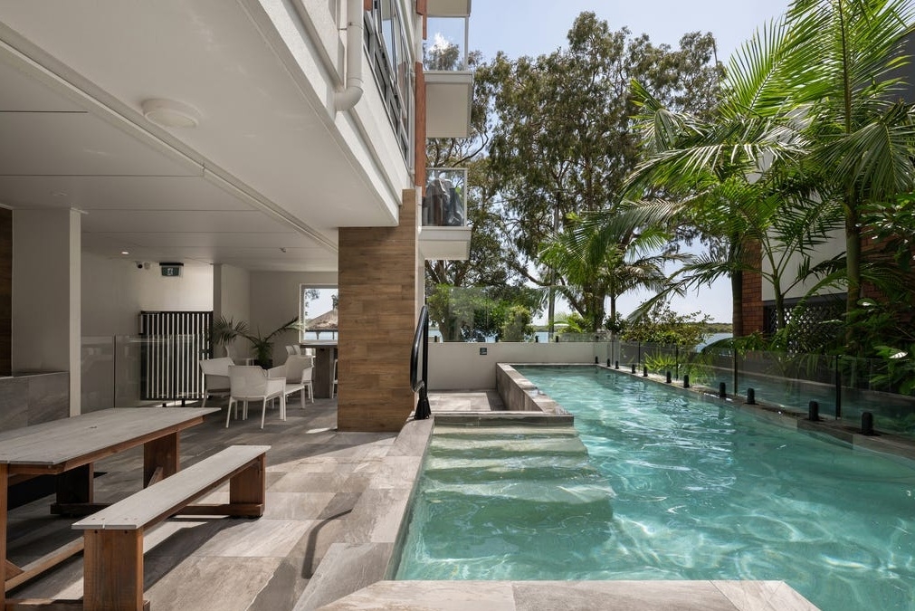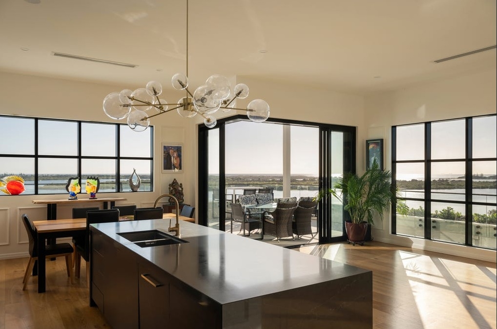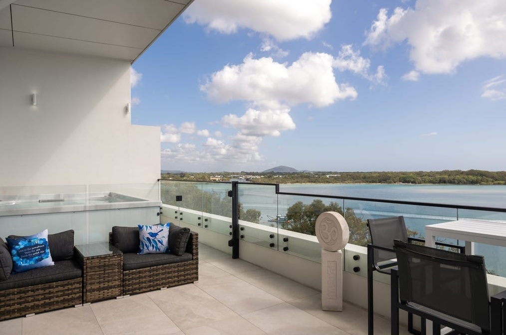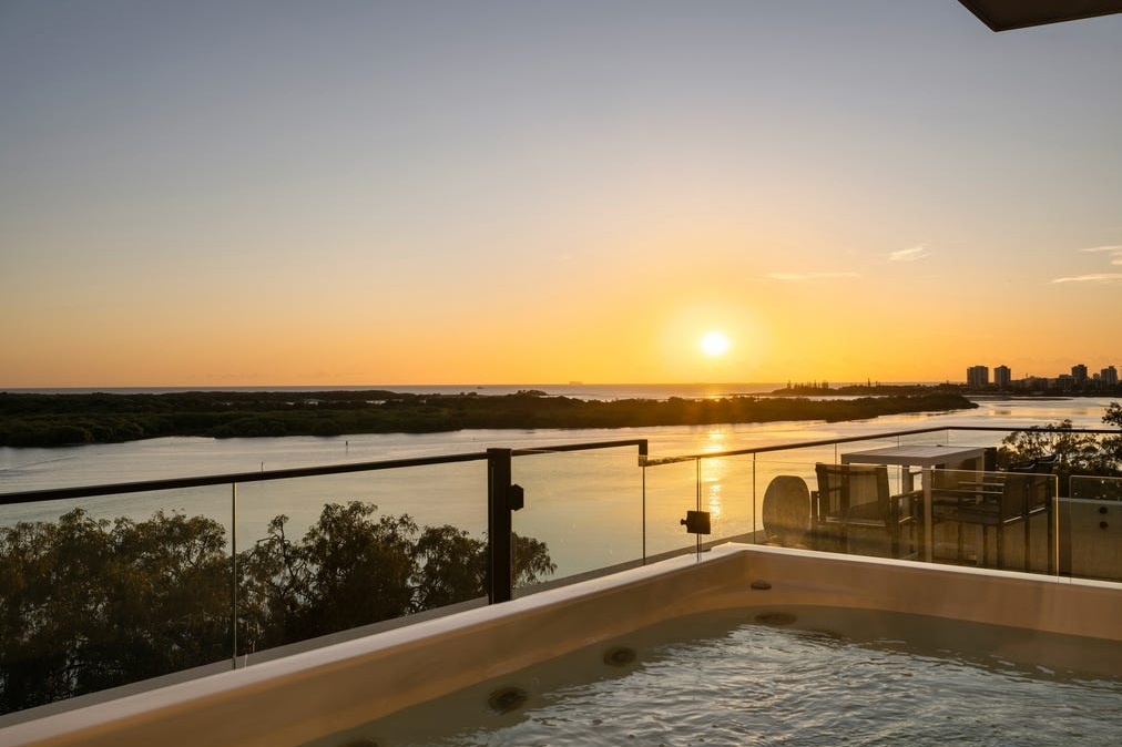• Two private wraparound terraces: One for each wing, including a main entertaining terrace with a large outdoor 12 person spa capturing spectacular river and coastal views