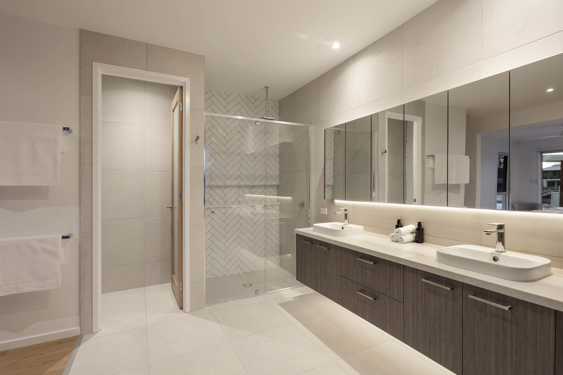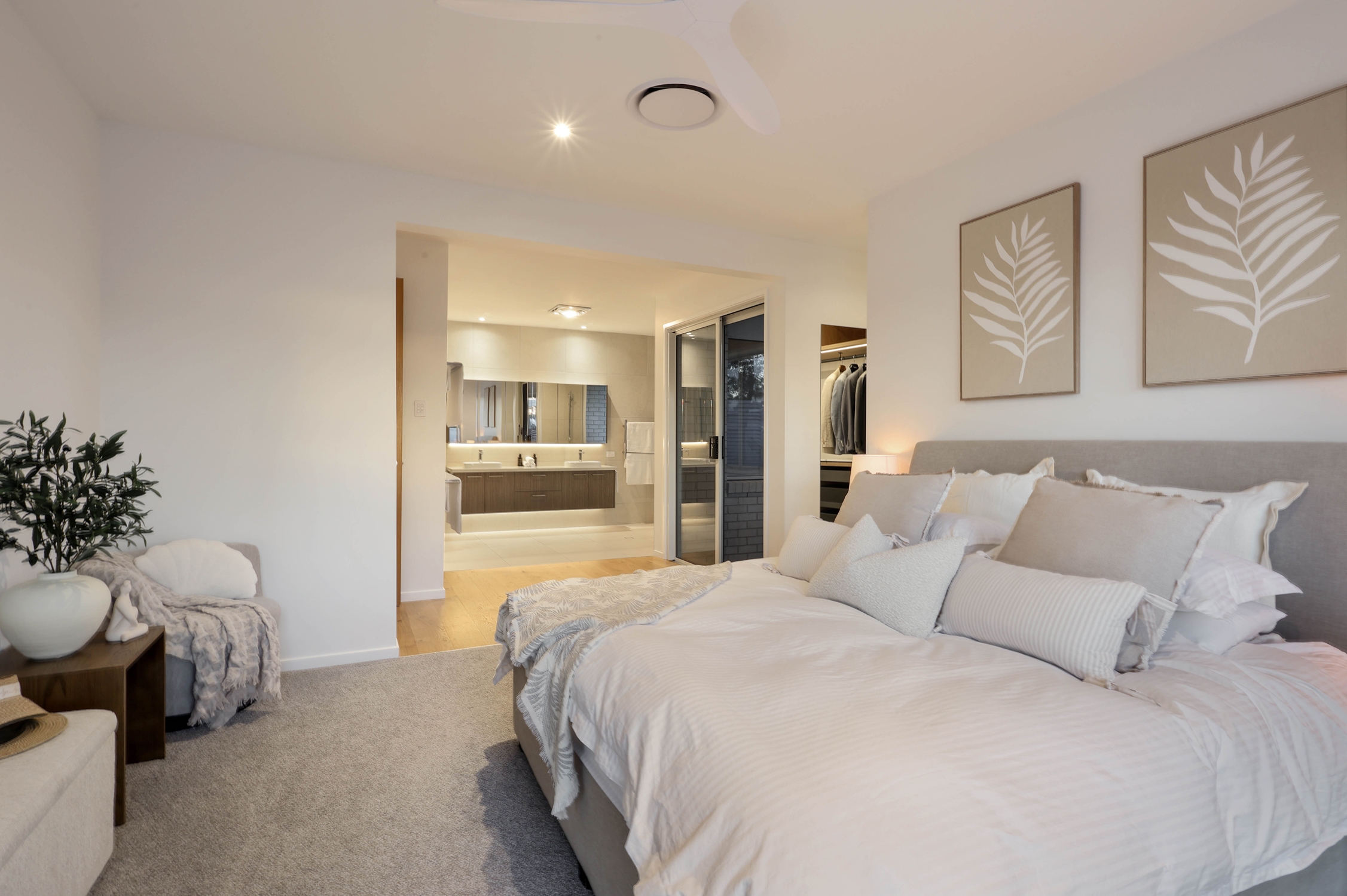 Inside, the home’s scale is immediately evident with 2.7-metre ceilings, 2.4-metre doors, extra-wide hallways, and square-set finishes creating a light-filled and spacious atmosphere. Premium 17mm oak timber floors flow through the living zones, while plush 33mm carpet, ceiling fans, and electric blinds enhance each of the bedrooms. The master retreat is a true sanctuary, featuring dual outdoor access, a custom walk-around wardrobe, and a luxurious ensuite with freestanding bath, twin basins, and LED mood lighting.