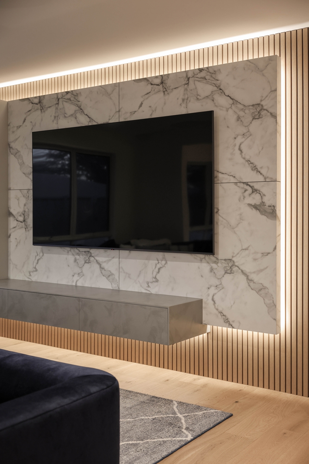 The gourmet kitchen and oversized butler’s pantry have been designed for both function and flair, offering waterfall stone benchtops, a second dishwasher and sink, abundant storage, and motion-sensor LED lighting. A dedicated home theatre with an 86-inch screen provides the perfect space for entertainment, while three double-width linen cupboards and a well-equipped laundry with external access add everyday convenience.