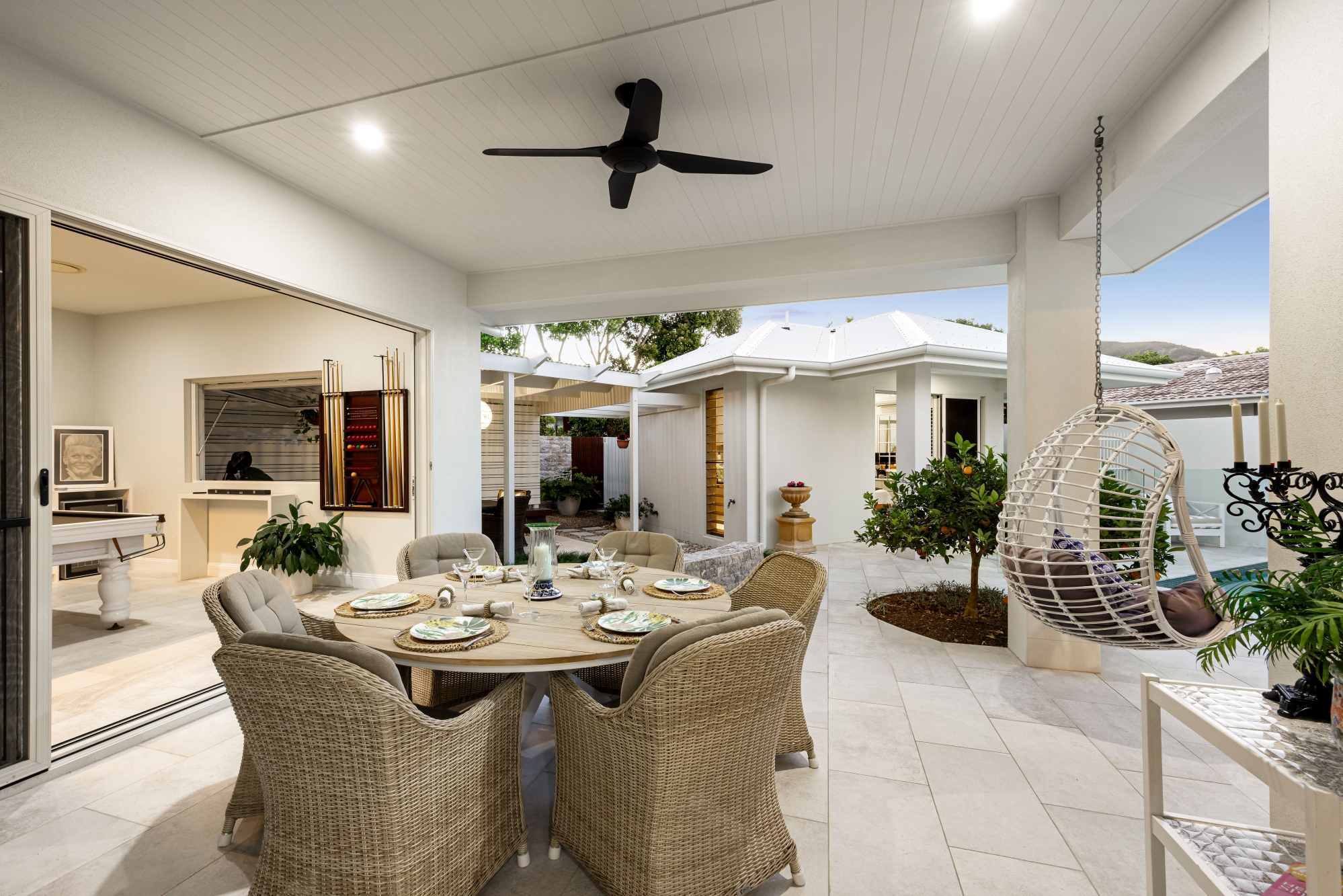 Tucked away in a quiet cul-de-sac just minutes from Mount Coolum’s pristine beach and national park, 12 Kallatina Court is a timeless coastal haven. Designed for relaxed sophistication, this home blends resort-style living with privacy, space, and effortless flow. Set on a generous 708m² block and spanning 442m² under roof, every corner has been thoughtfully planned for both connection and retreat.