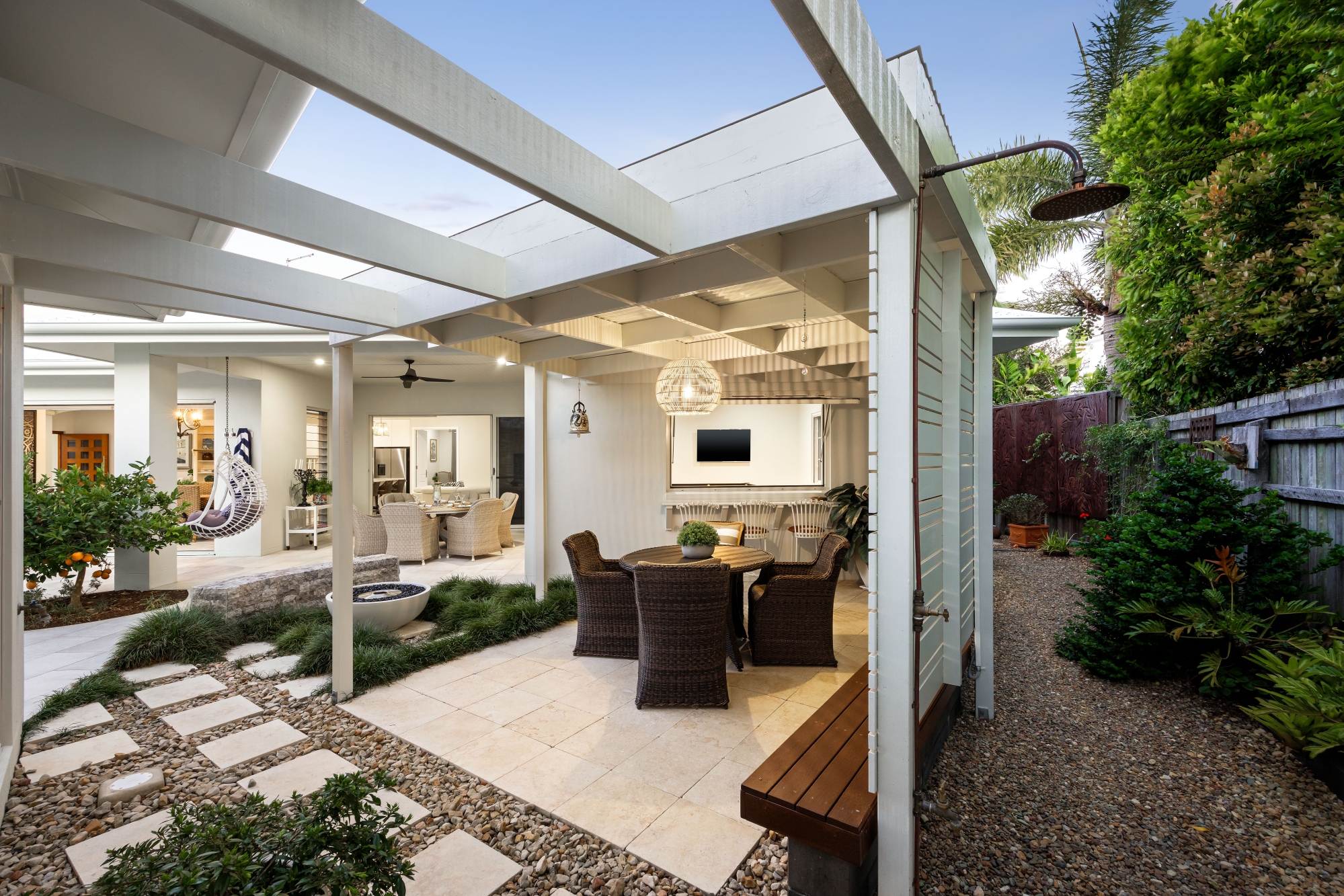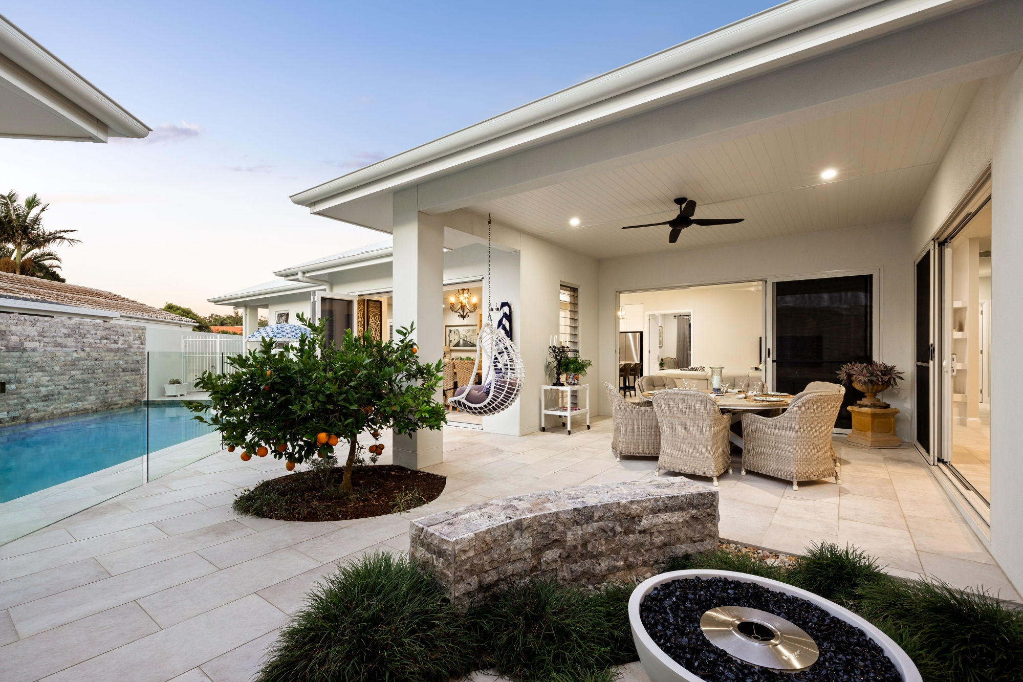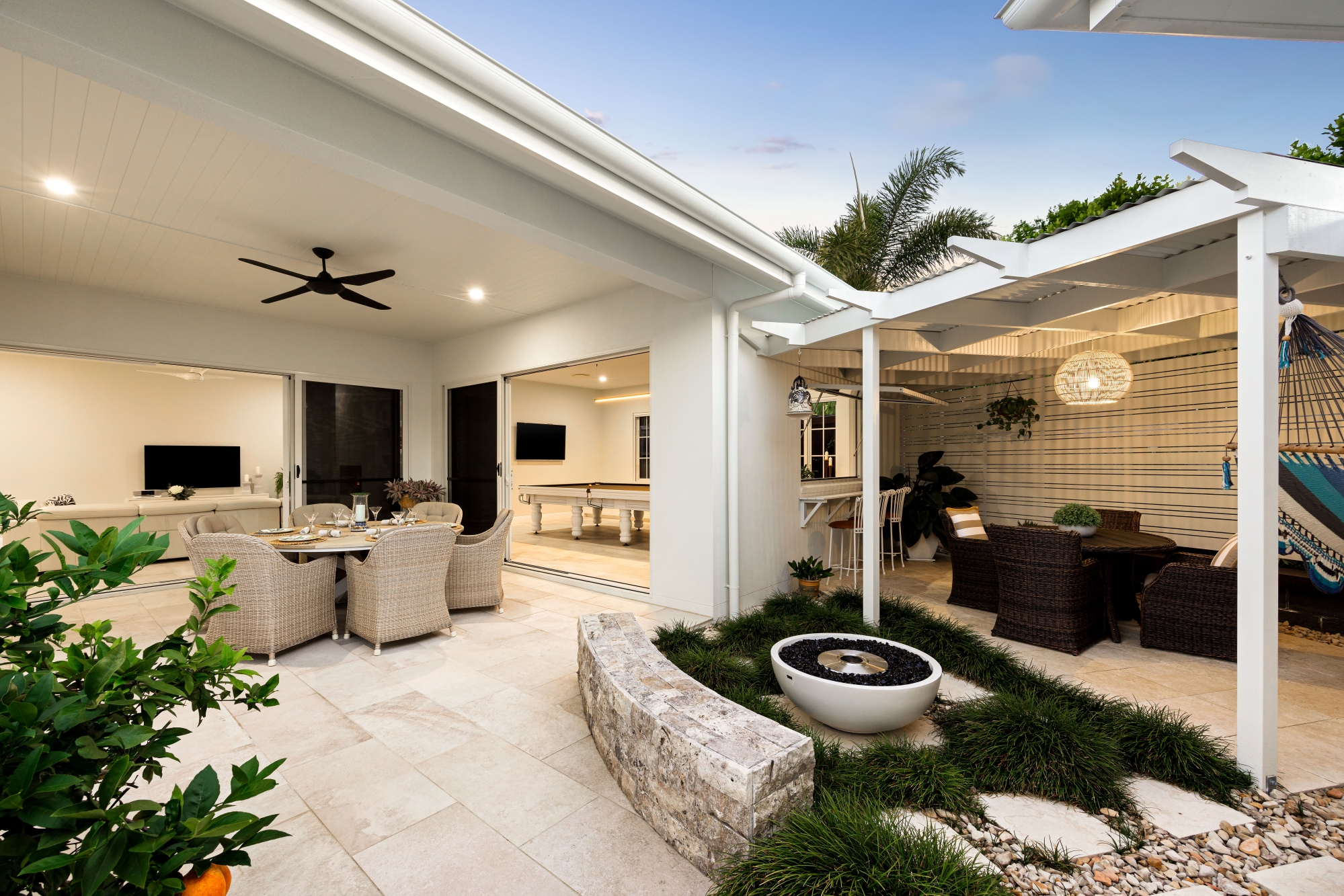 – Two outdoor entertaining zones with fire area, pizza oven, and pool deck