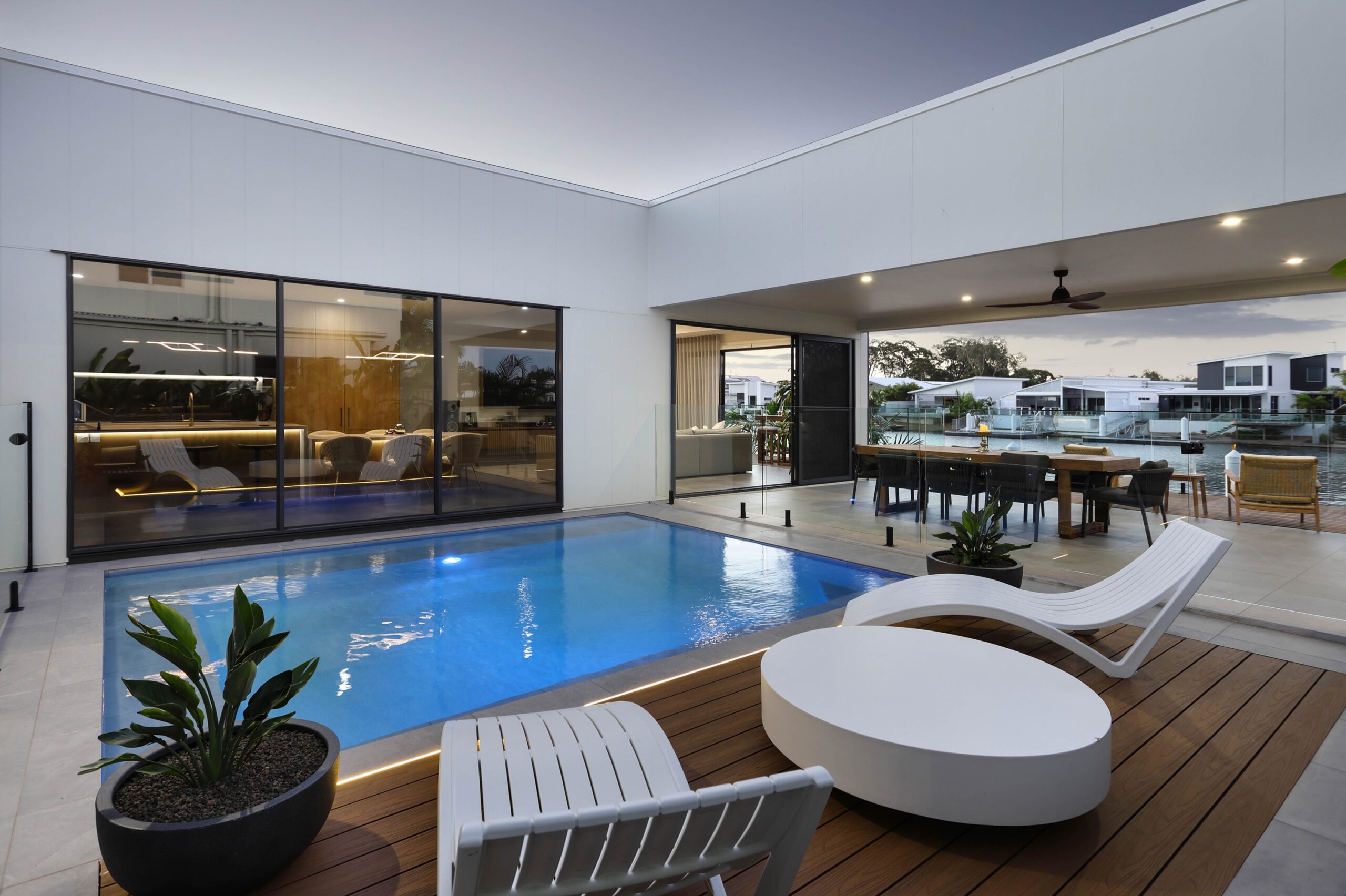 A defining feature of the home is the private internal courtyard, anchored by a custom 5m x 5m pebblecrete pool framed by glass, ambient lighting and clean architectural lines. Full-height glass doors extend the main living areas to the elevated waterfront terrace, where eco-decking, landscaped surrounds and a fully appointed alfresco entertaining zone create a resort-style setting for long lunches, sunset drinks or quiet relaxation by the water.