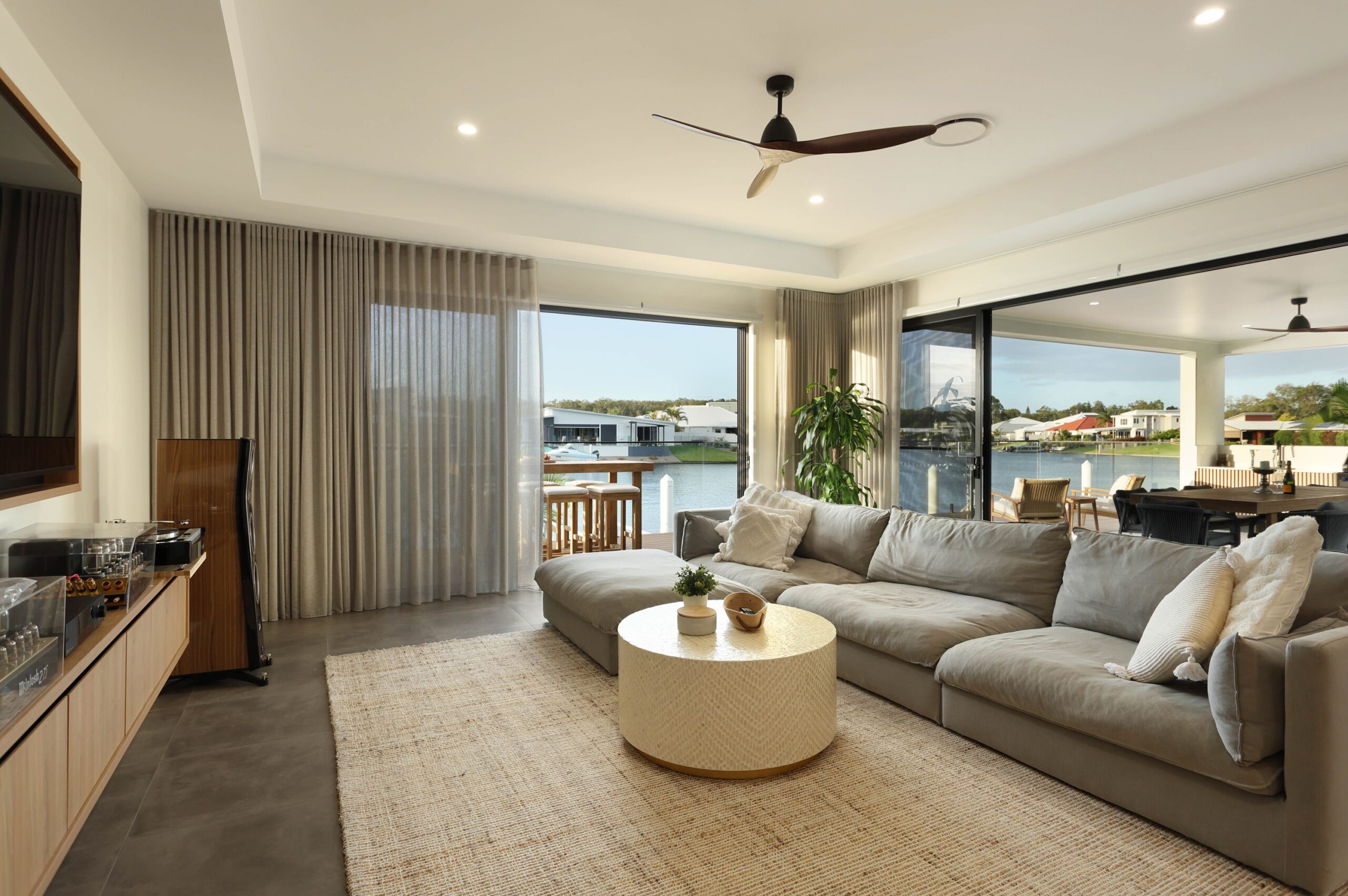 Inside, light-filled interiors reveal expansive open-plan living and dining areas designed to maximise natural light, privacy and connection to the water. The layout flows seamlessly between the main living zones, the private central courtyard and the waterfront entertaining terrace beyond, creating a home equally suited to relaxed family living and elevated entertaining.