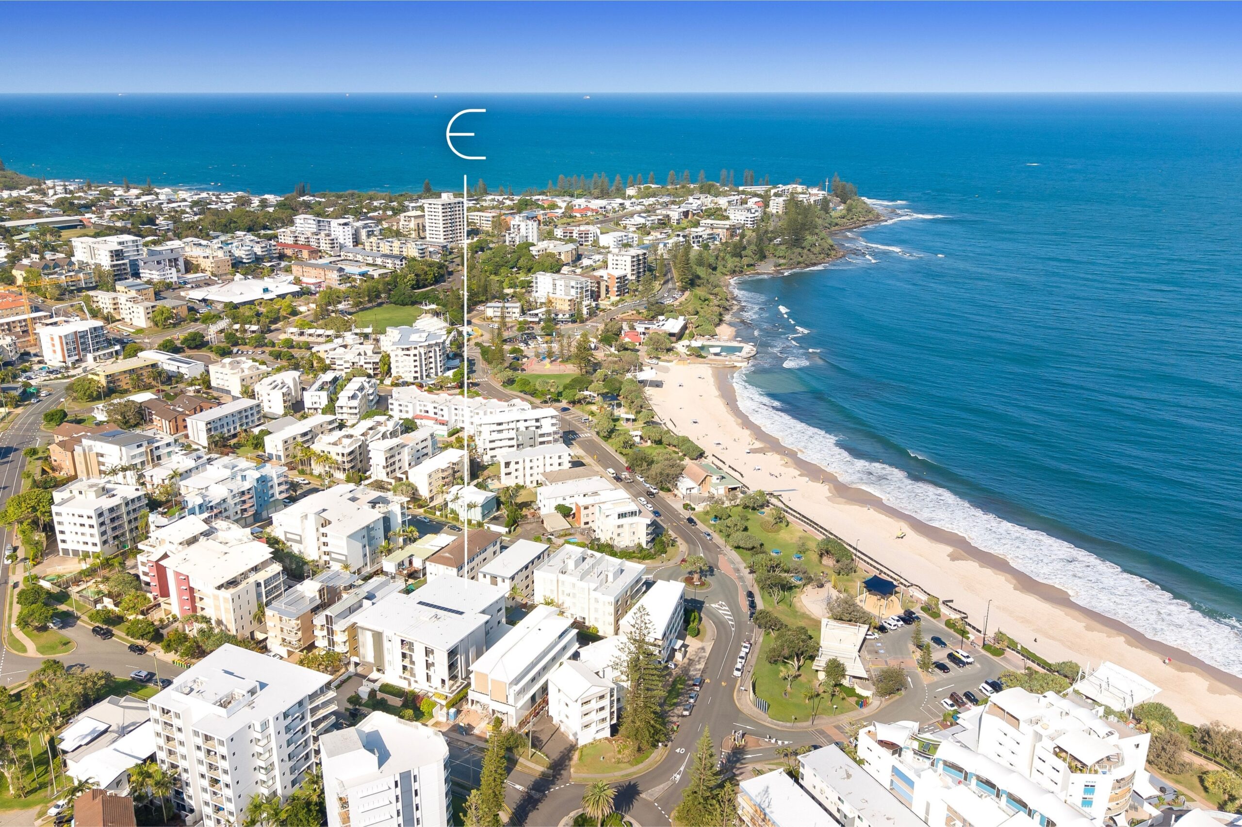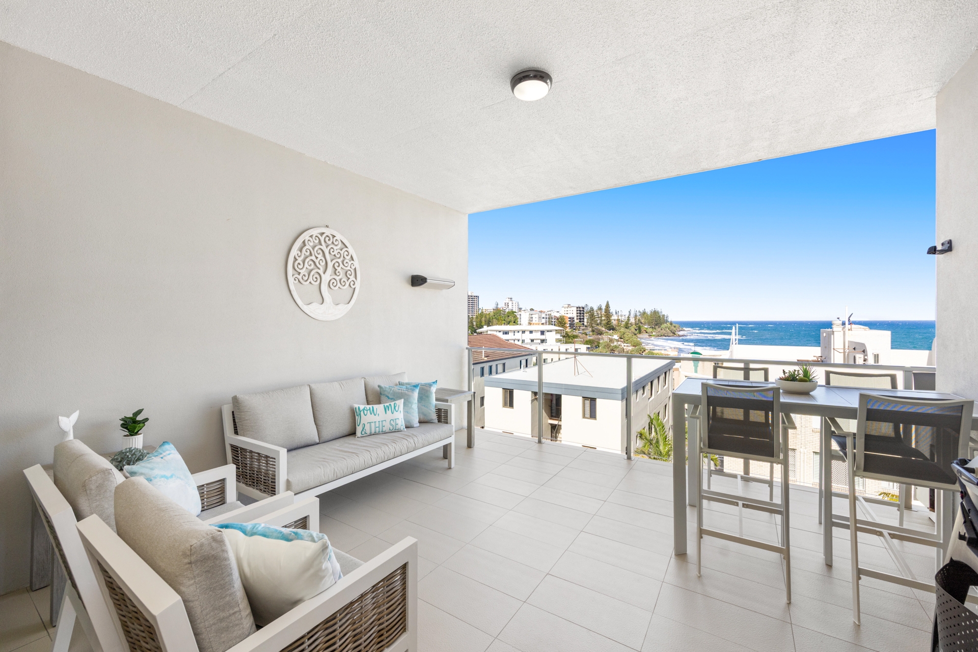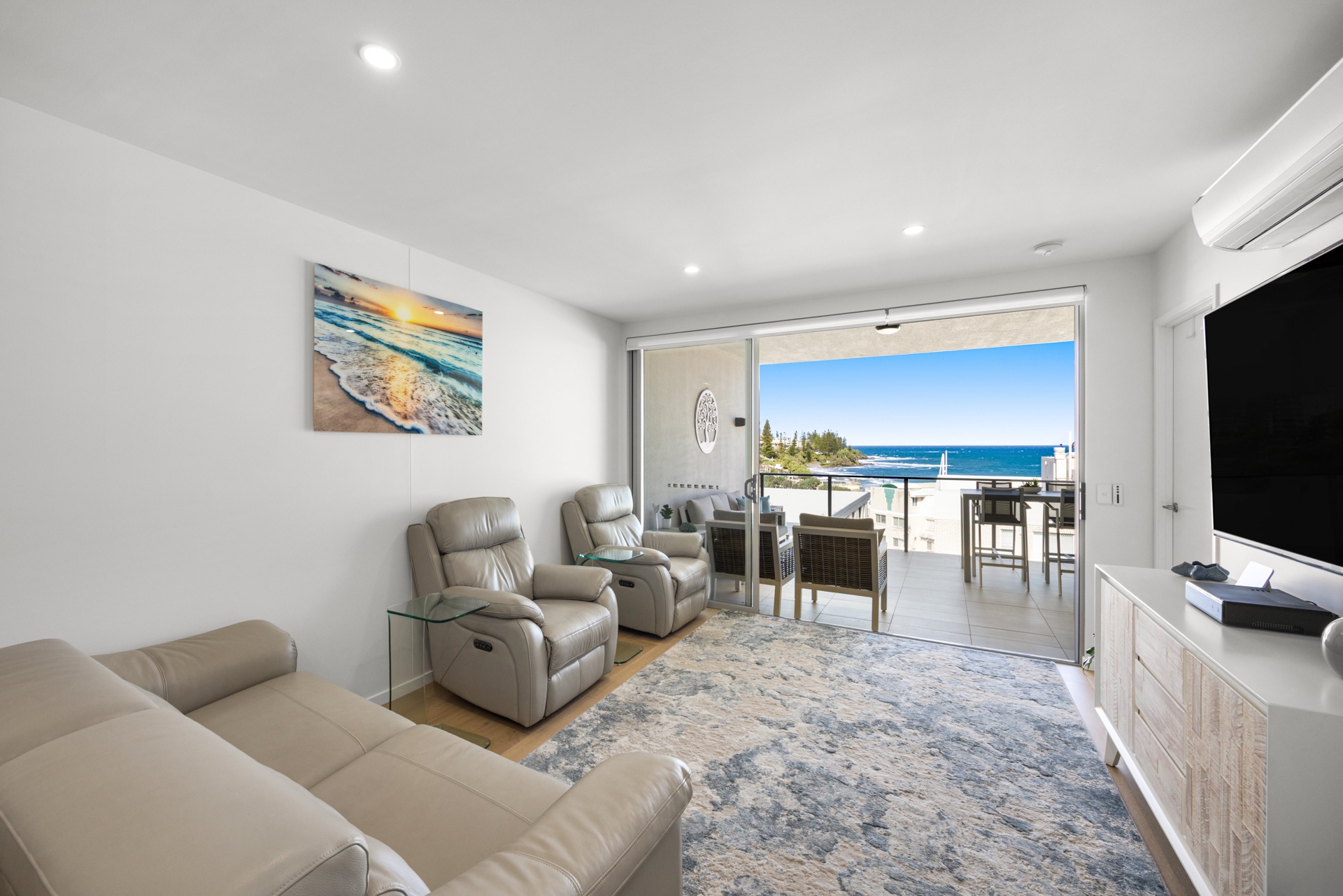 The light-filled open plan living area flows seamlessly onto a spacious balcony, perfect for entertaining or relaxing while enjoying horizon views toward Moreton Island and the Kings Beach ocean pool.