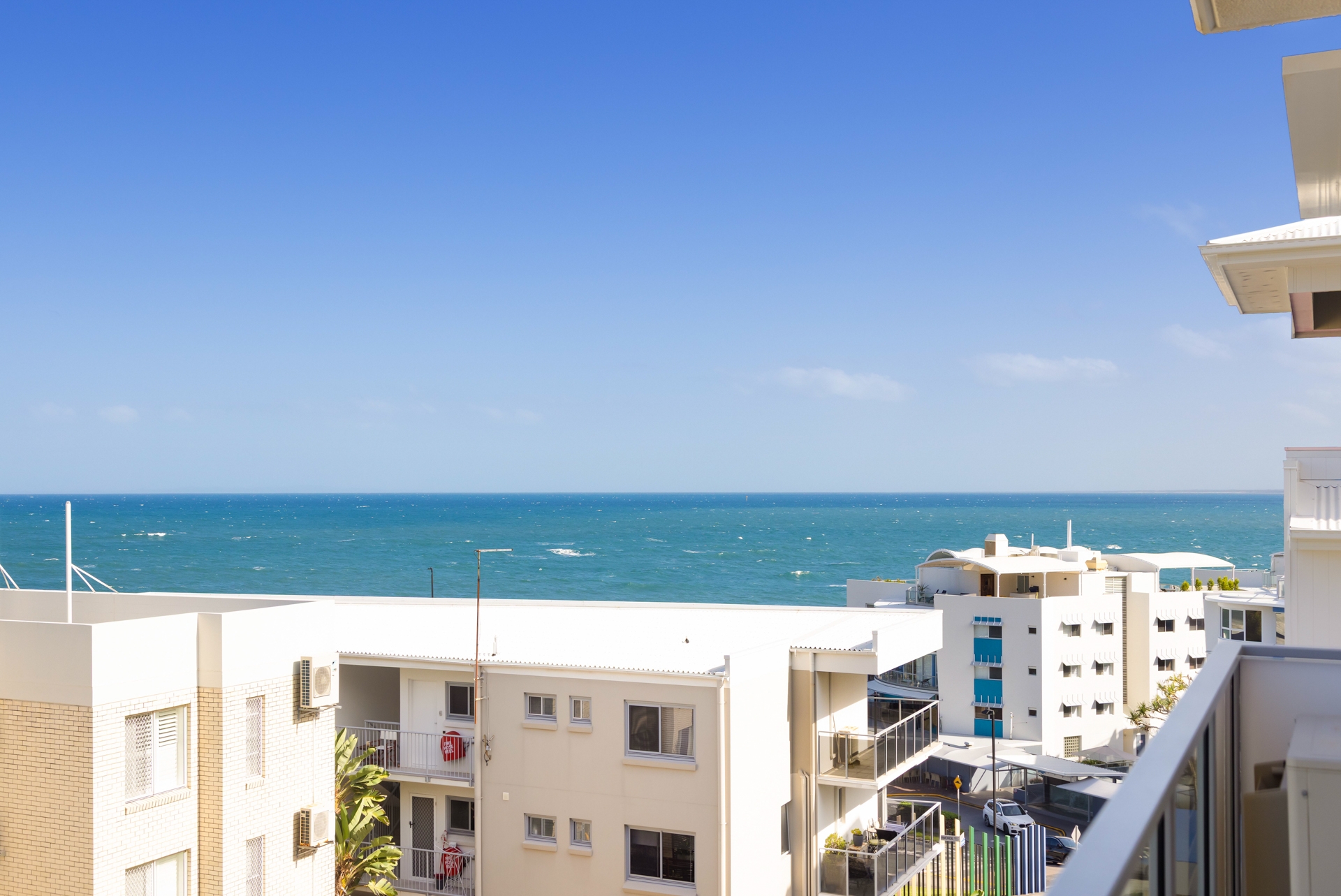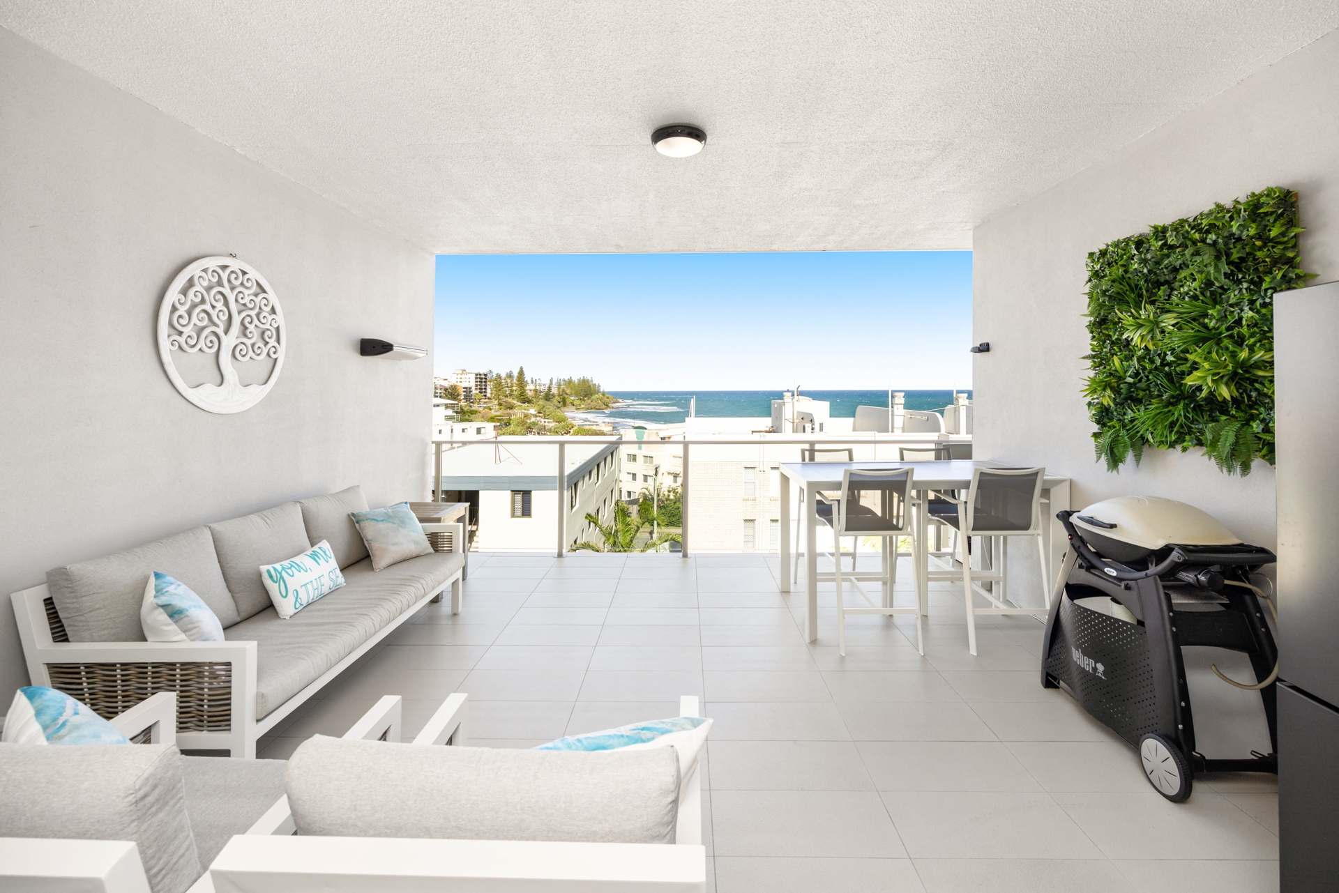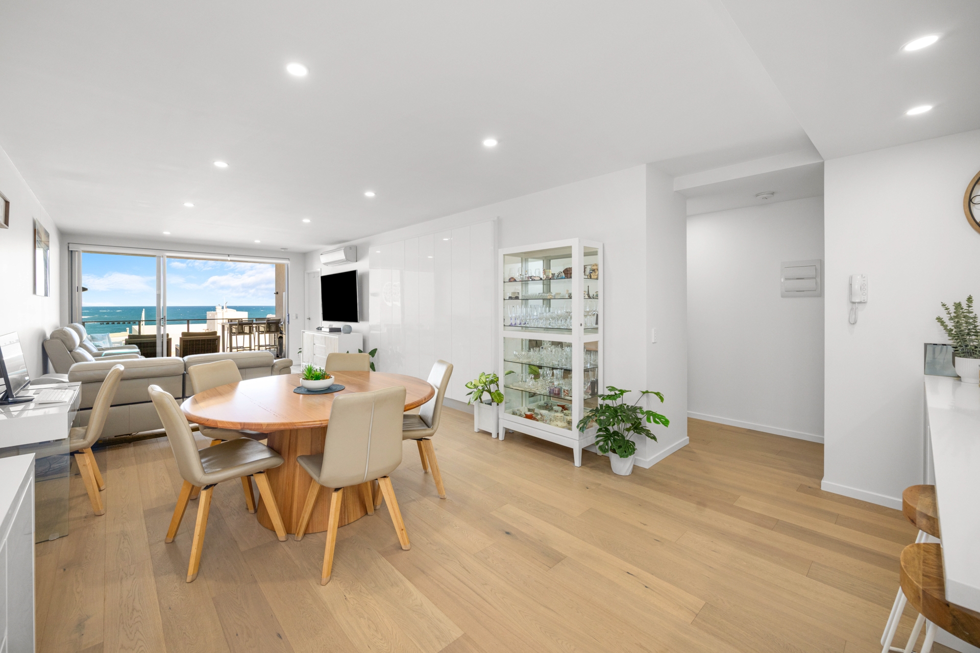The light-filled open plan living area flows seamlessly onto a spacious balcony, perfect for entertaining or relaxing while enjoying horizon views toward Moreton Island and the Kings Beach ocean pool.