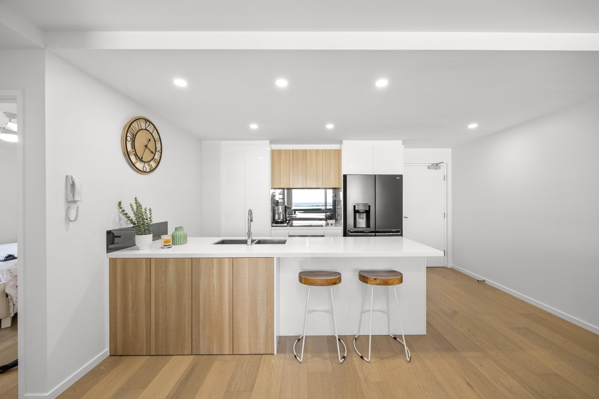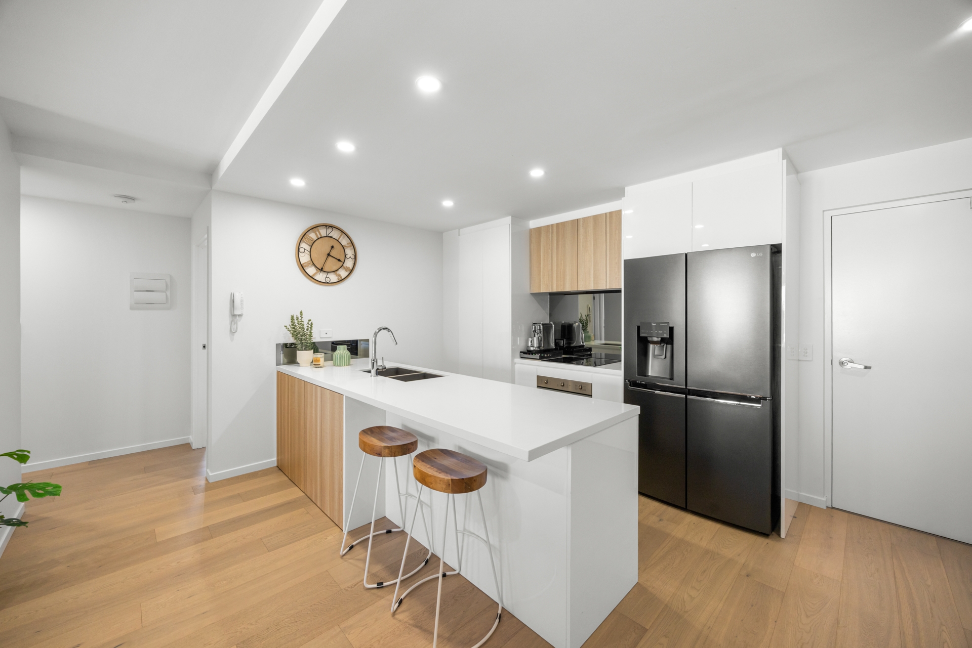 Inside, the modern kitchen is beautifully appointed with quality SMEG appliances, stone benchtops, a breakfast bar, and generous storage. The apartment has been meticulously updated with solid oak hardwood flooring, additional built-in storage and freshly painted interiors.