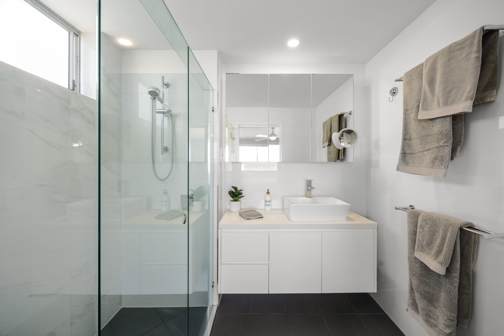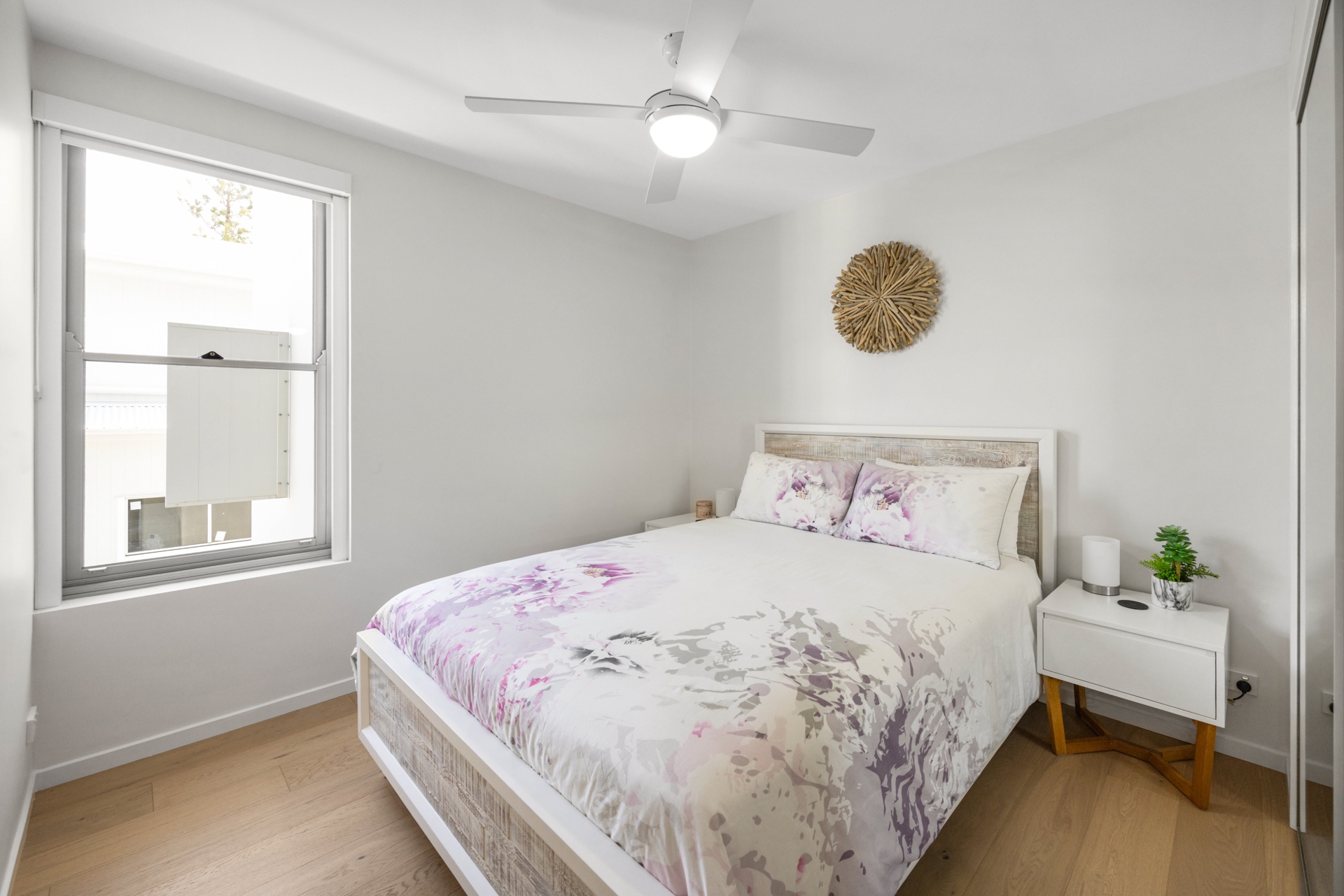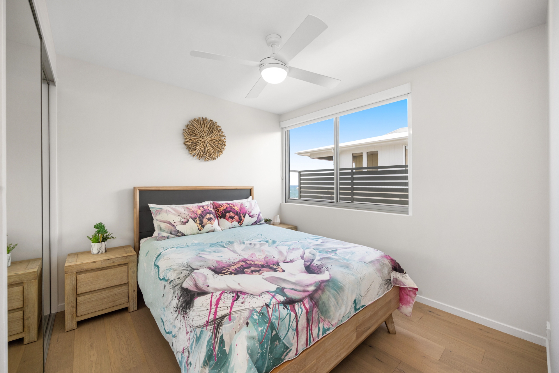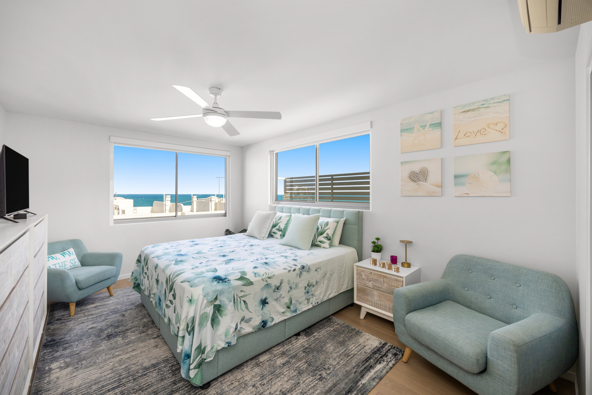 The master suite is a coastal retreat, featuring ocean views, a walk-in robe, ensuite, air conditioning, ceiling fan, and custom automated block-out blinds. Two additional bedrooms with built-in mirrored robes and ceiling fans share the main bathroom.
