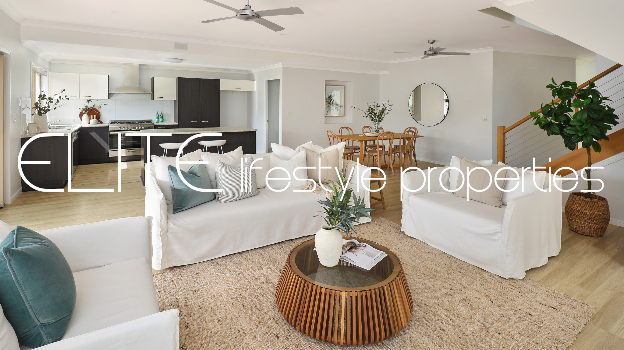 This contemporary built home offers relaxed family-friendly living, high ceilings, abundant light, and a coastal-inspired palette across two levels.