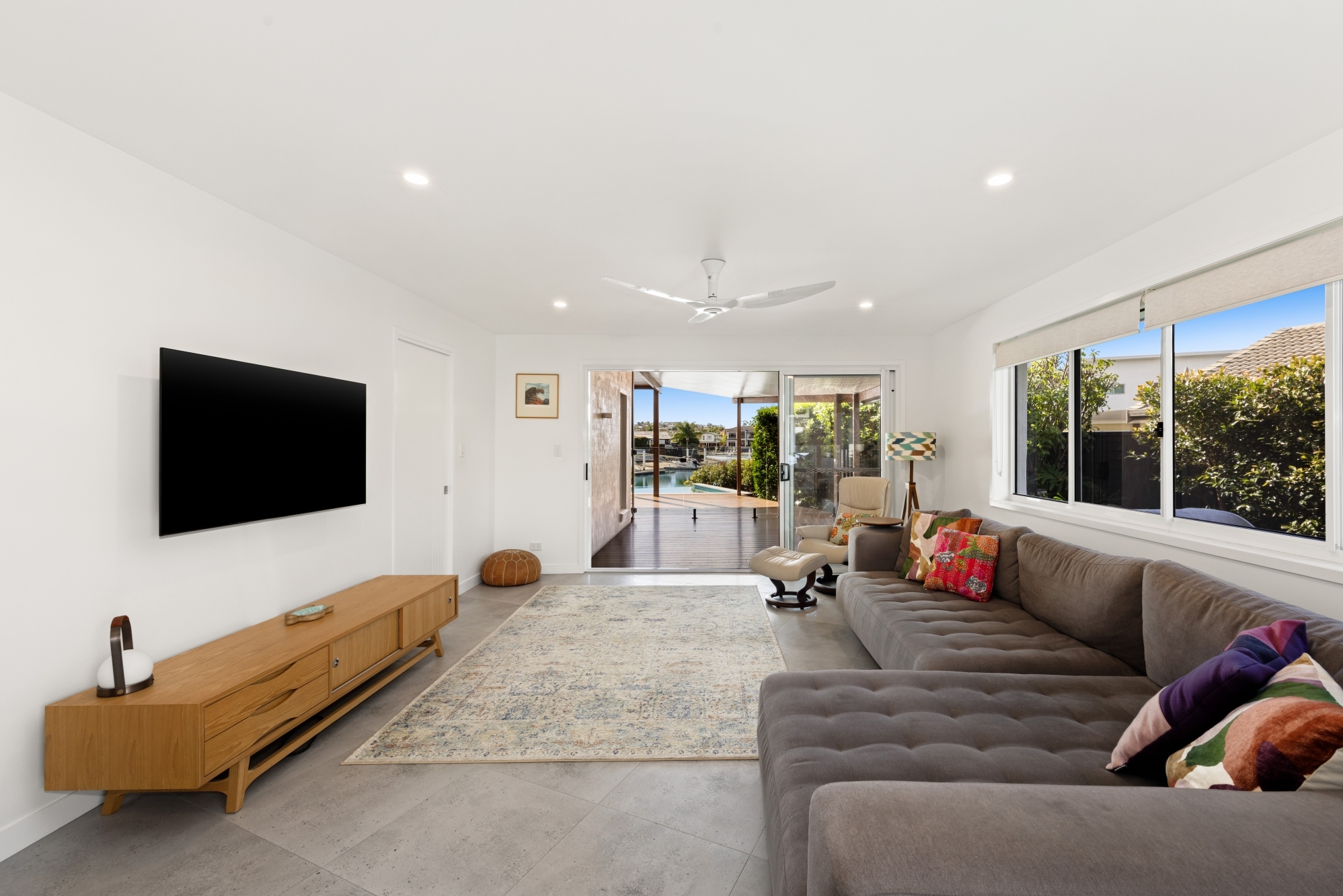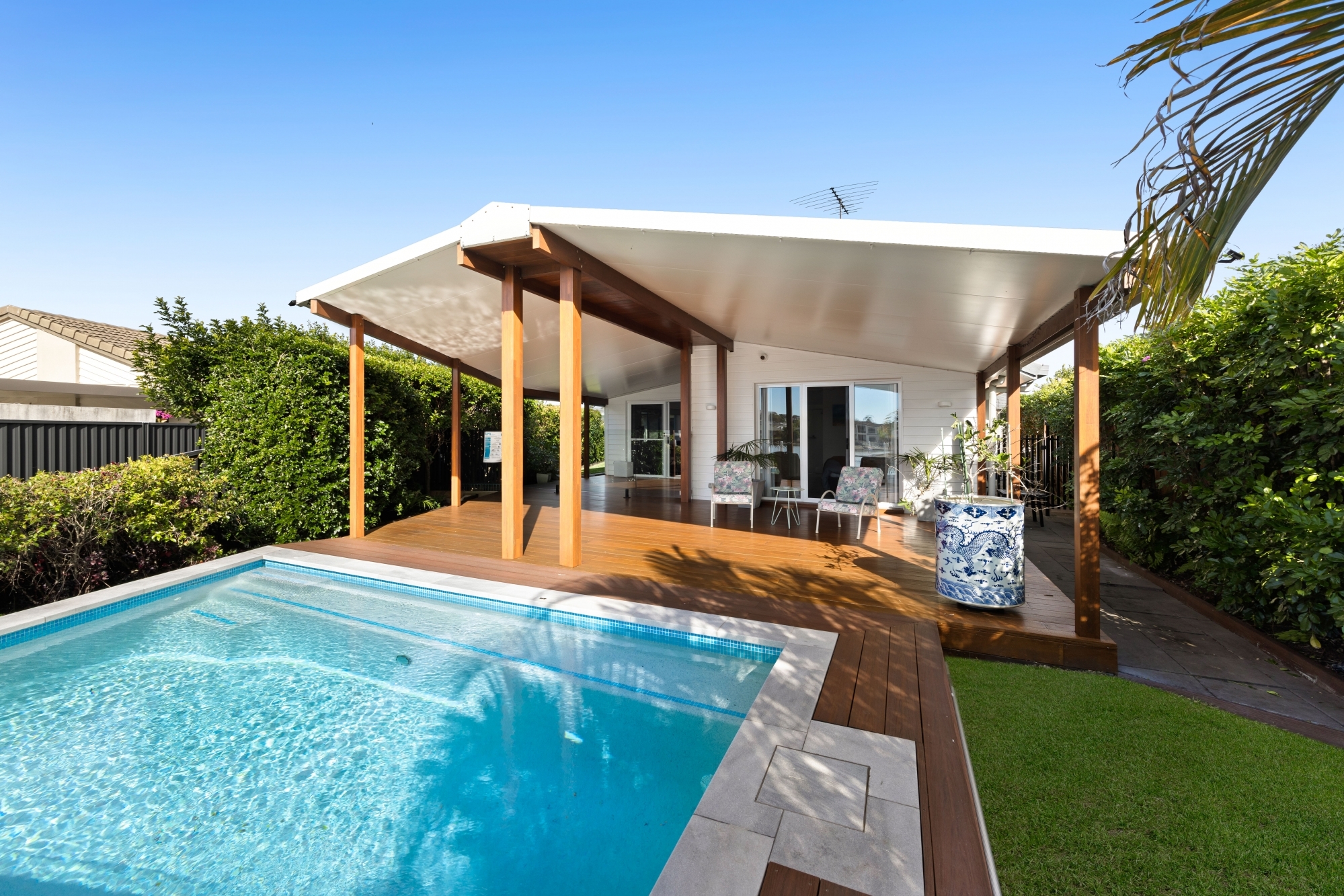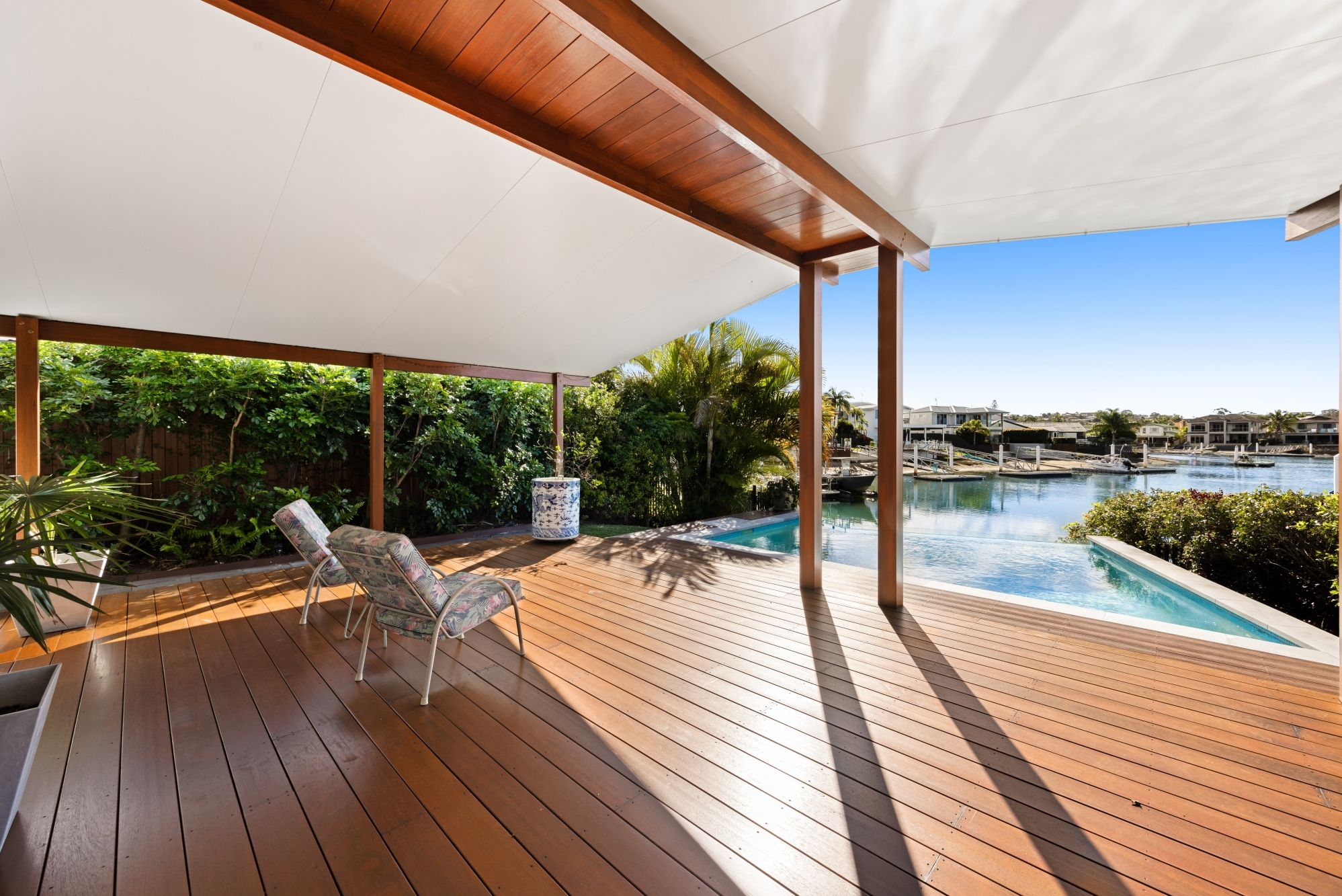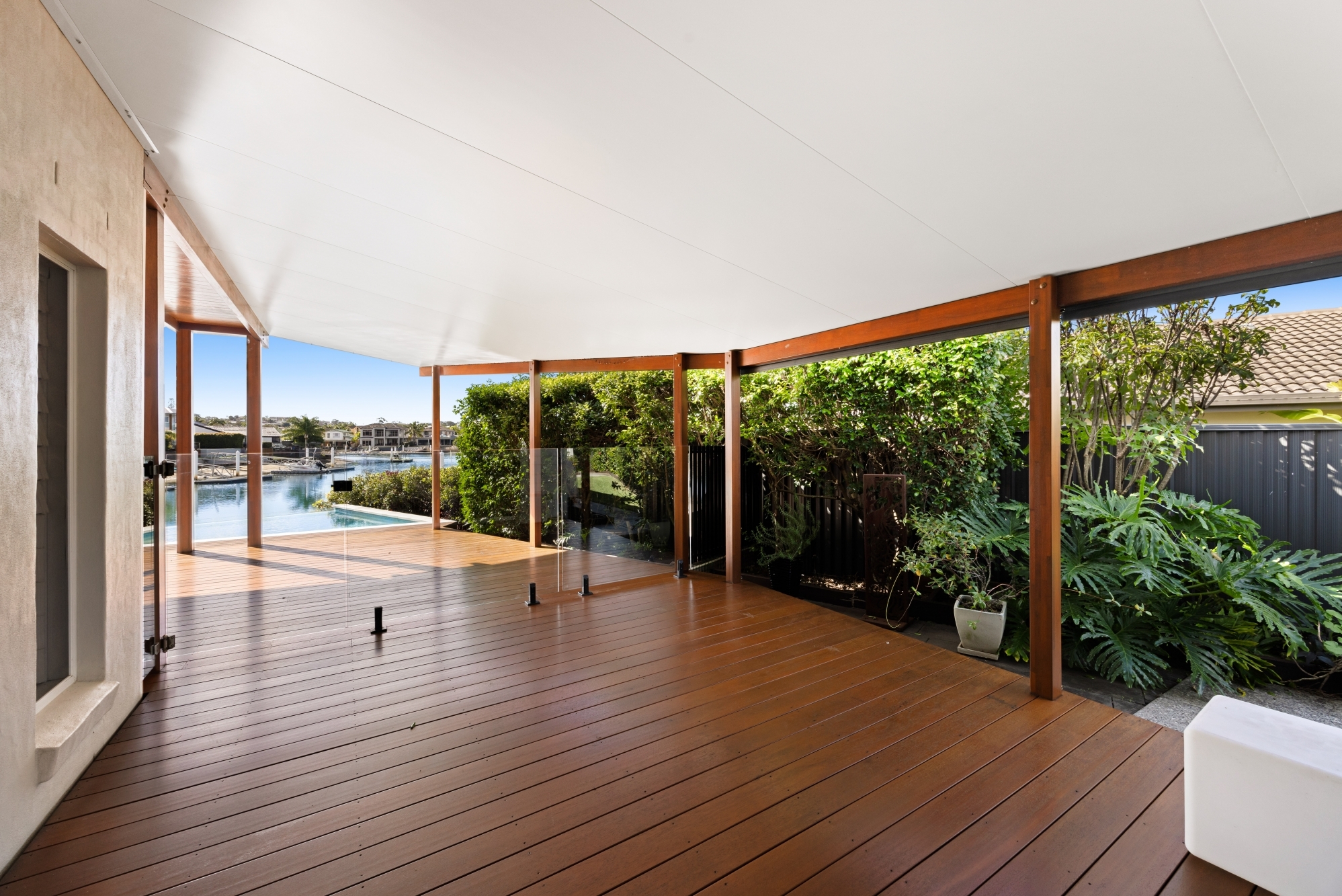 – A well-designed alfresco area, featuring two distinct zones for simultaneous outdoor enjoyment, both taking in the pristine waterway.