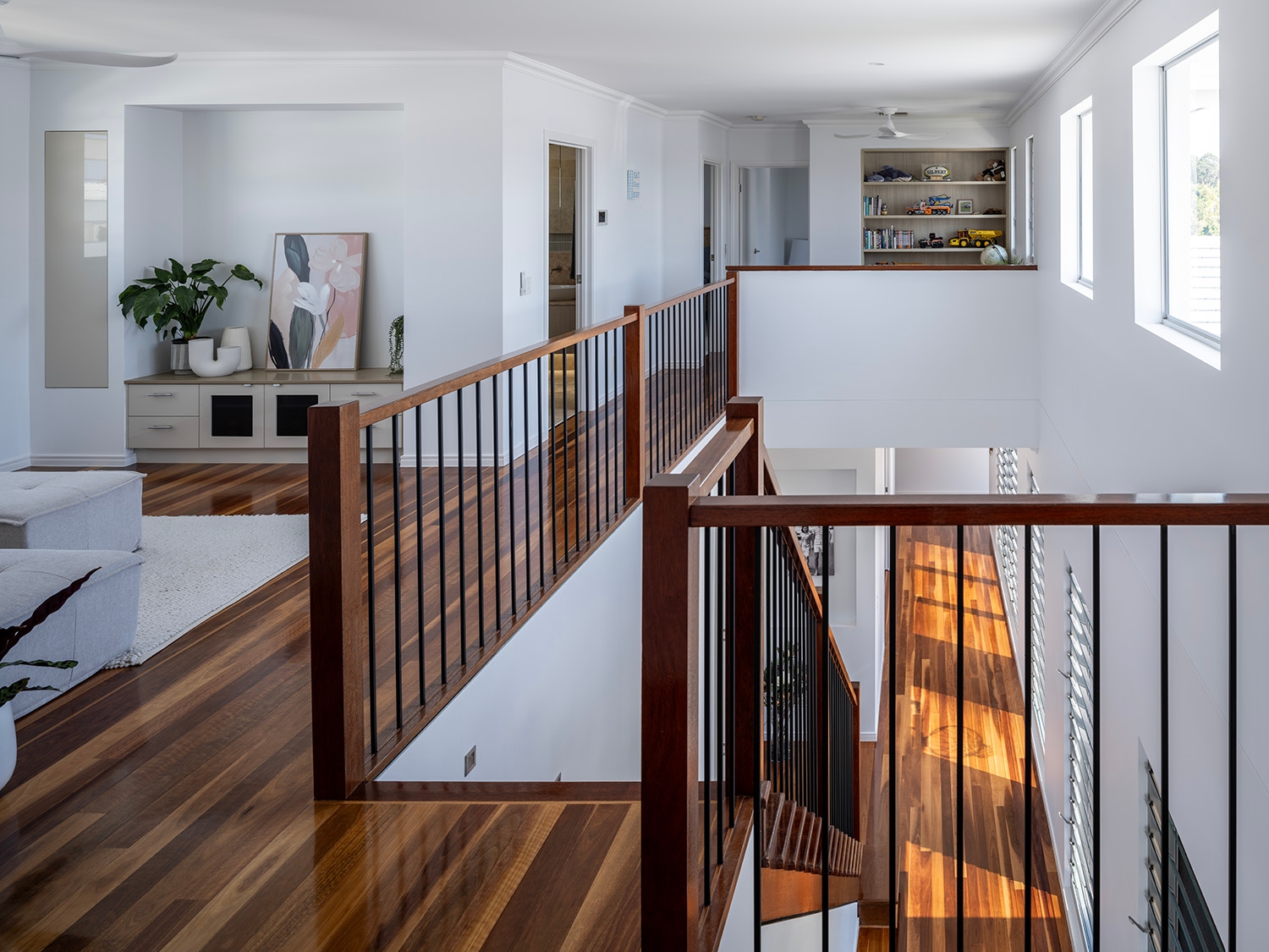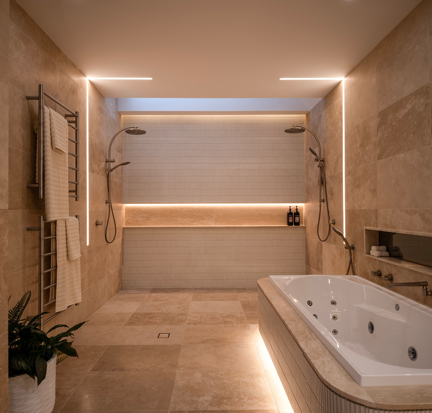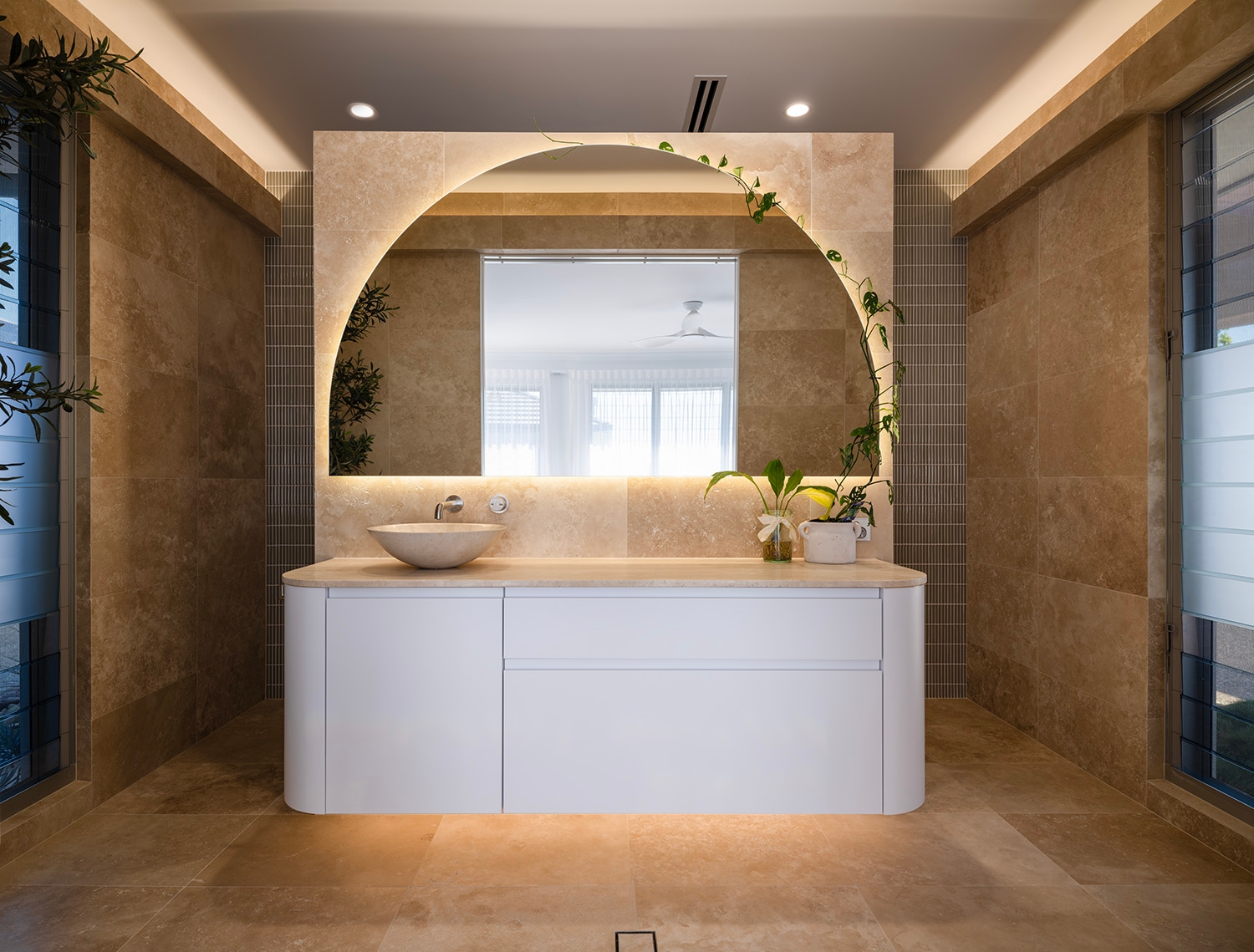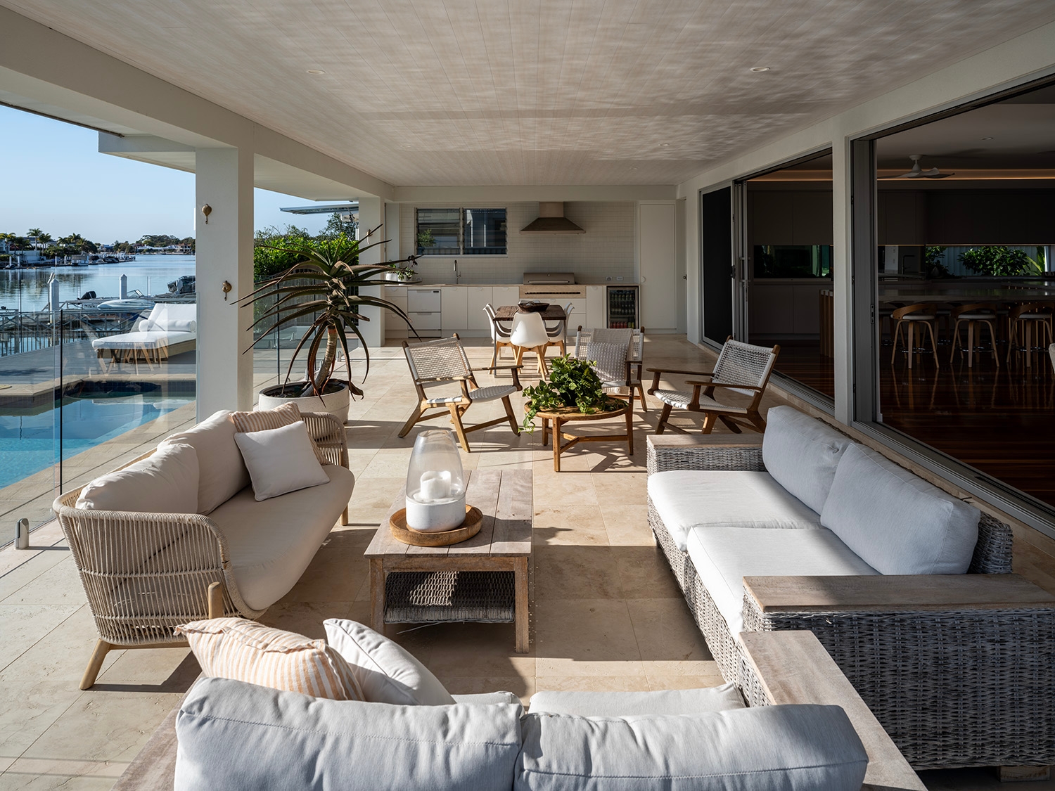 Every element has been curated with uncompromising attention to detail. Honed Quartzite benchtops from Verona Stone, custom cabinetry, Travertine stonework flowing seamlessly between indoor and outdoor spaces and high‑gloss Blackbutt flooring elevates the home’s refined coastal aesthetic.