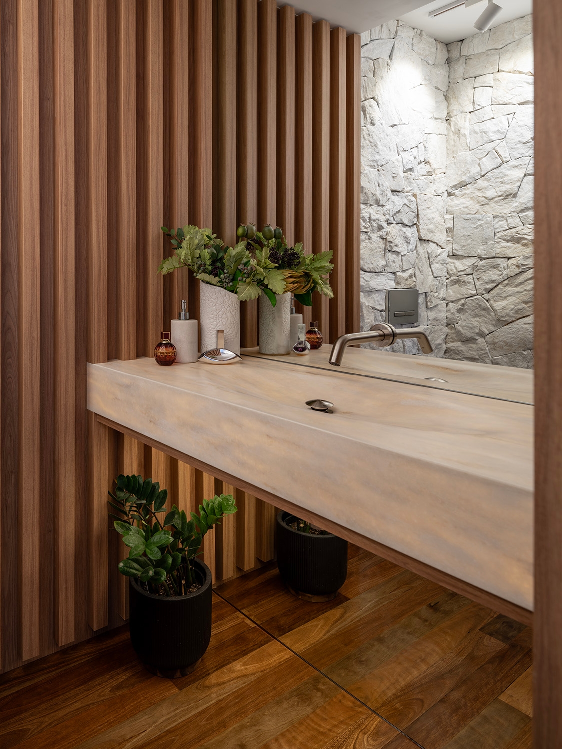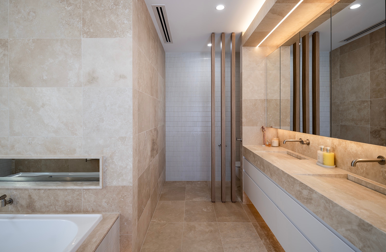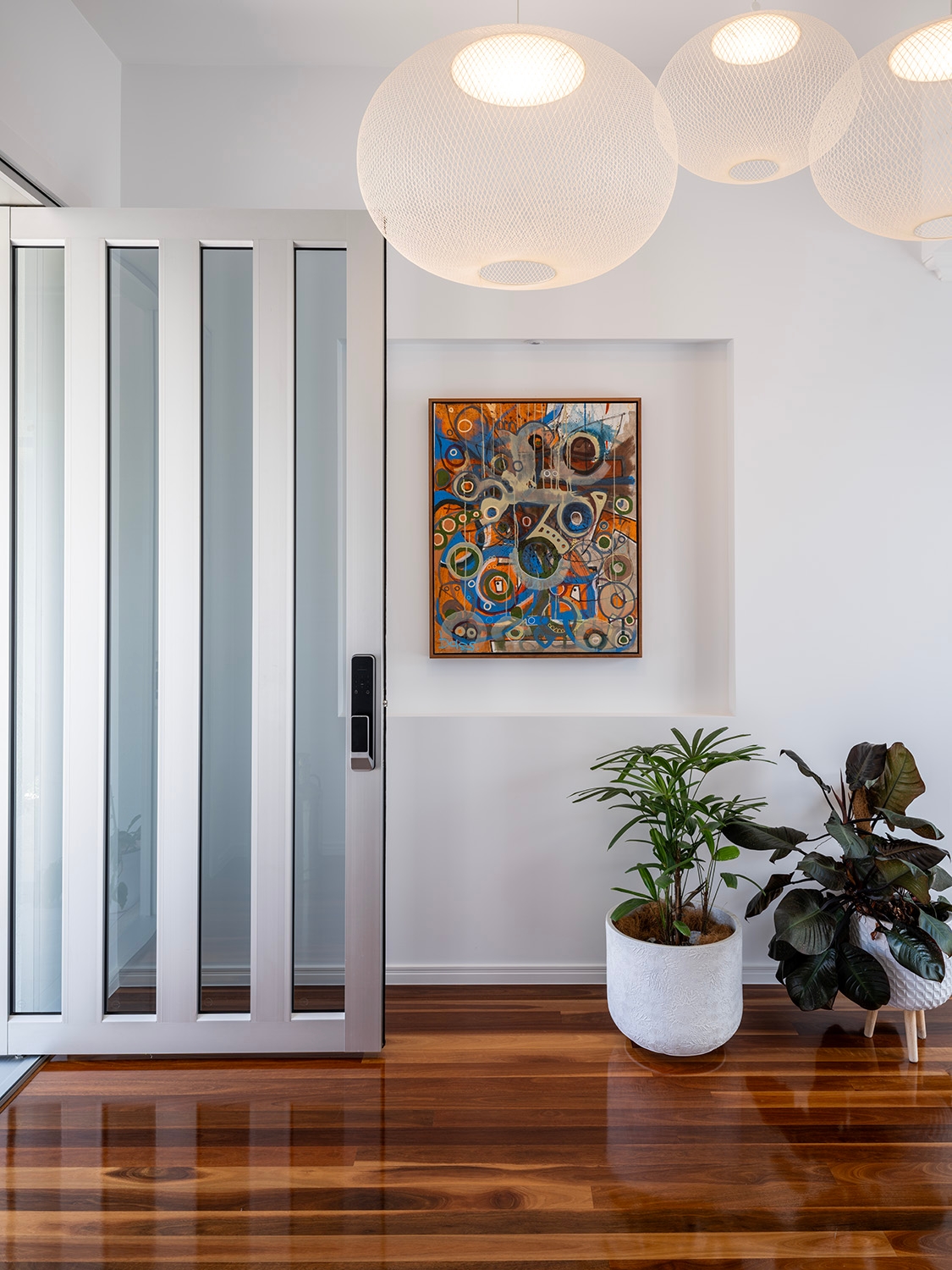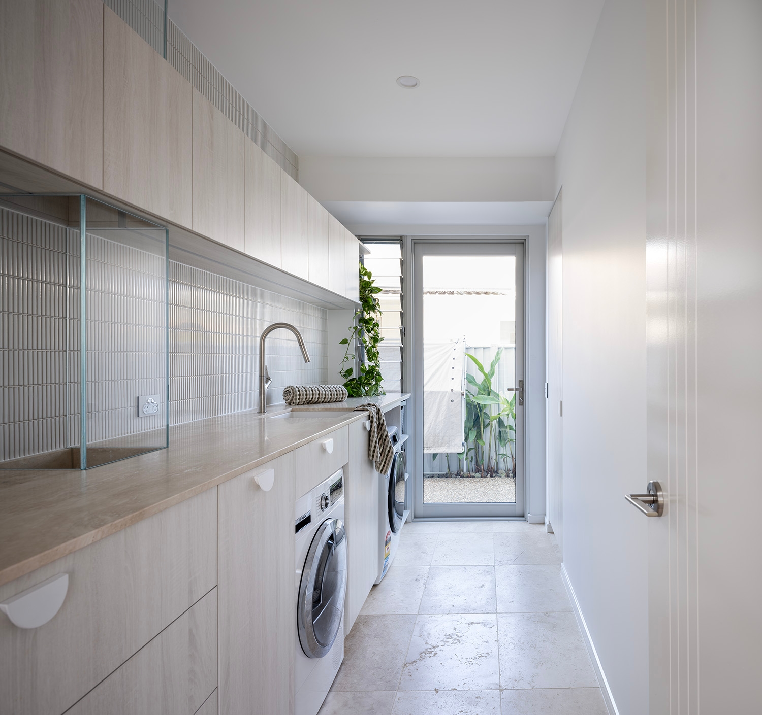 Every element has been curated with uncompromising attention to detail. Honed Quartzite benchtops from Verona Stone, custom cabinetry, Travertine stonework flowing seamlessly between indoor and outdoor spaces and high‑gloss Blackbutt flooring elevates the home’s refined coastal aesthetic.