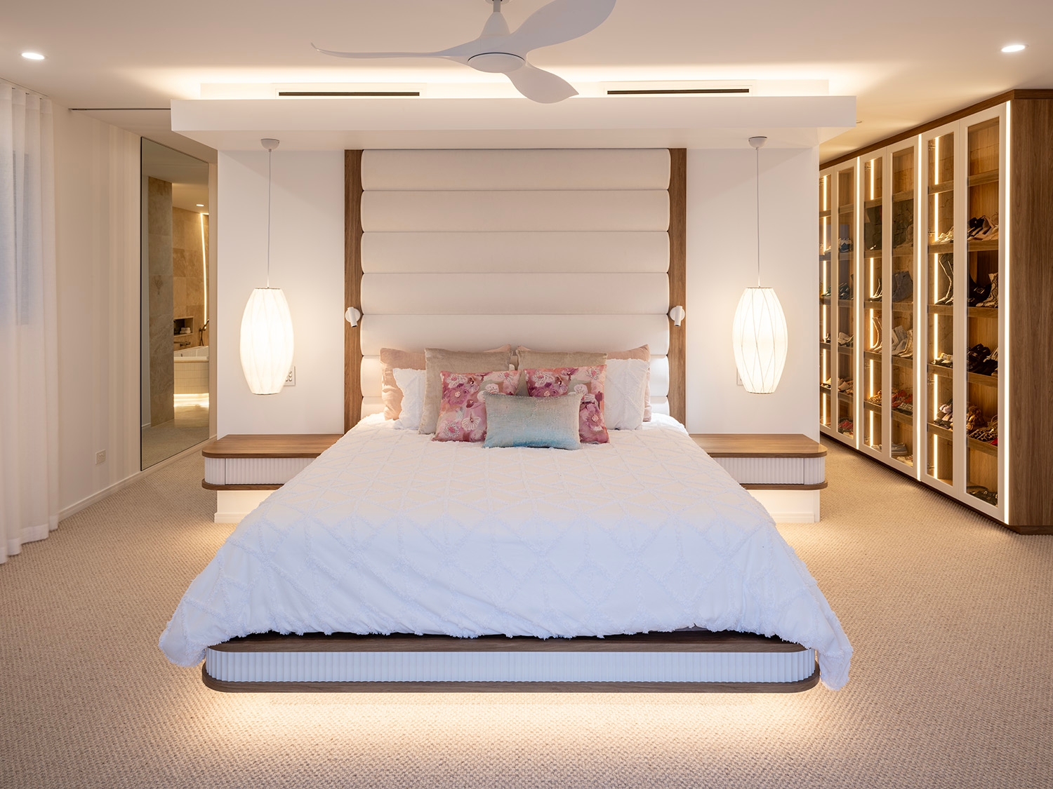 – Fully automated master suite featuring a floating bed, integrated bedside tables, custom walk‑in robe and a dedicated illuminated shoe gallery