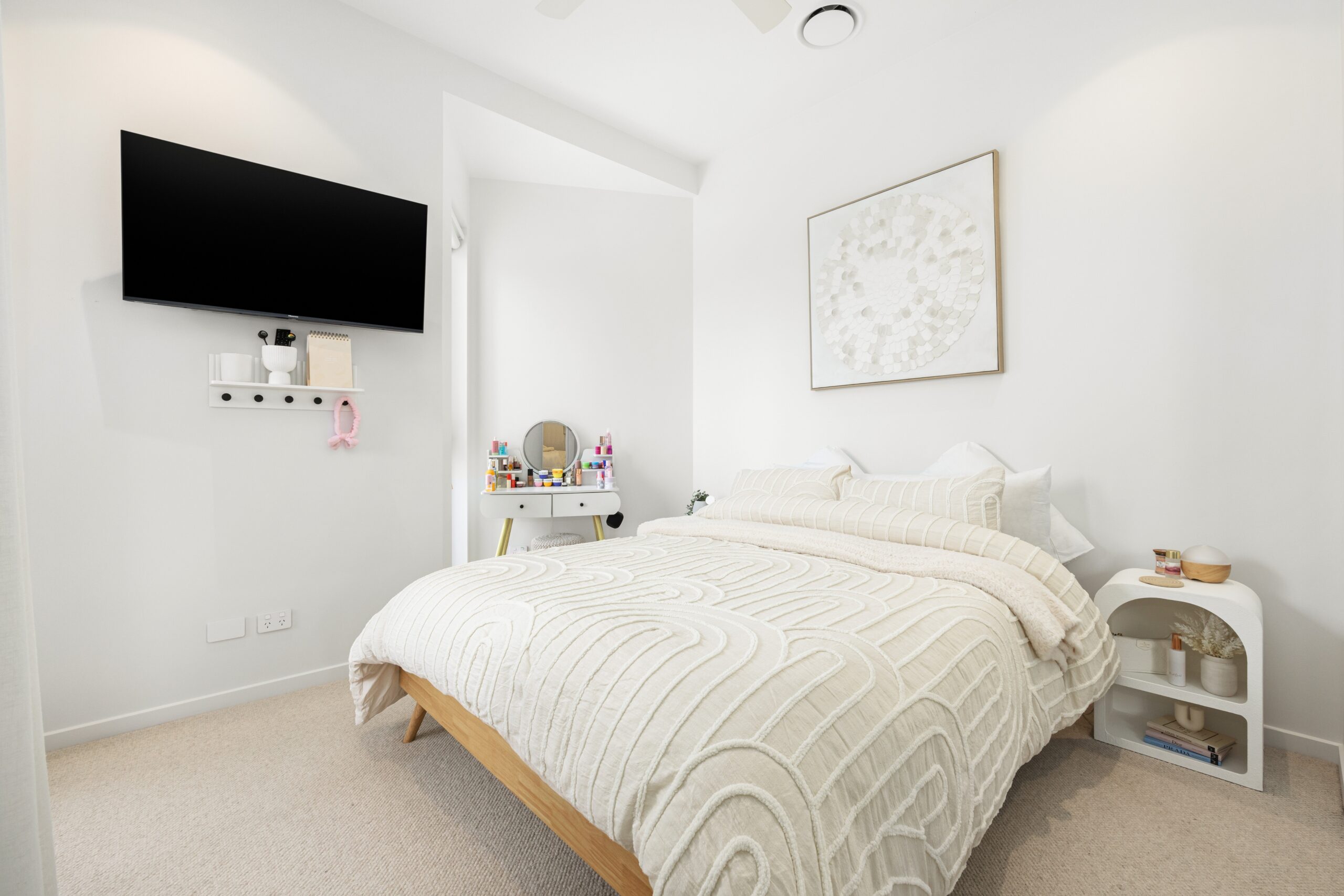 Upstairs, the master suite exudes a sense of calm, complete with a walk-in robe, elegant ensuite, and private balcony capturing the sea breeze. Two additional double bedrooms each include built-in robes and access to a central family bathroom, while the upstairs lounge opens onto a second balcony, creating a perfect space for relaxation or movie nights.