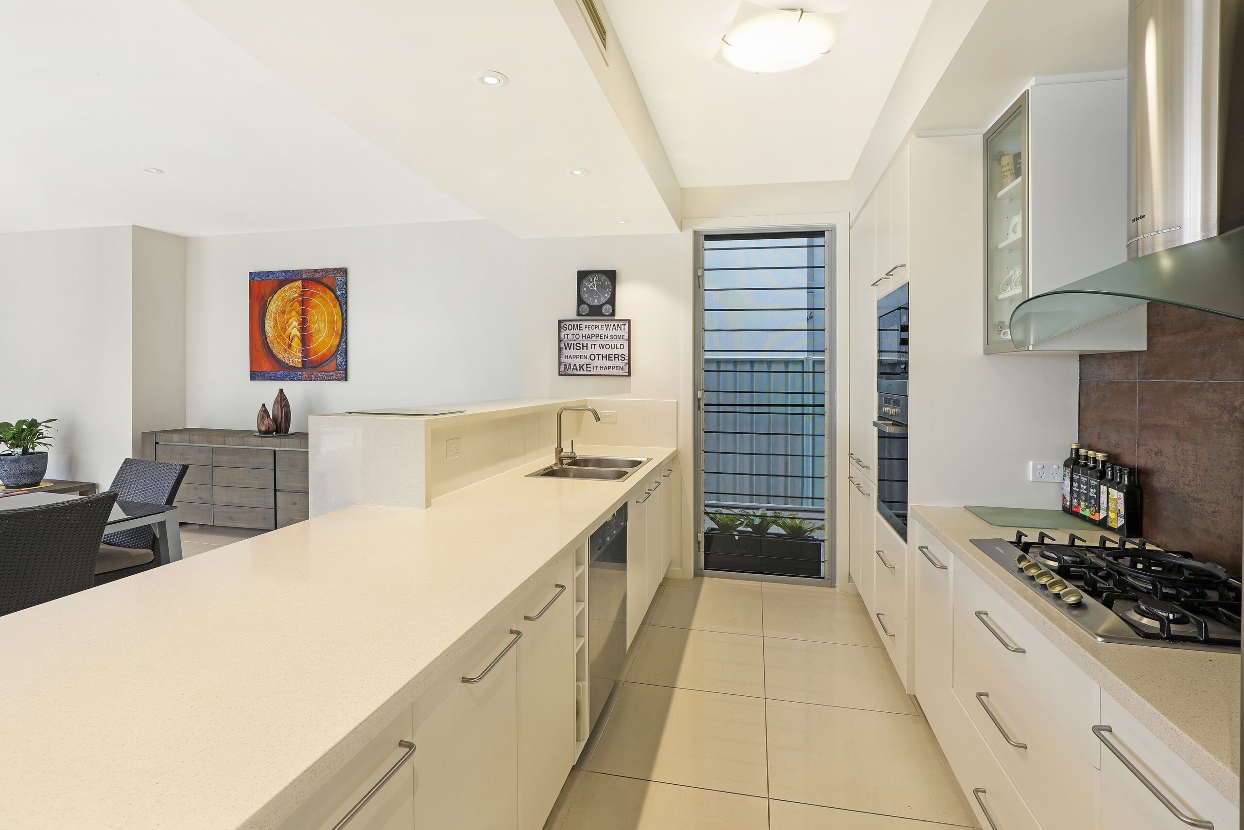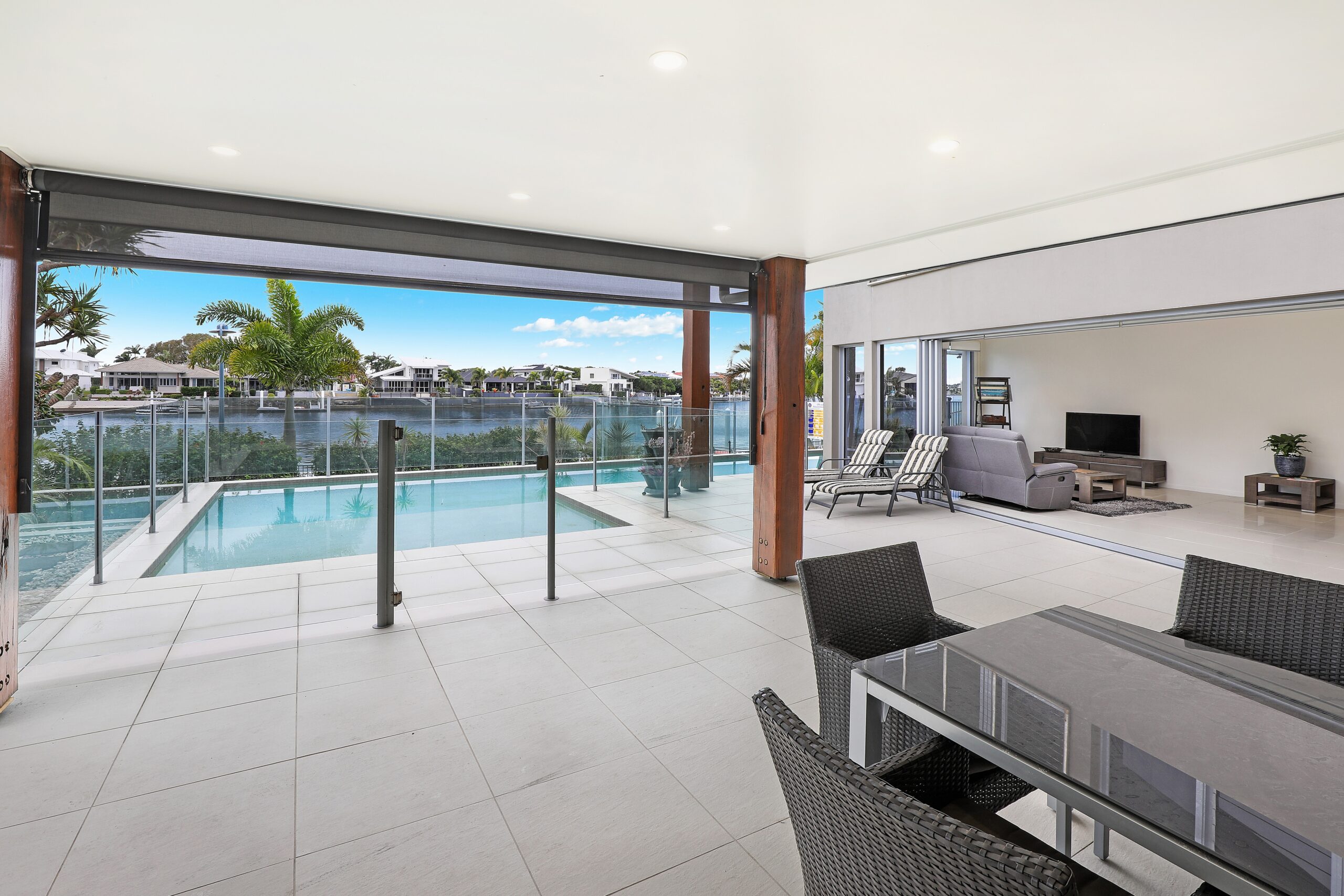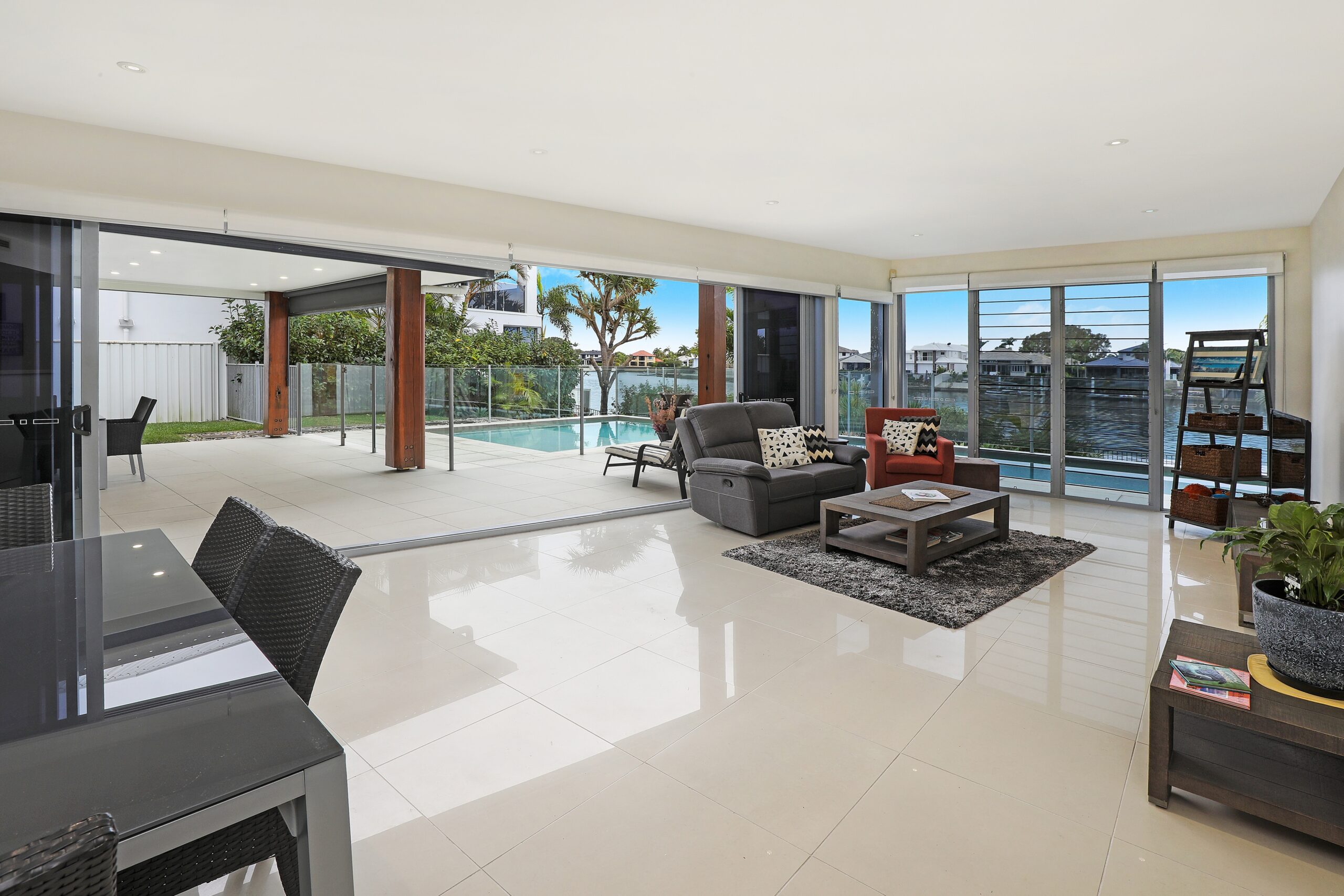 Exceptionally appointed and designed to capture the picturesque water views from the open plan living, dining and kitchen. The gourmet kitchen comes complete with a generous stone benchtop, gas cooktop, abundant storage, it offers an easy connection to the multiple alfresco zones and views to the pool and garden area for full visibility of the surrounds.