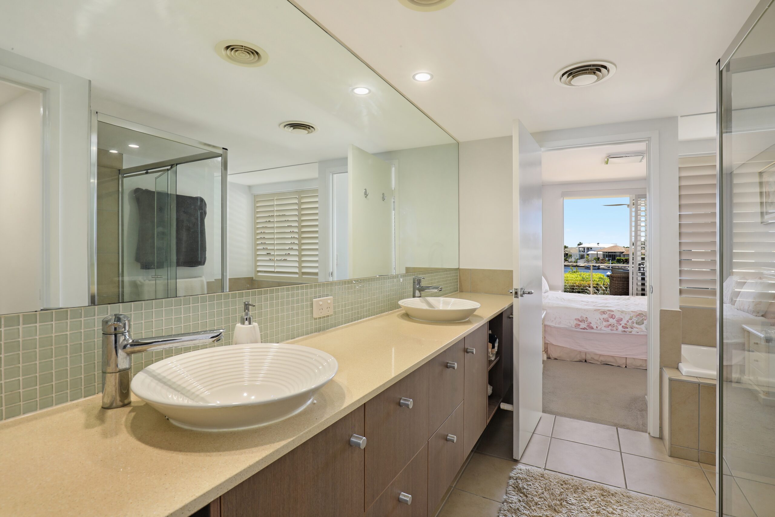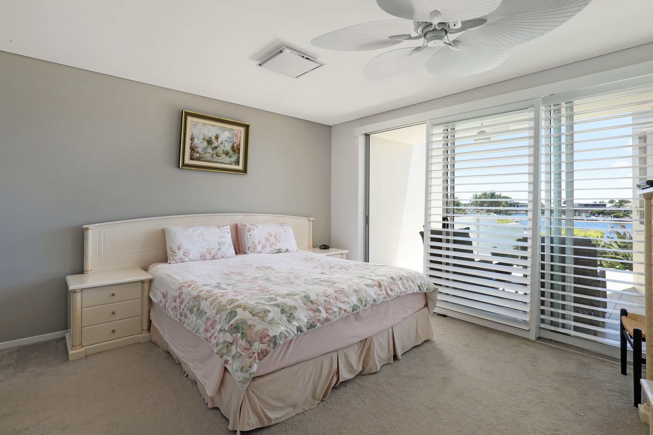 The property boasts three generously sized bedrooms, providing ample space for comfortable living. The master bedroom is a private retreat, featuring an ensuite with bath-spa, and an oversized walk-in robe that offers plenty of storage space. Glass sliding doors open to the terrace allowing for water views and abundant natural light to fill the room. Two spare bedrooms provide versatility and convenience, with a connecting front balcony offering a serene outdoor space.
