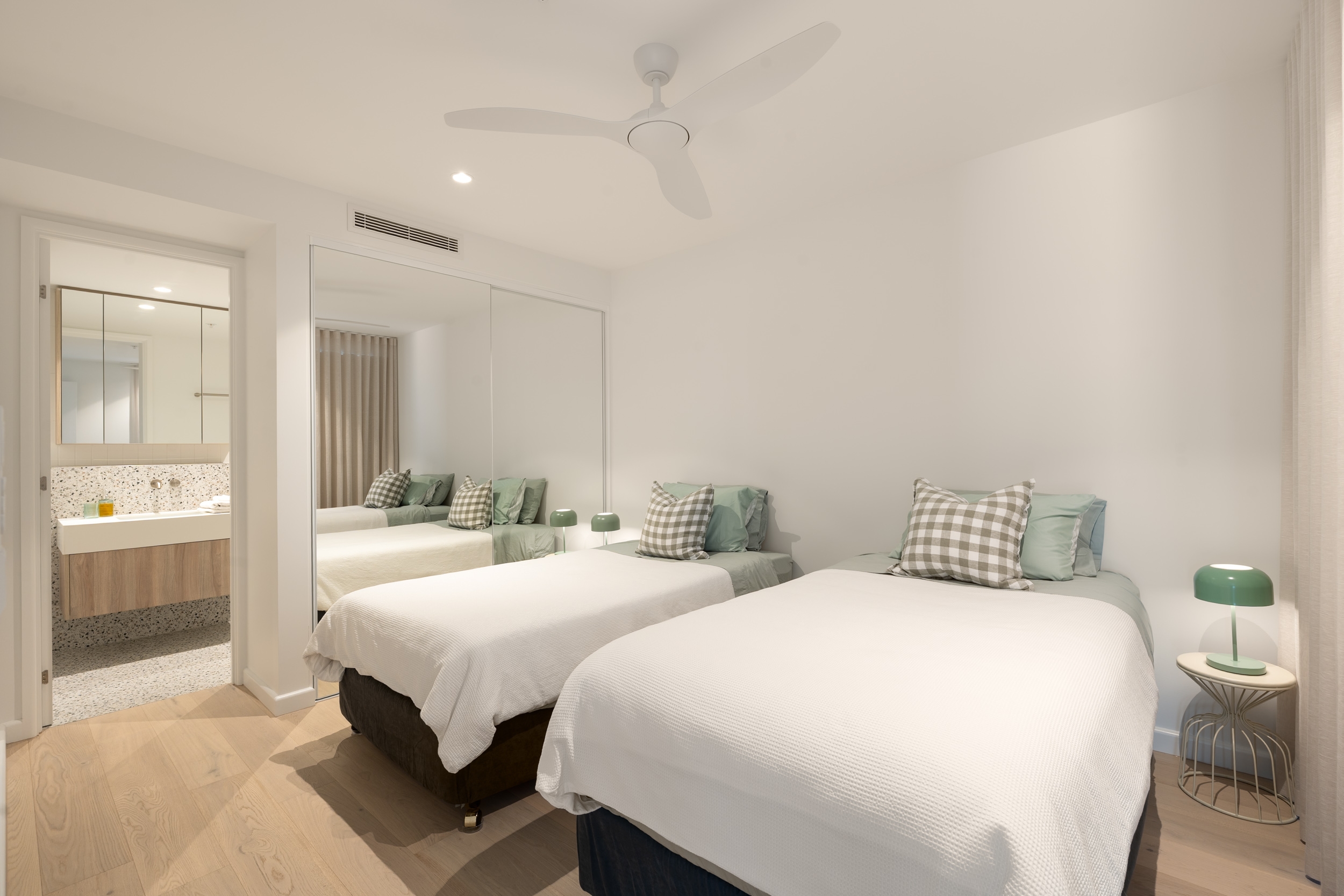 The master suite forms a private retreat with direct balcony access, ocean views, a well-appointed ensuite, featuring a walk-in robe. Three additional bedrooms are positioned for excellent separation and flexibility, each with its own ensuite, built-in robes, complemented by a main bathroom featuring a bath and rain shower, along with a separate powder room toilet for guests. Refined finishes and soft neutral tones run throughout, creating a timeless and understated coastal aesthetic.