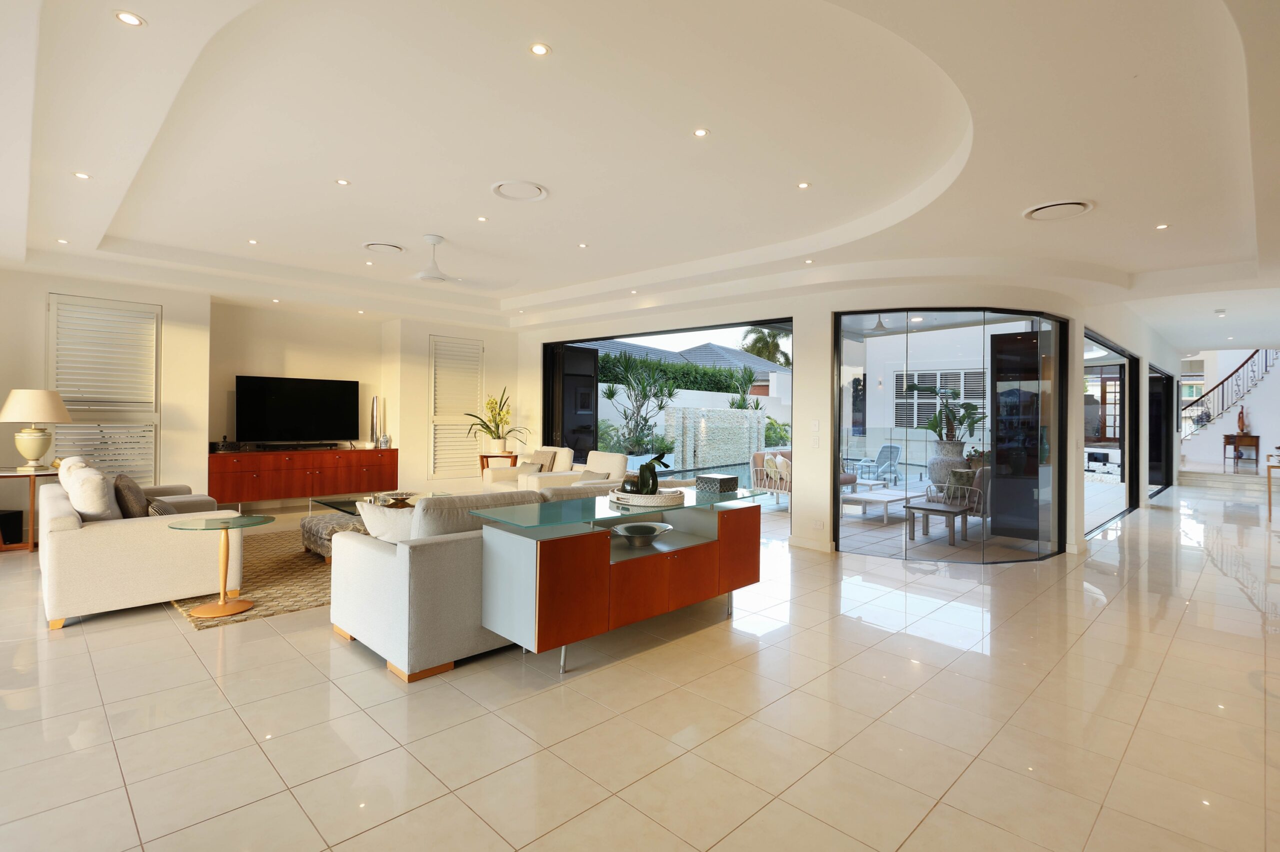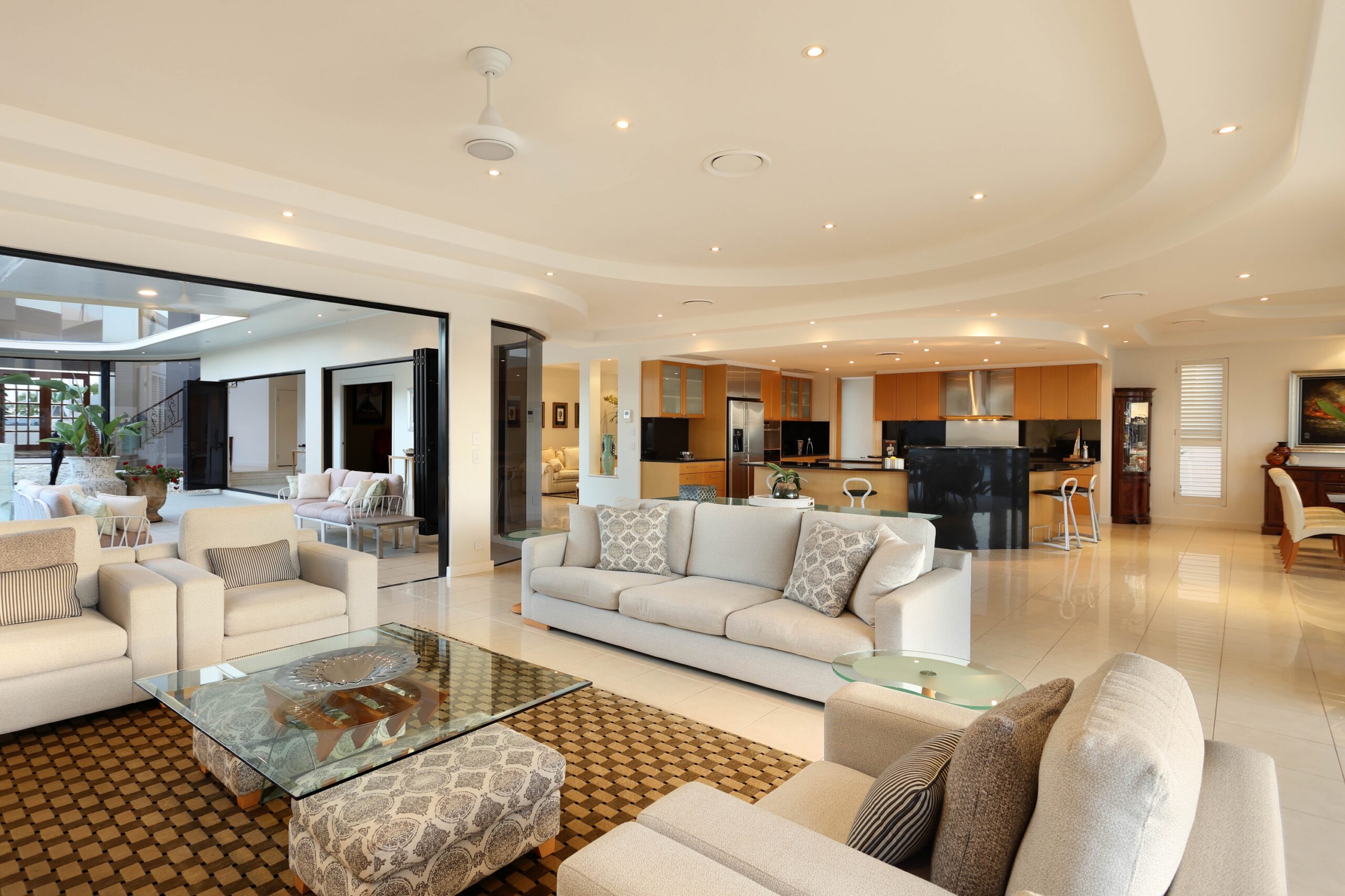 The lower level is dedicated to living and entertaining, with multiple zones designed for both formal occasions and relaxed everyday living. Five sets of bi-fold doors and curved glass walls open seamlessly to the central alfresco and pool area, allowing the home to function as a true indoor–outdoor retreat.