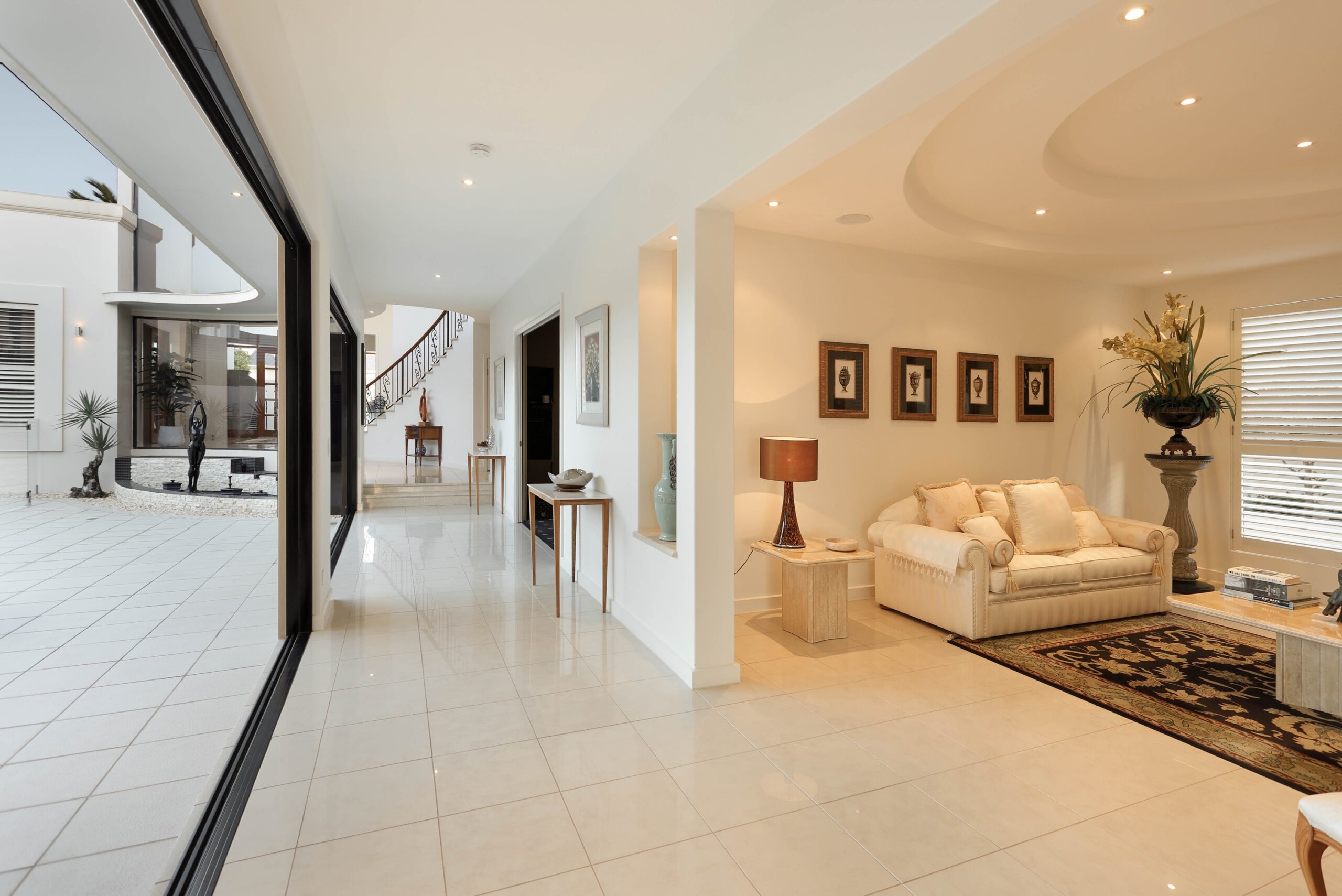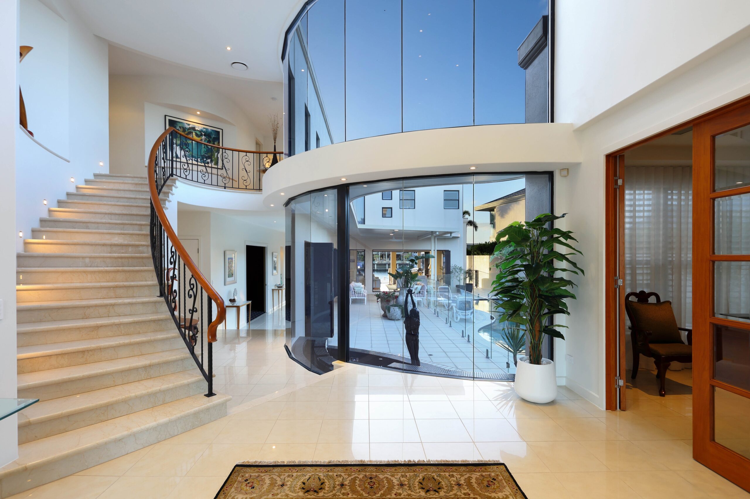 A statement entry leads into a dramatic double-height foyer, anchored by a sweeping marble staircase that immediately establishes the level of finish on offer. Rosewood doors and balustrading add warmth and contrast, while expansive glazing draws natural light deep into the home and maintains a strong connection with the outdoor entertaining zones.