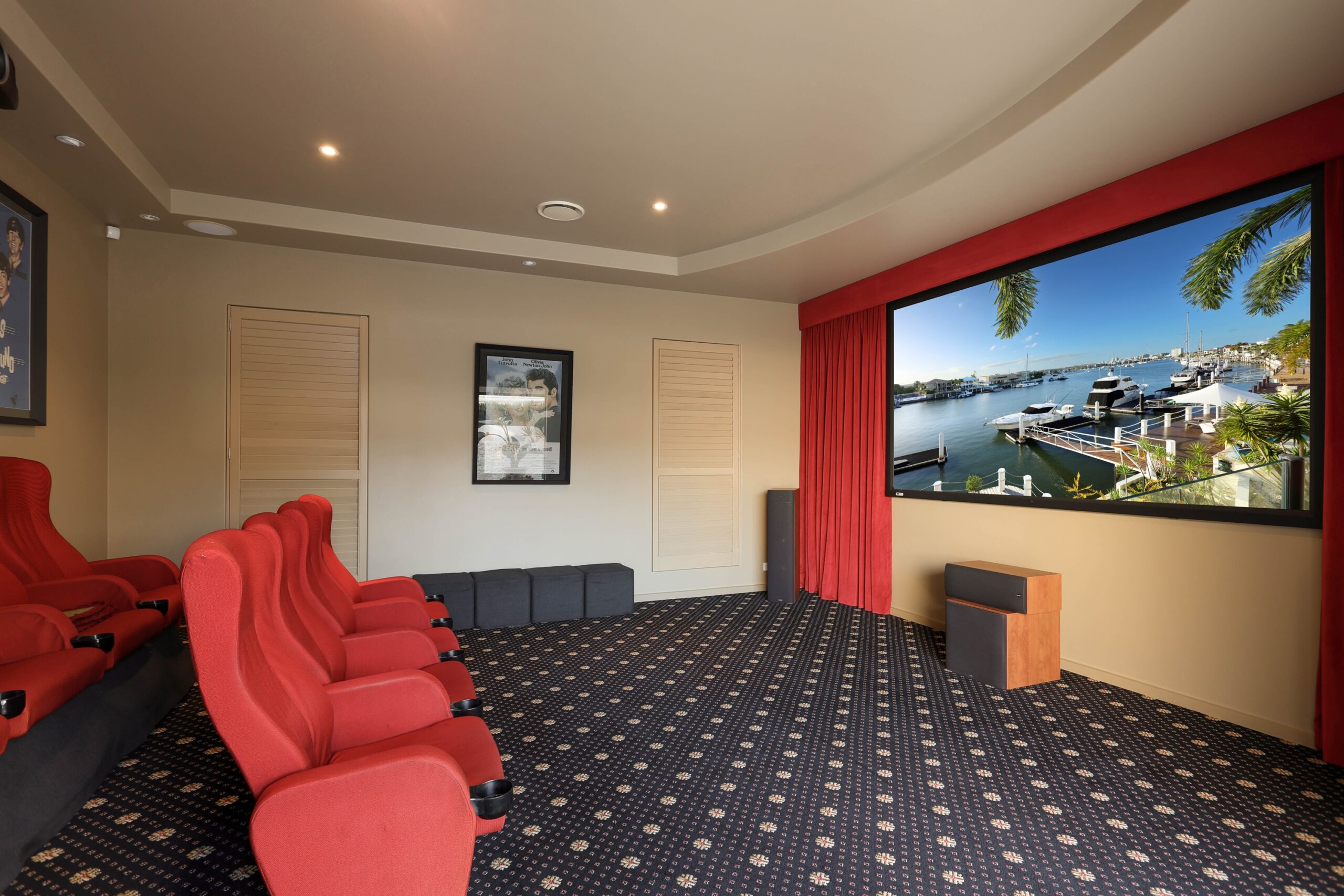A dedicated home cinema with fixed projector and screen provides an immersive viewing experience. The lower level also incorporates a separate home office and a generous guest bedroom complete with its own ensuite and walk-in robe, offering excellent flexibility for extended family or visitors.