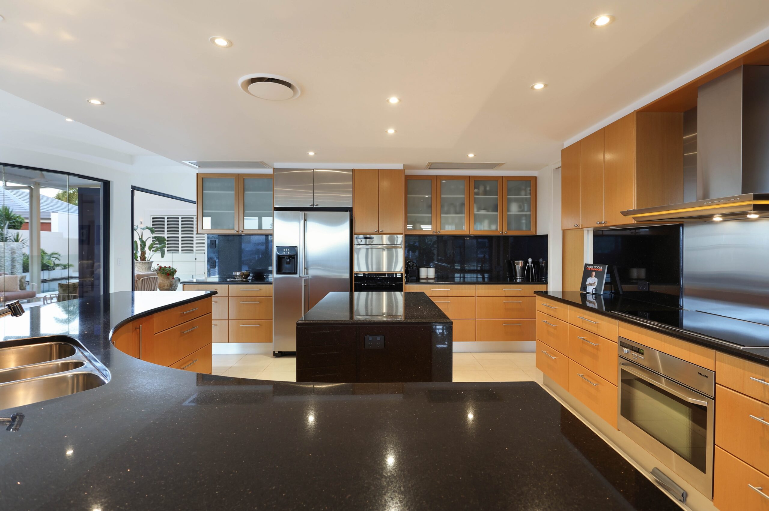 At the heart of the home, the kitchen and large butler’s kitchen are substantial and highly functional. Granite benchtops, quality cabinetry, Miele and Neff appliances, dual dishwashers and space for two full-size refrigerators cater effortlessly to large-scale entertaining while remaining practical for daily family living.