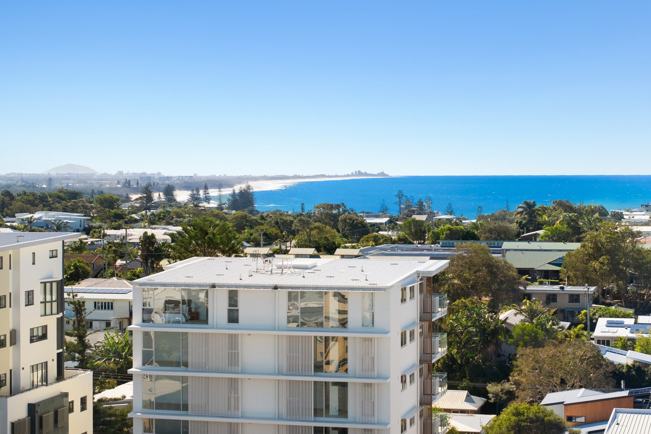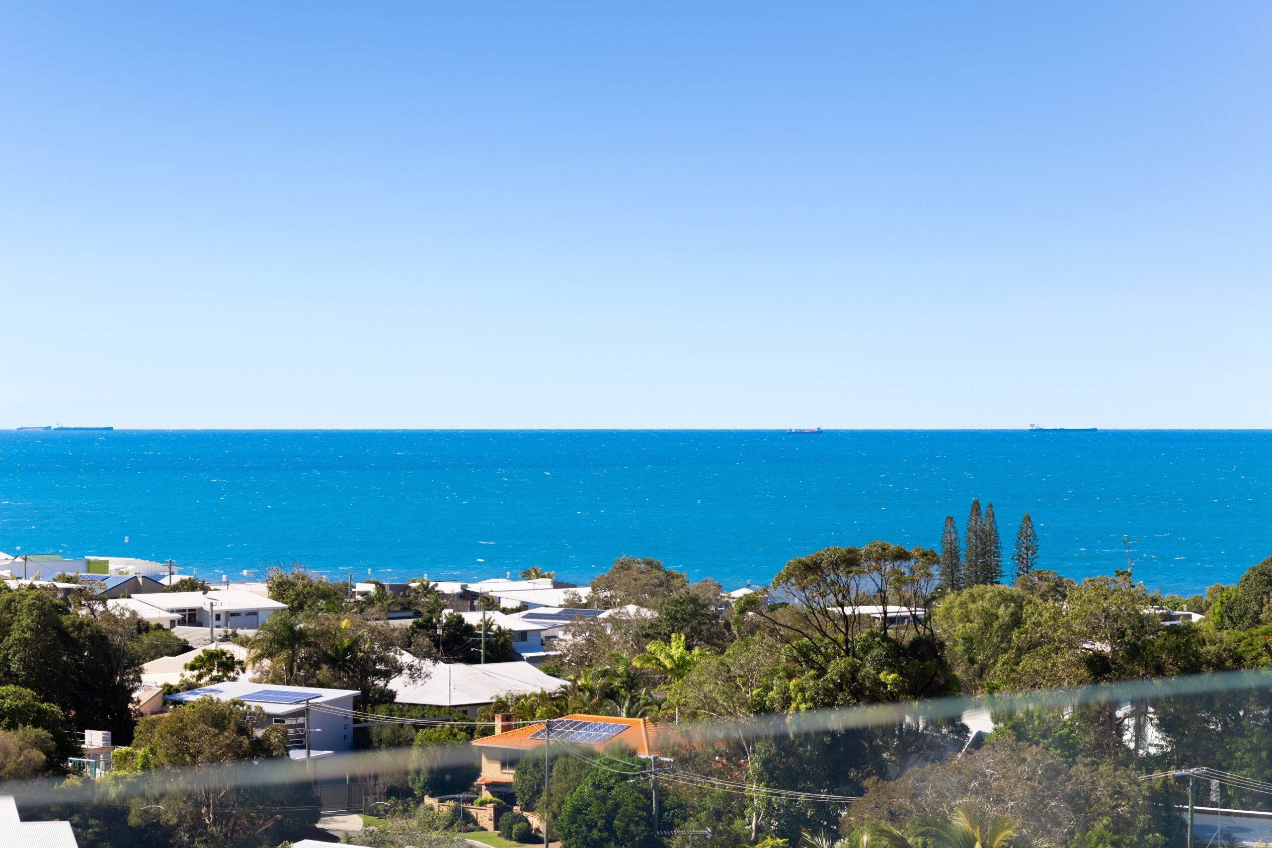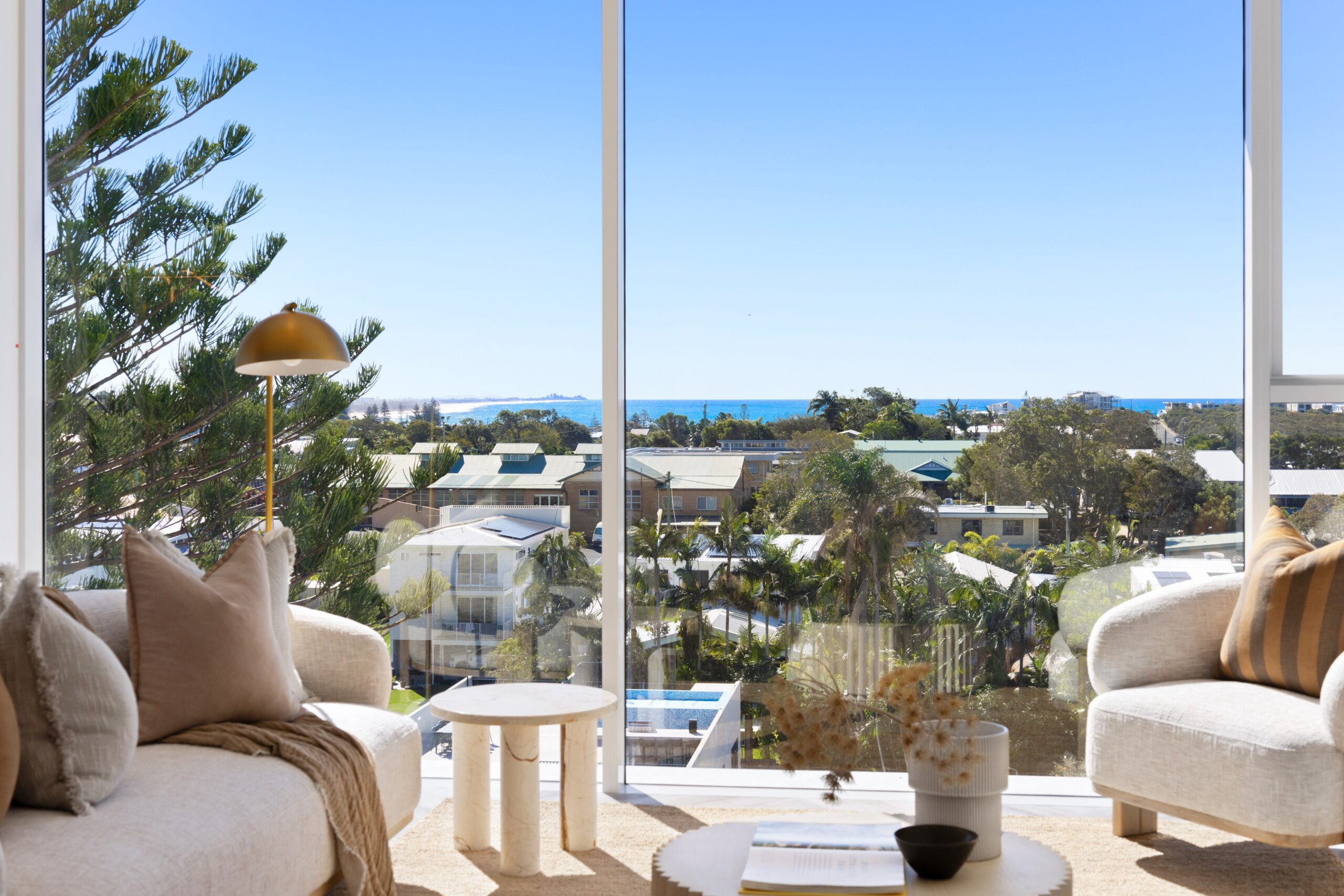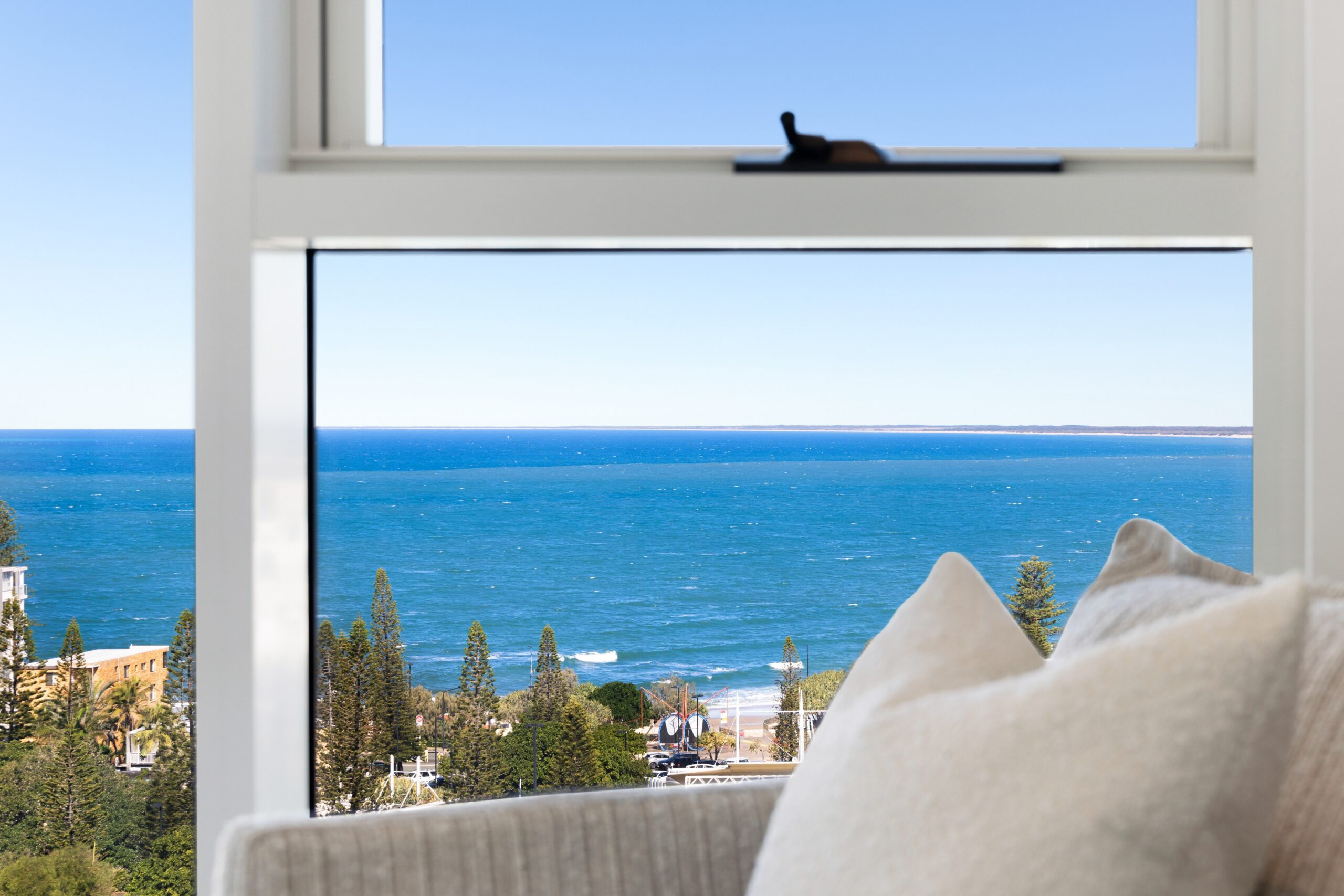 The apartment captures north and north-east coastal views from the main balcony, stretching along the shoreline toward Point Cartwright, while southern ocean views are enjoyed from the bedroom, creating a rare multi-directional outlook.