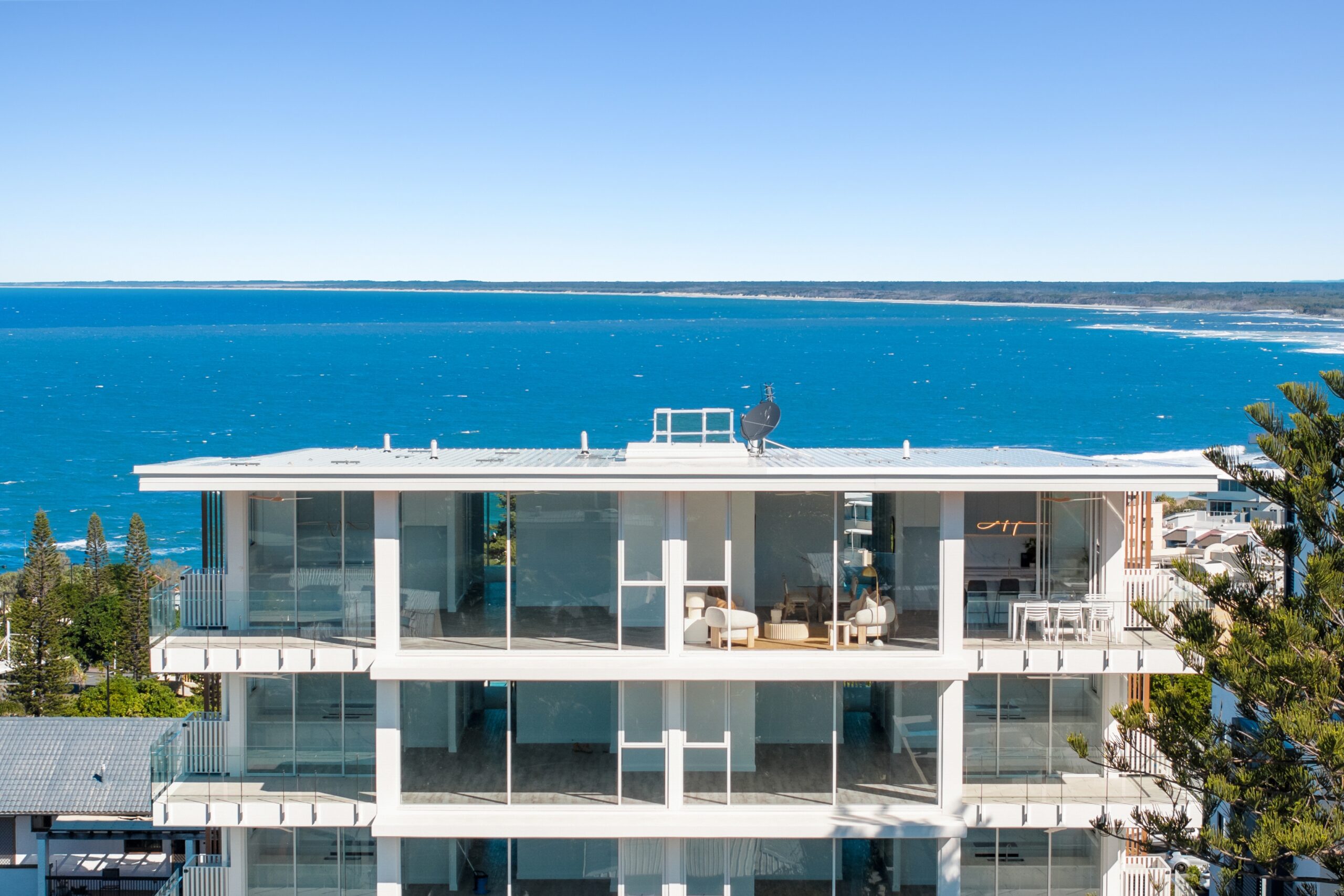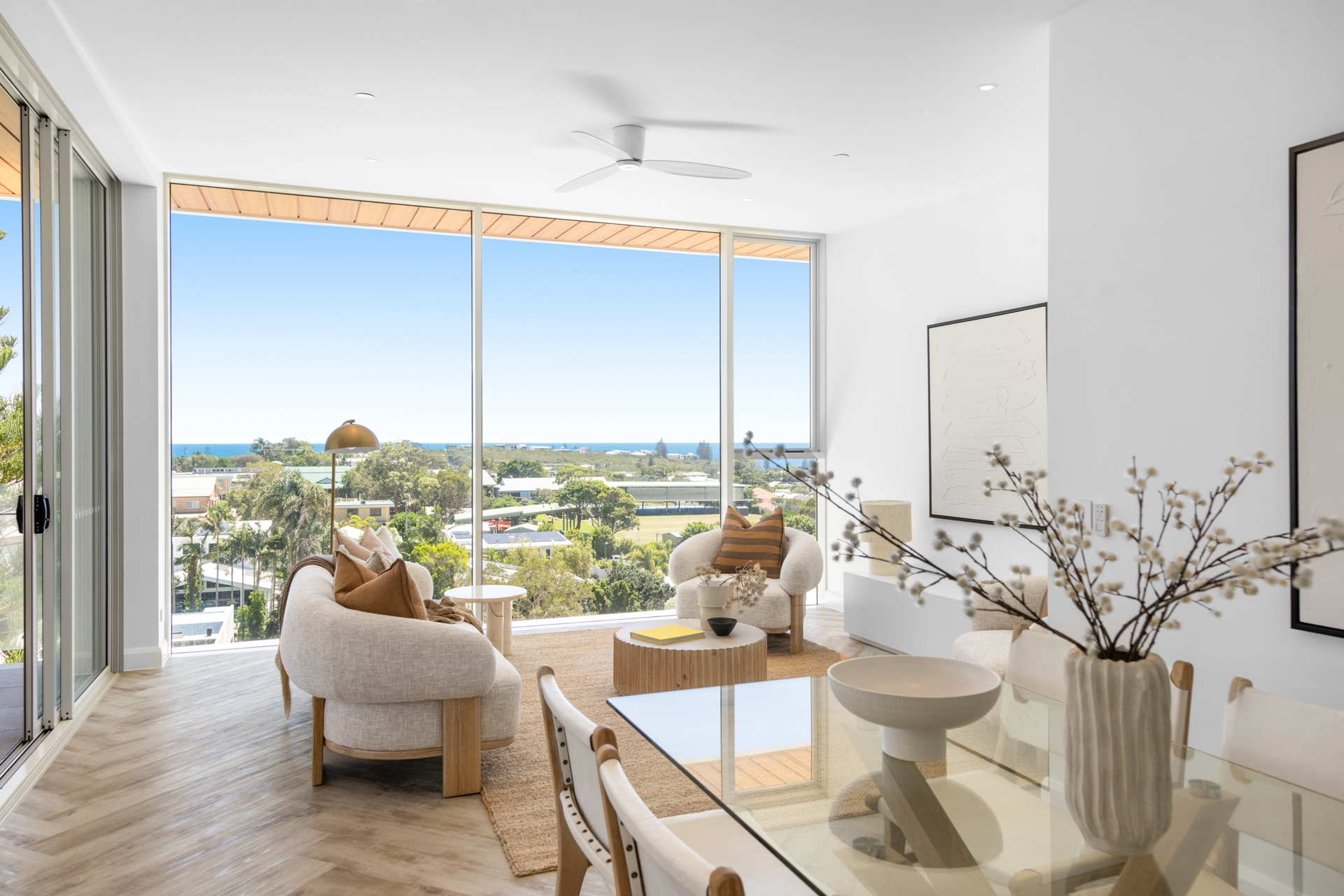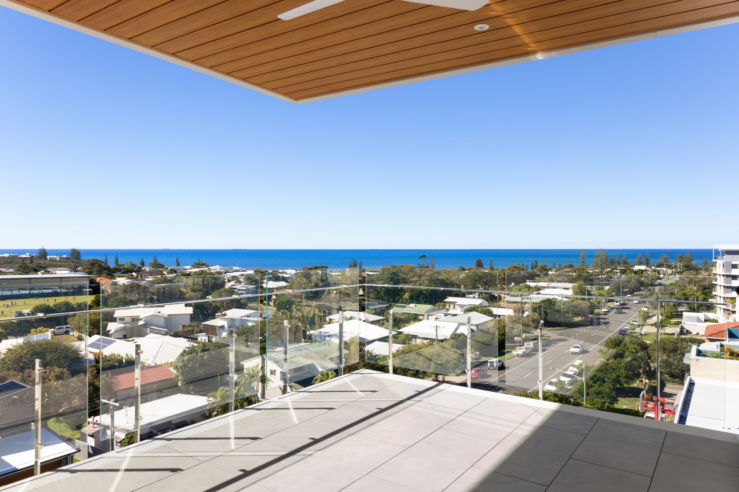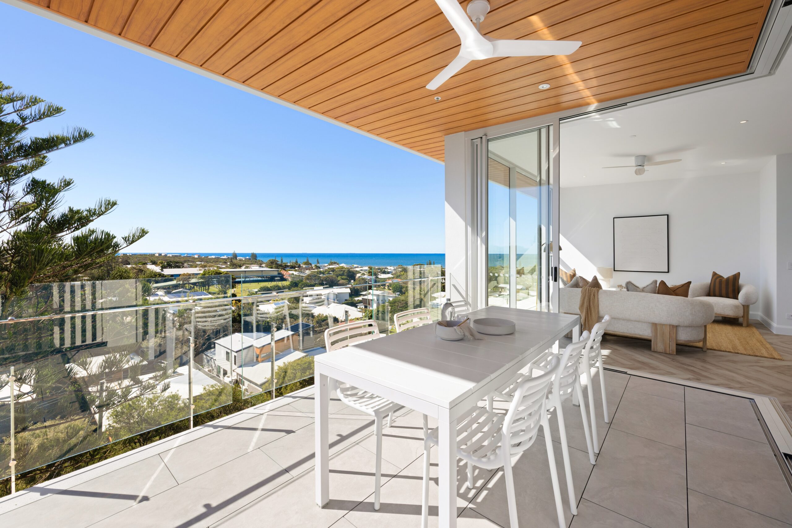 The apartment captures north and north-east coastal views from the main balcony, stretching along the shoreline toward Point Cartwright, while southern ocean views are enjoyed from the bedroom, creating a rare multi-directional outlook.