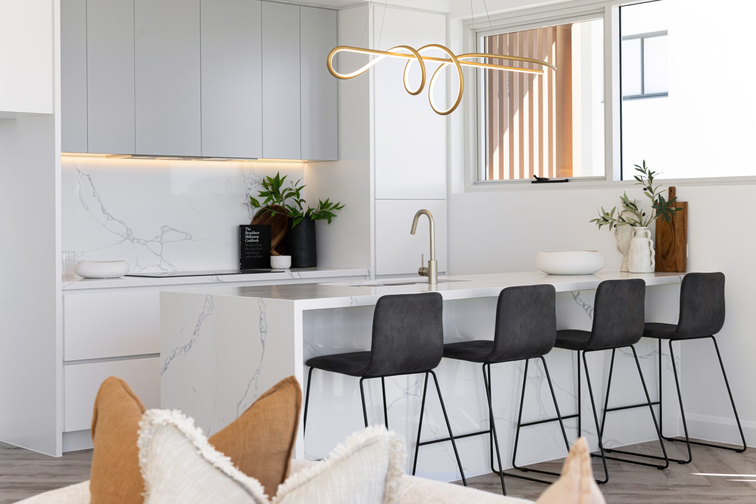 The kitchen sits at the centre of the home, featuring premium appliances, stone benchtops and excellent storage, balancing clean design with everyday practicality.