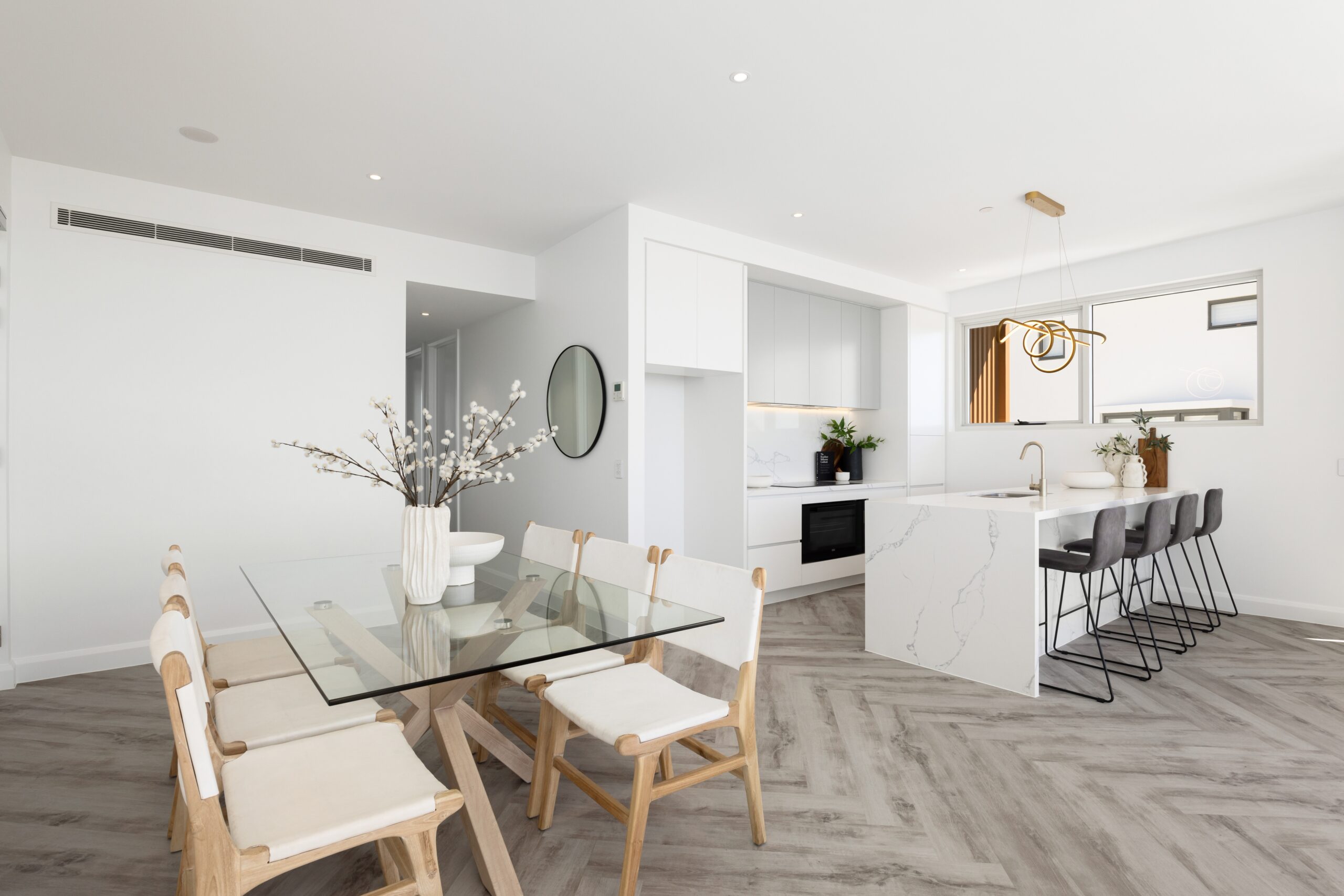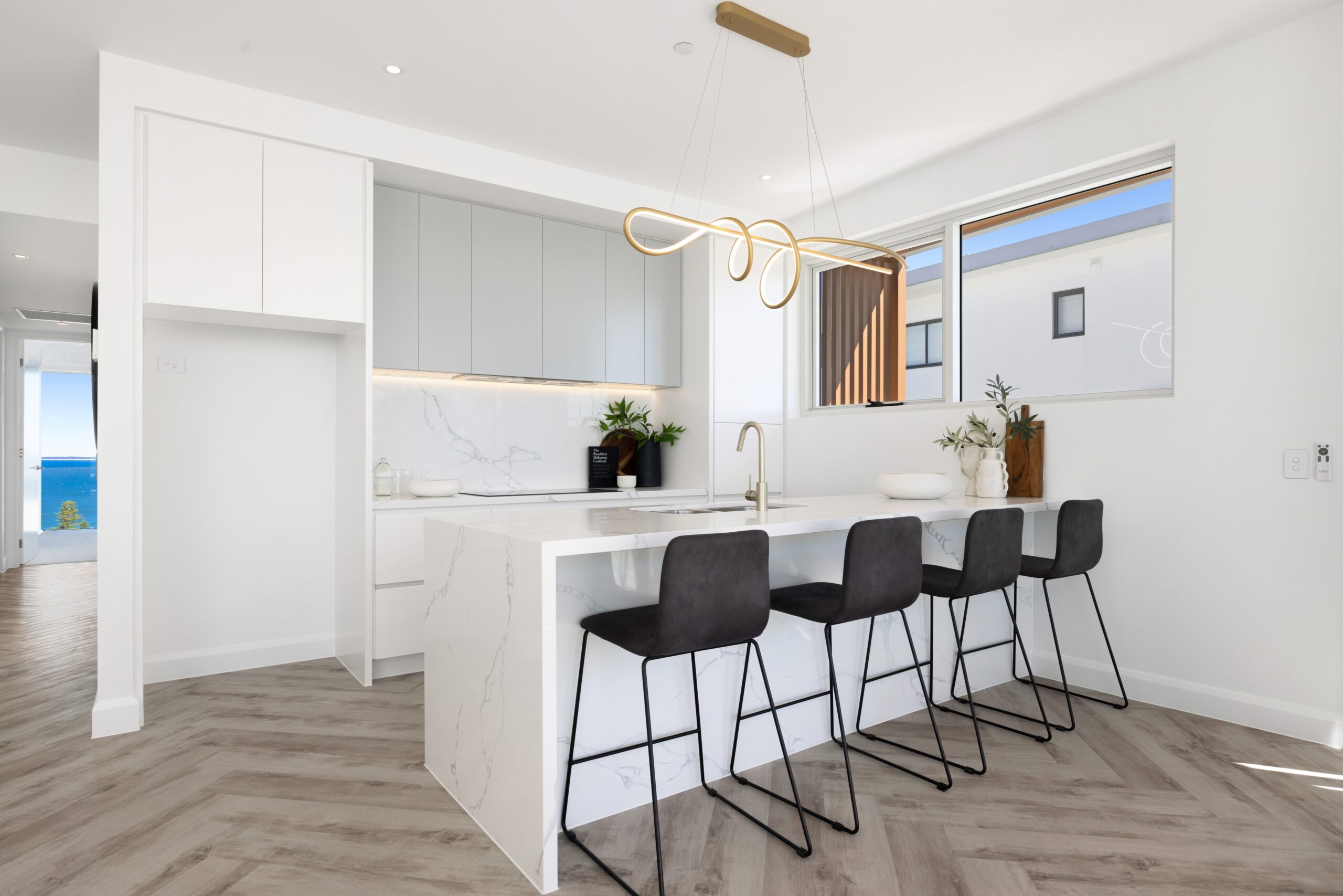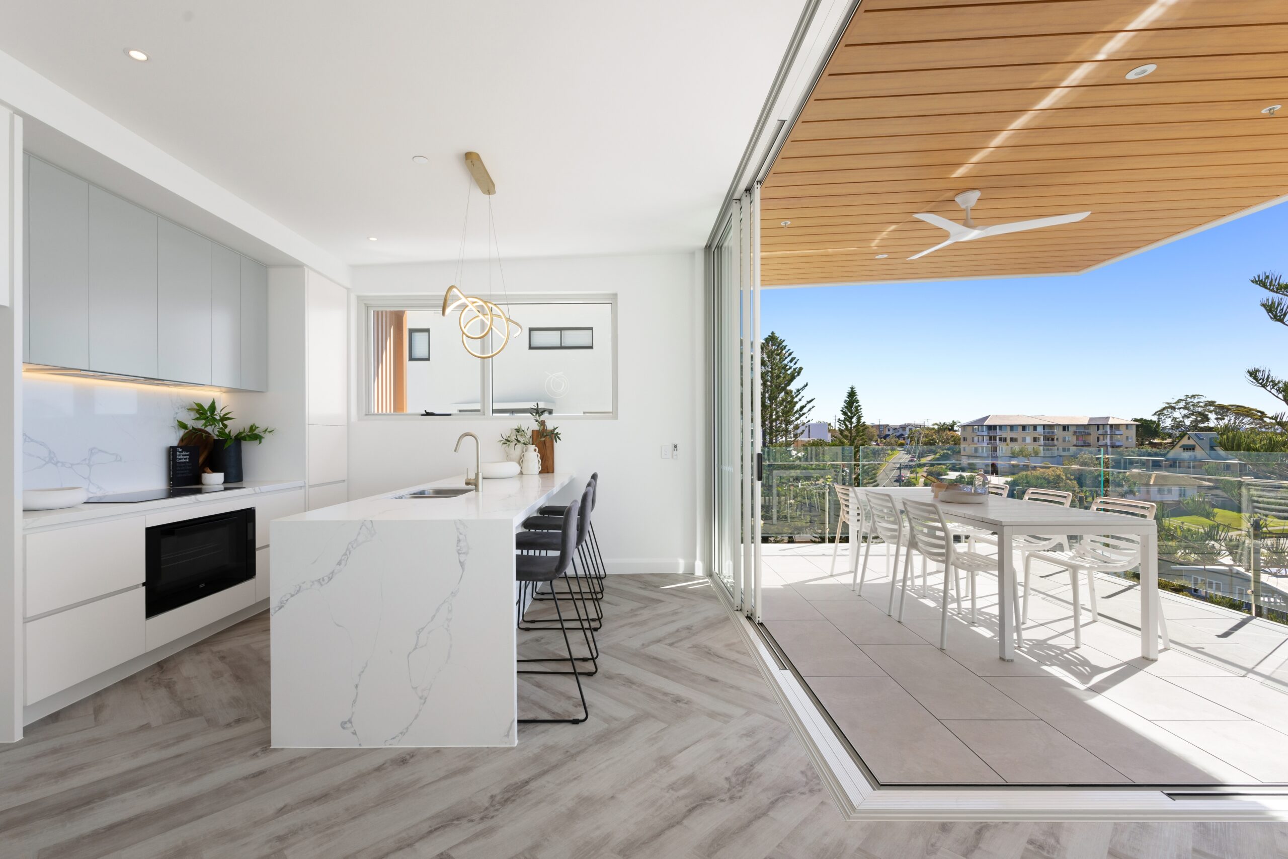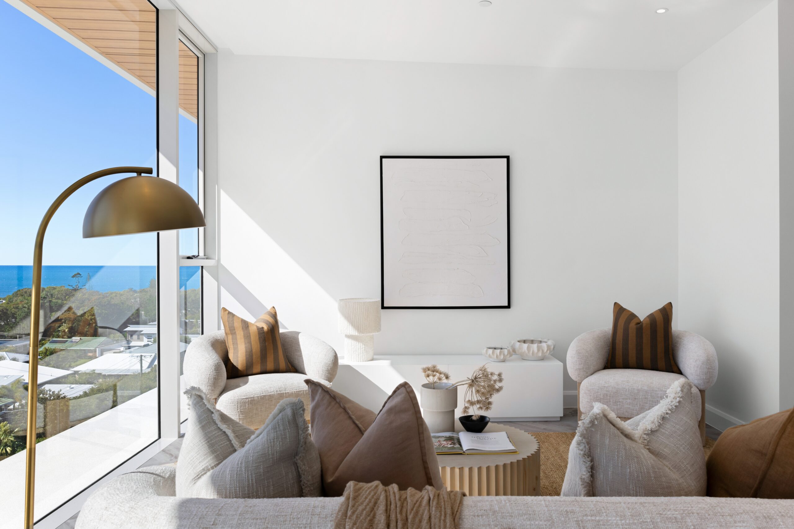 Inside, soaring ceilings and generous open-plan living provide impressive scale, flowing seamlessly to the large north-facing balcony , an ideal outdoor living space for entertaining or relaxing above the coastline.