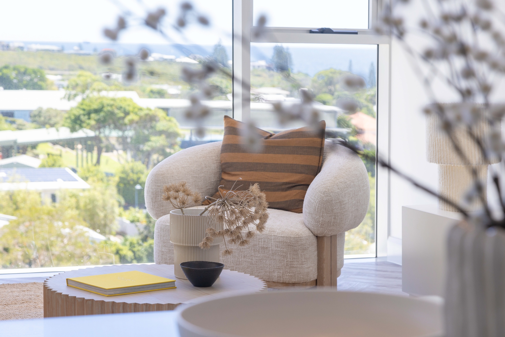 Full-height glazing draws in natural light and frames the constantly changing seascape, delivering a strong sense of connection to the coast.