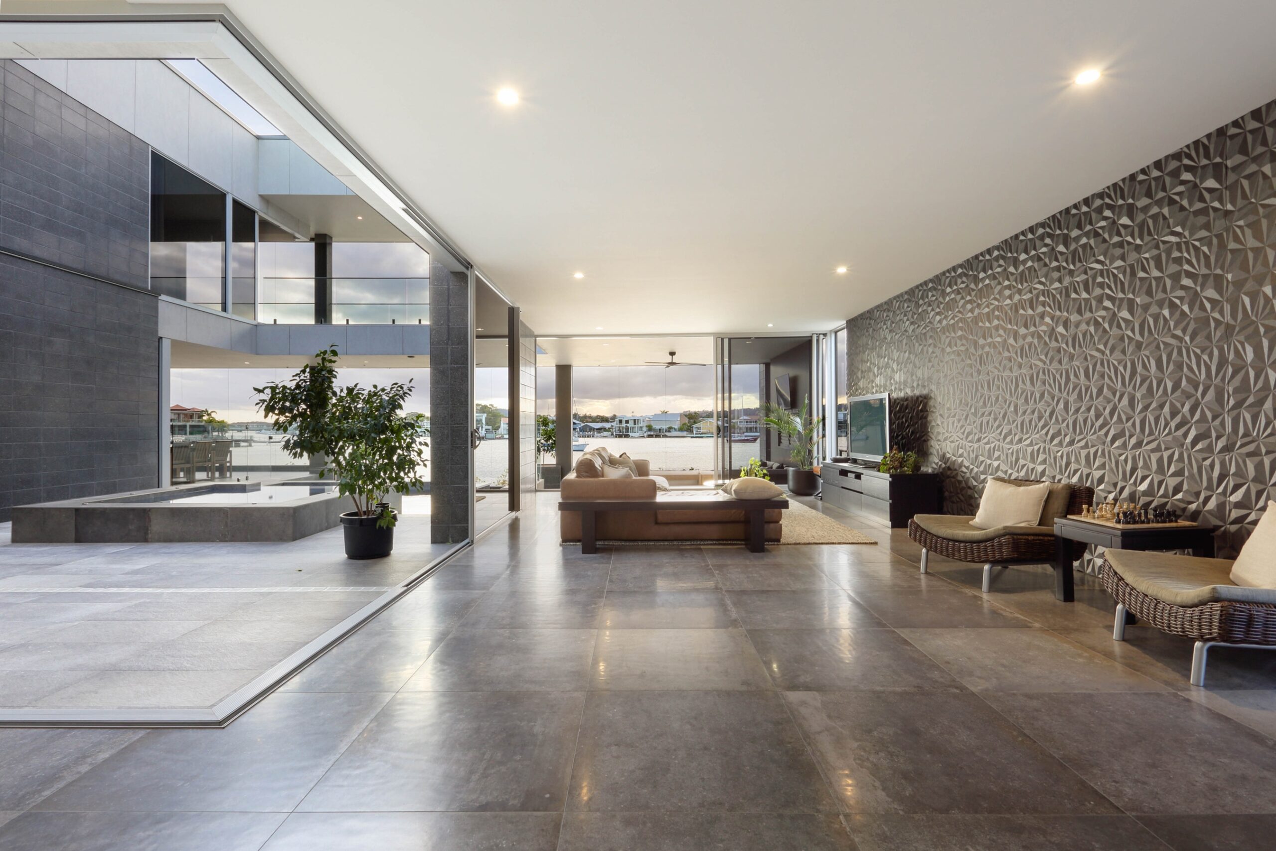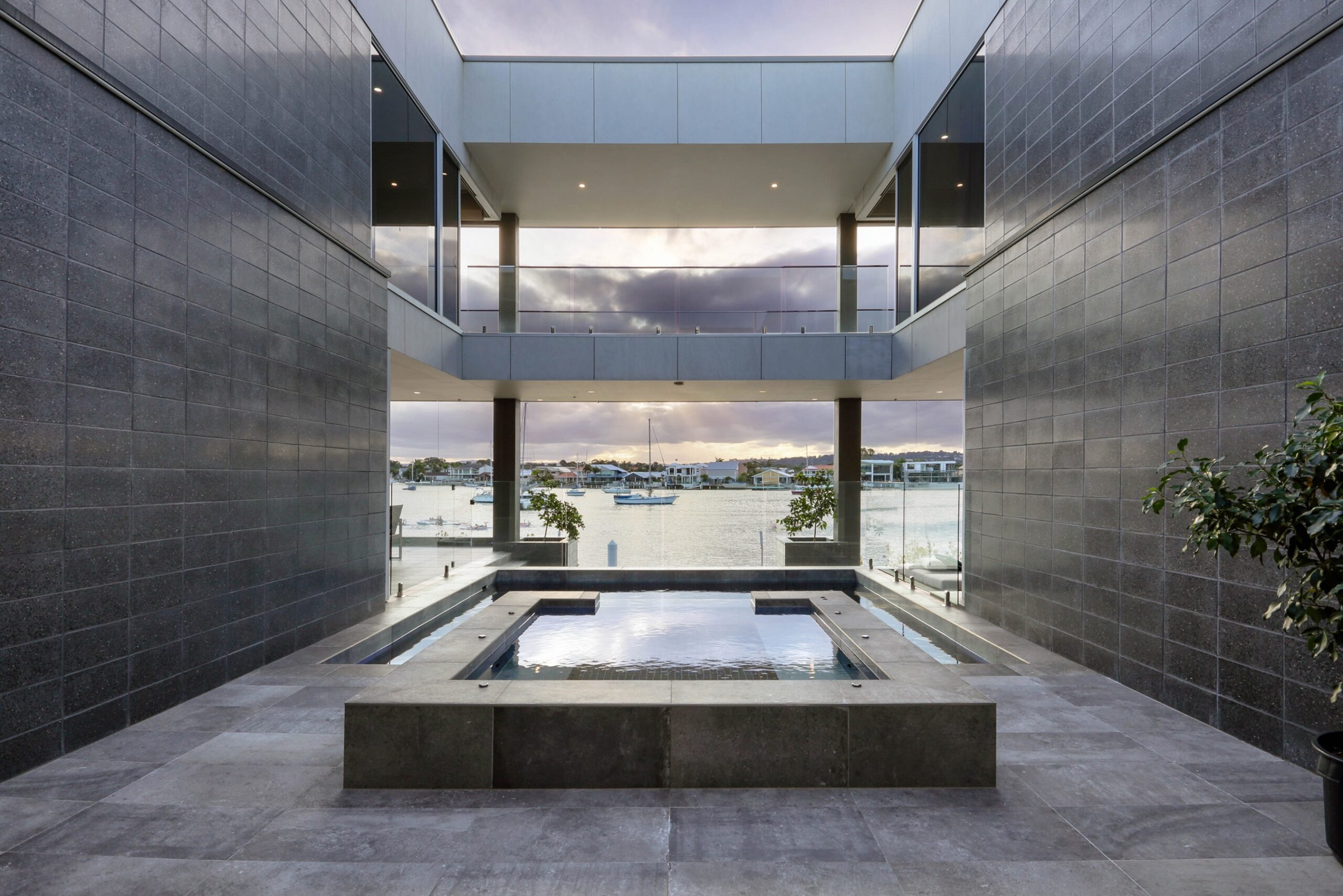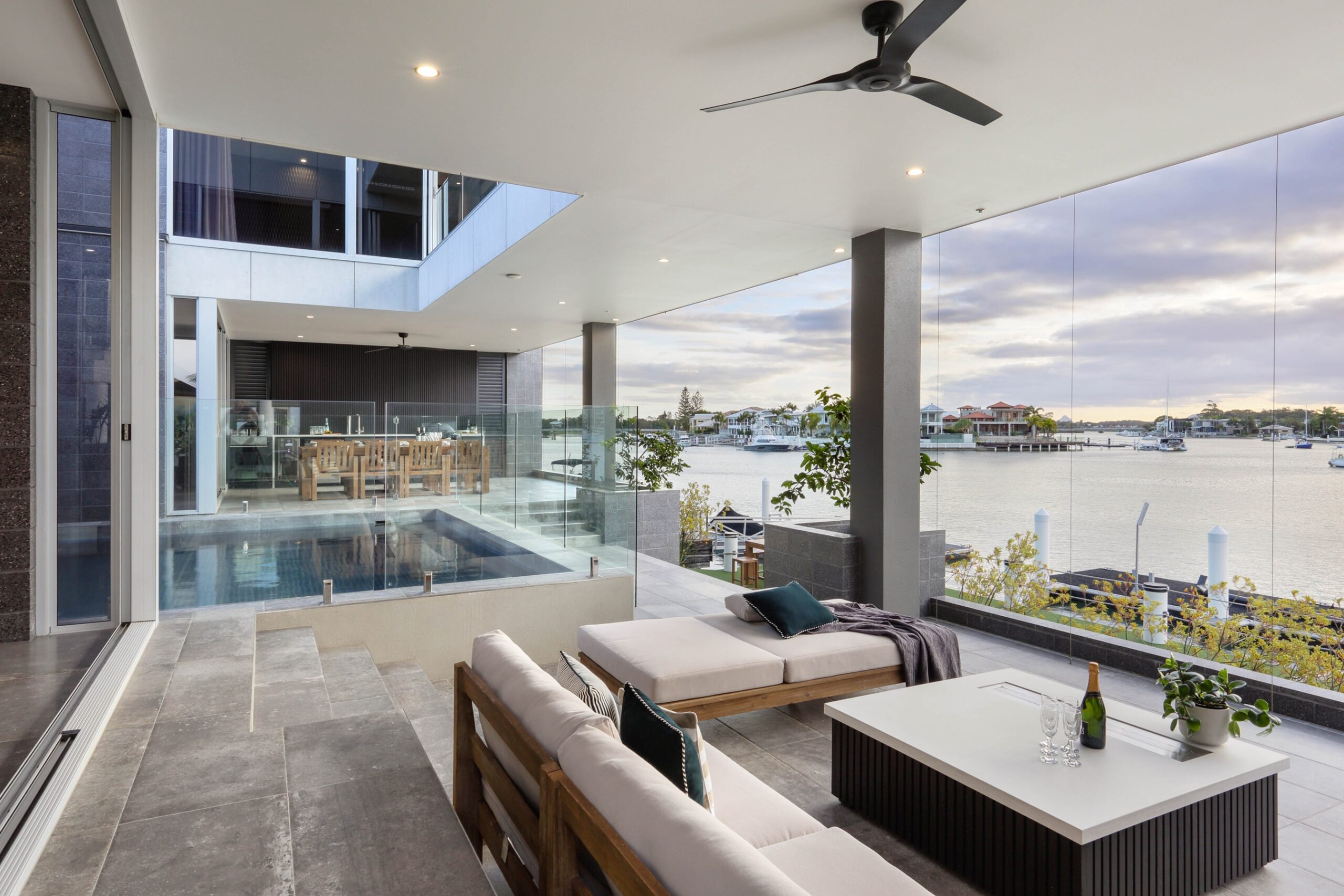 The ground floor is designed for both relaxation and entertaining, featuring a spacious media lounge, dining room, bar area, and music room. Central to these spaces is a stunning atrium pool and spa that flows effortlessly into the alfresco deck, cantilevered over the river. The fully tiled luxury pool and spa are equipped with an EnviroSwim fresh water filtration system for crystal-clear water without harsh chemicals.