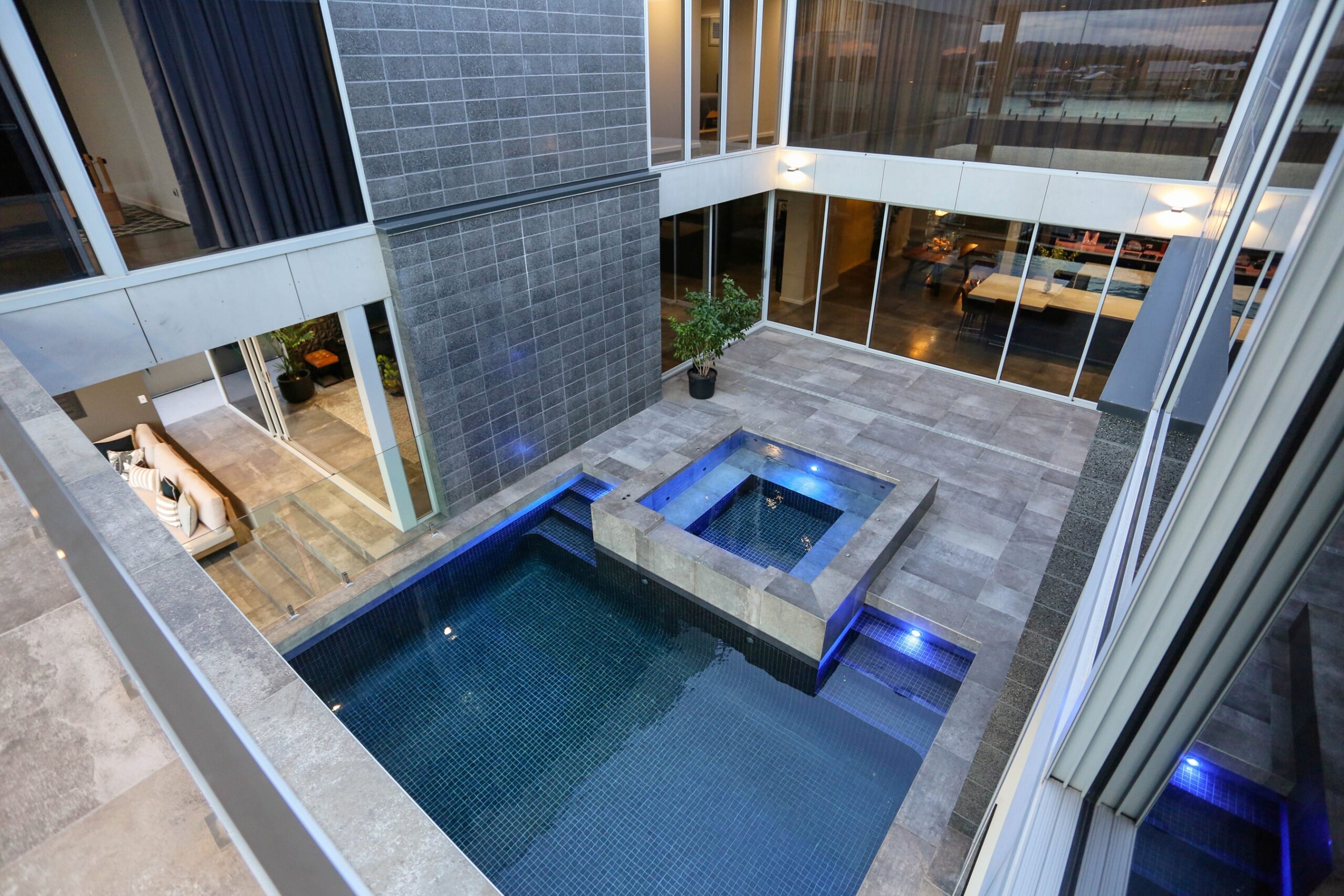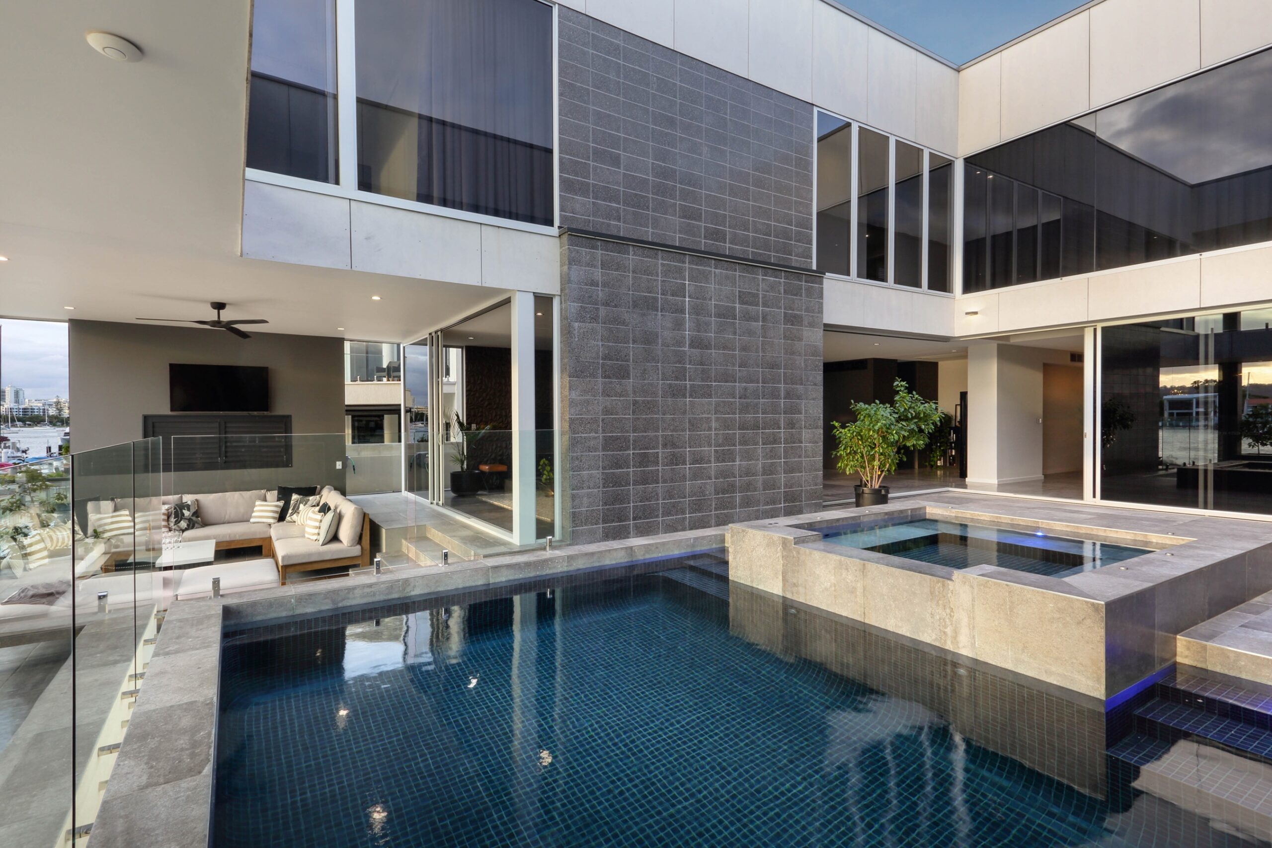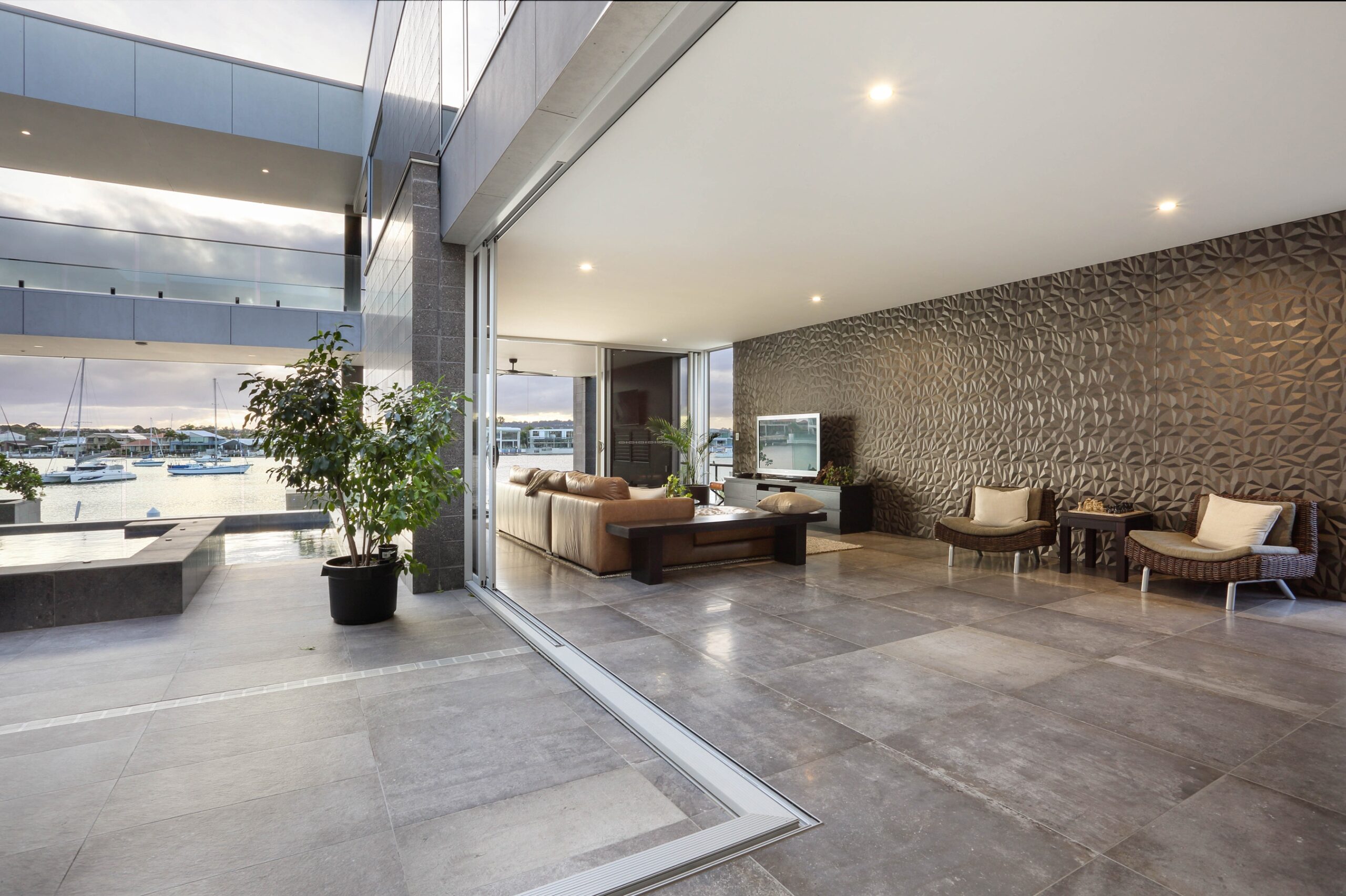 The ground floor is designed for both relaxation and entertaining, featuring a spacious media lounge, dining room, bar area, and music room. Central to these spaces is a stunning atrium pool and spa that flows effortlessly into the alfresco deck, cantilevered over the river. The fully tiled luxury pool and spa are equipped with an EnviroSwim fresh water filtration system for crystal-clear water without harsh chemicals.