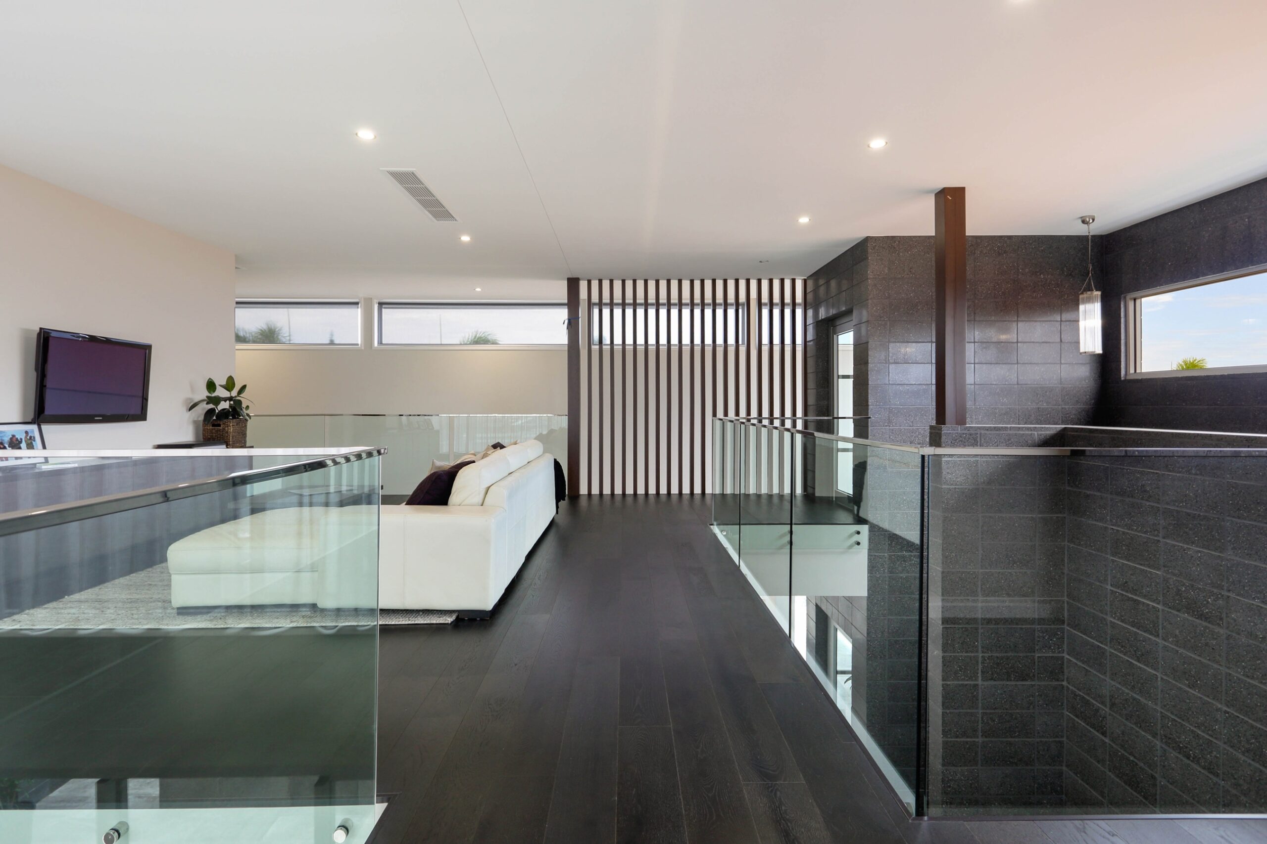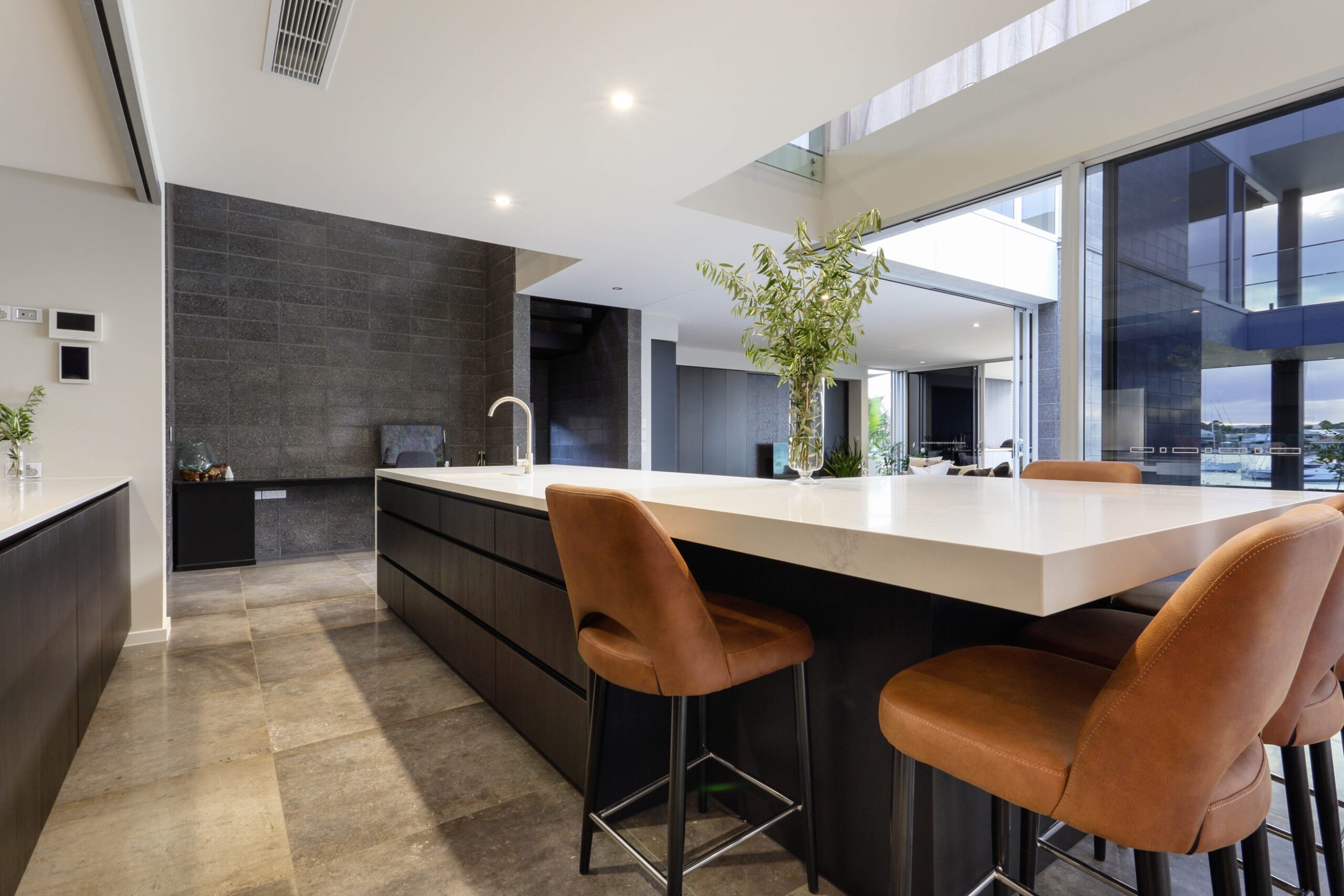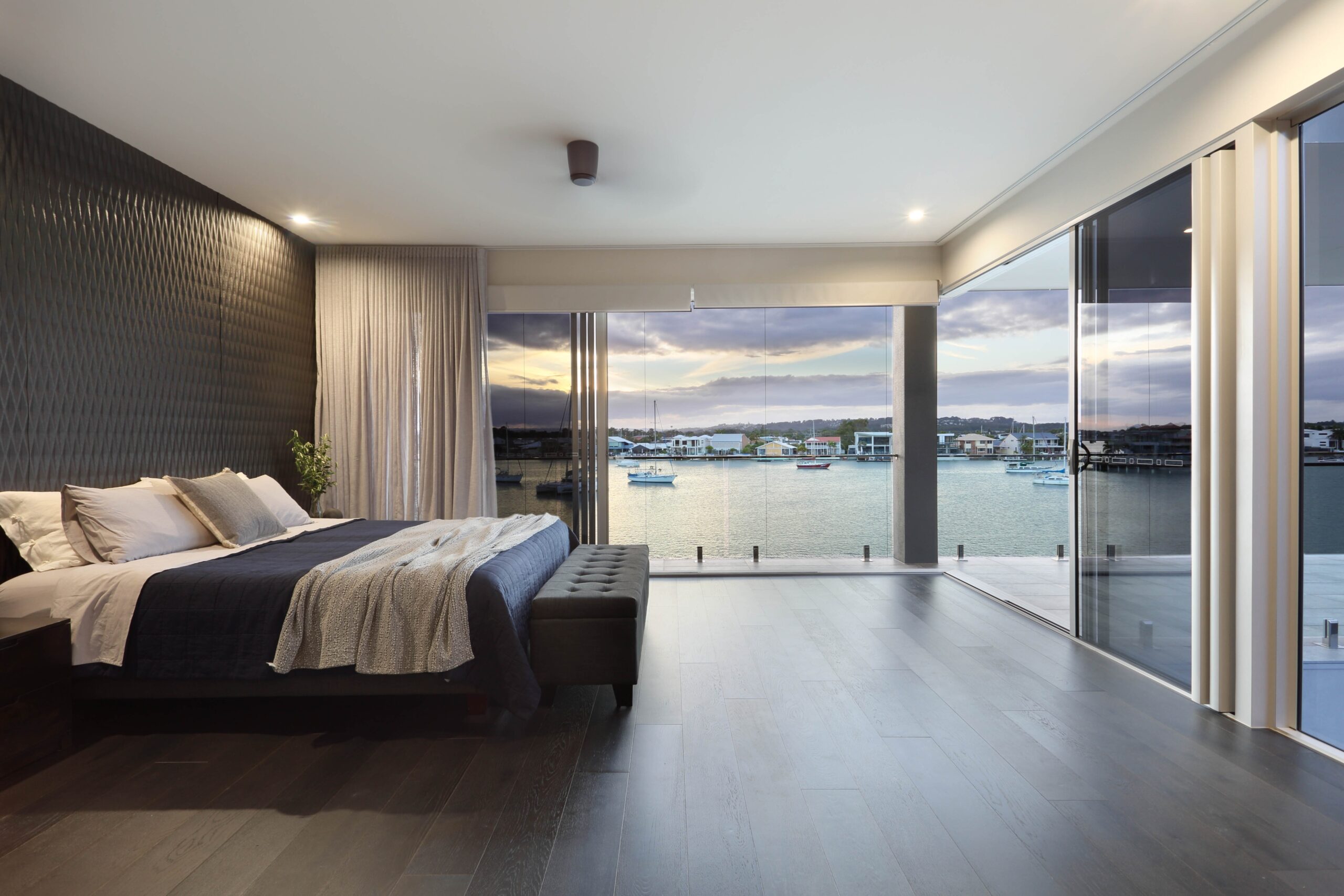 Upstairs, four bedrooms, three bathrooms, and a sitting room are arranged around open voids, enhancing light and space. The master suite features a luxurious open ensuite, walk-in robe, and a private balcony offering spectacular river views. Dark engineered oak flooring contrasts beautifully with expansive windows and sliding doors.