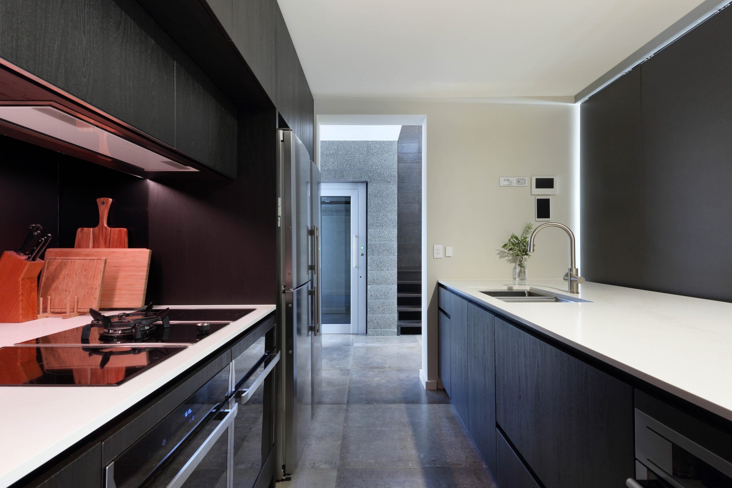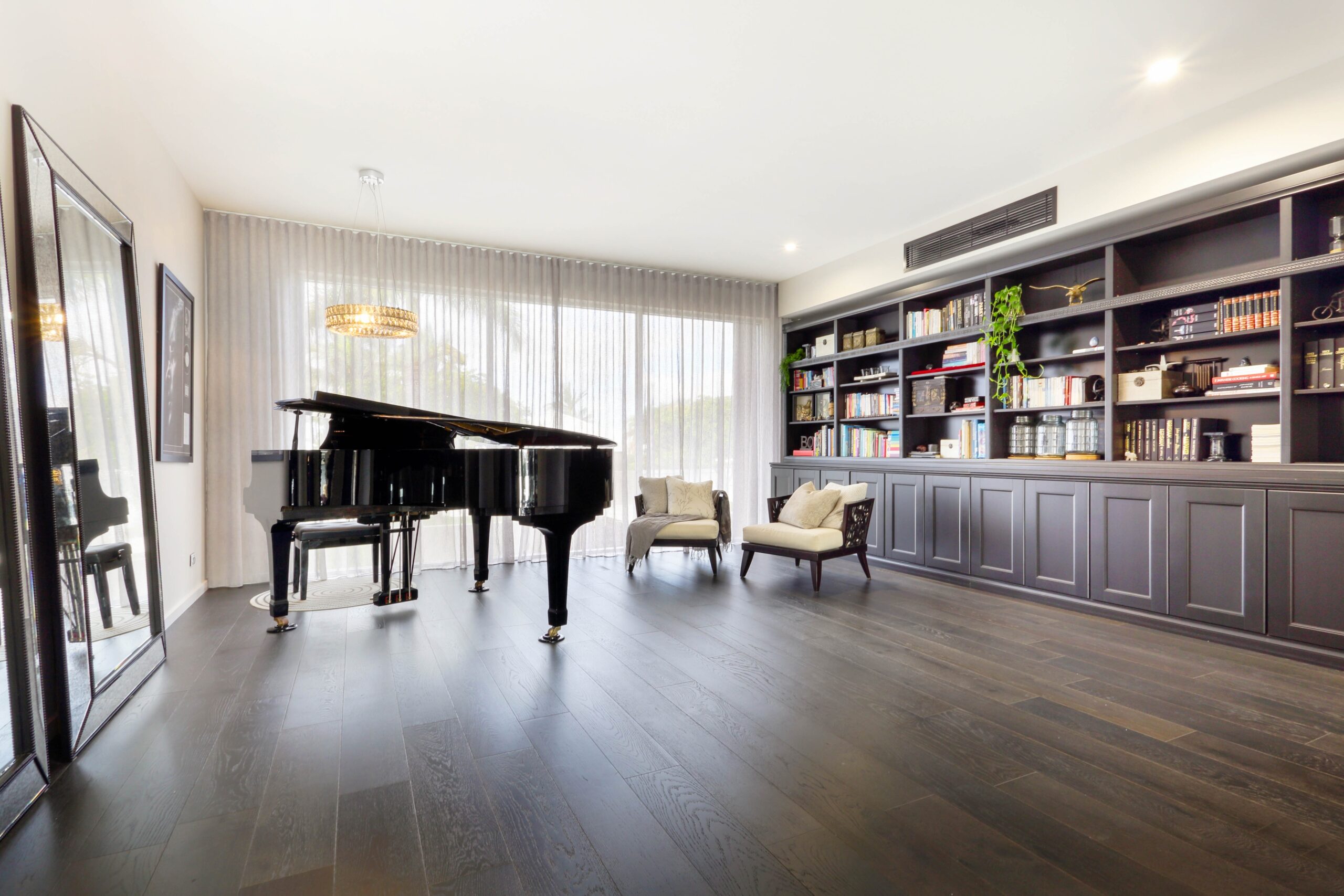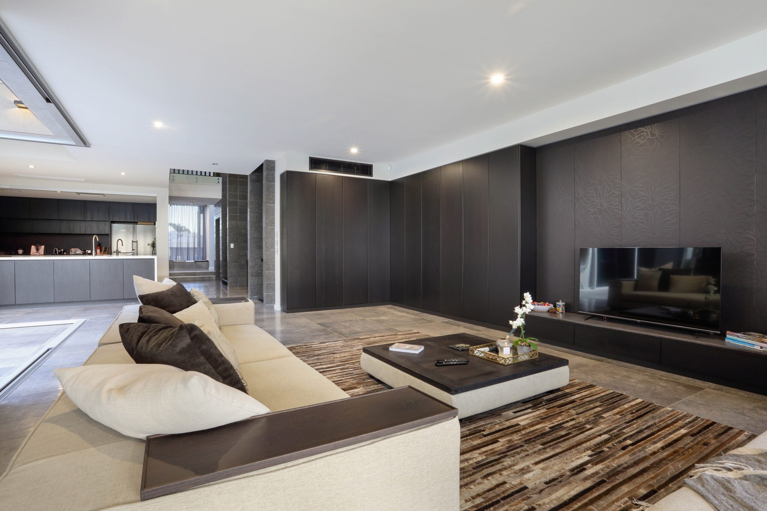 The designer kitchen, with its fully equipped butler’s pantry, is a chef’s dream. Luxury Caesarstone benchtops, bespoke handle-less cabinetry, and advanced appliances—including twin pyrolytic ovens, a steam combination oven, induction and gas cooktops, and a 5-in-1 Zip tap—ensure exceptional functionality and style.