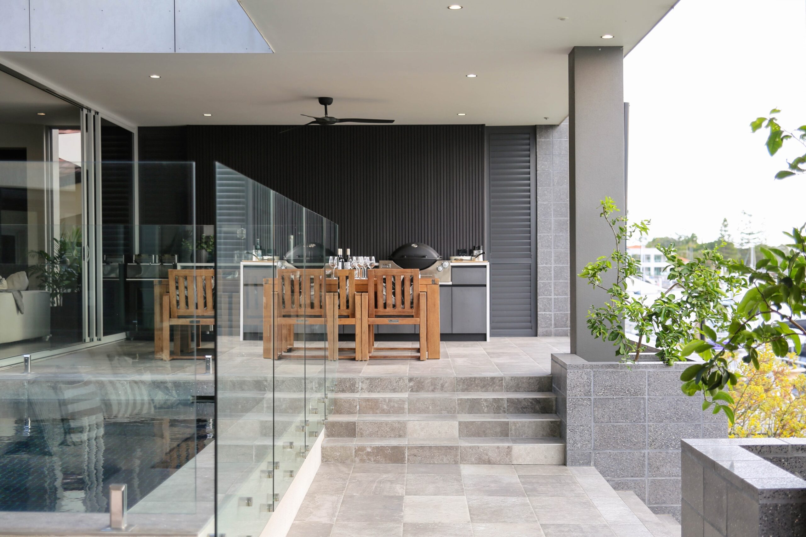 Outdoor Living: Fully equipped outdoor kitchen, alfresco lounge, and dining areas