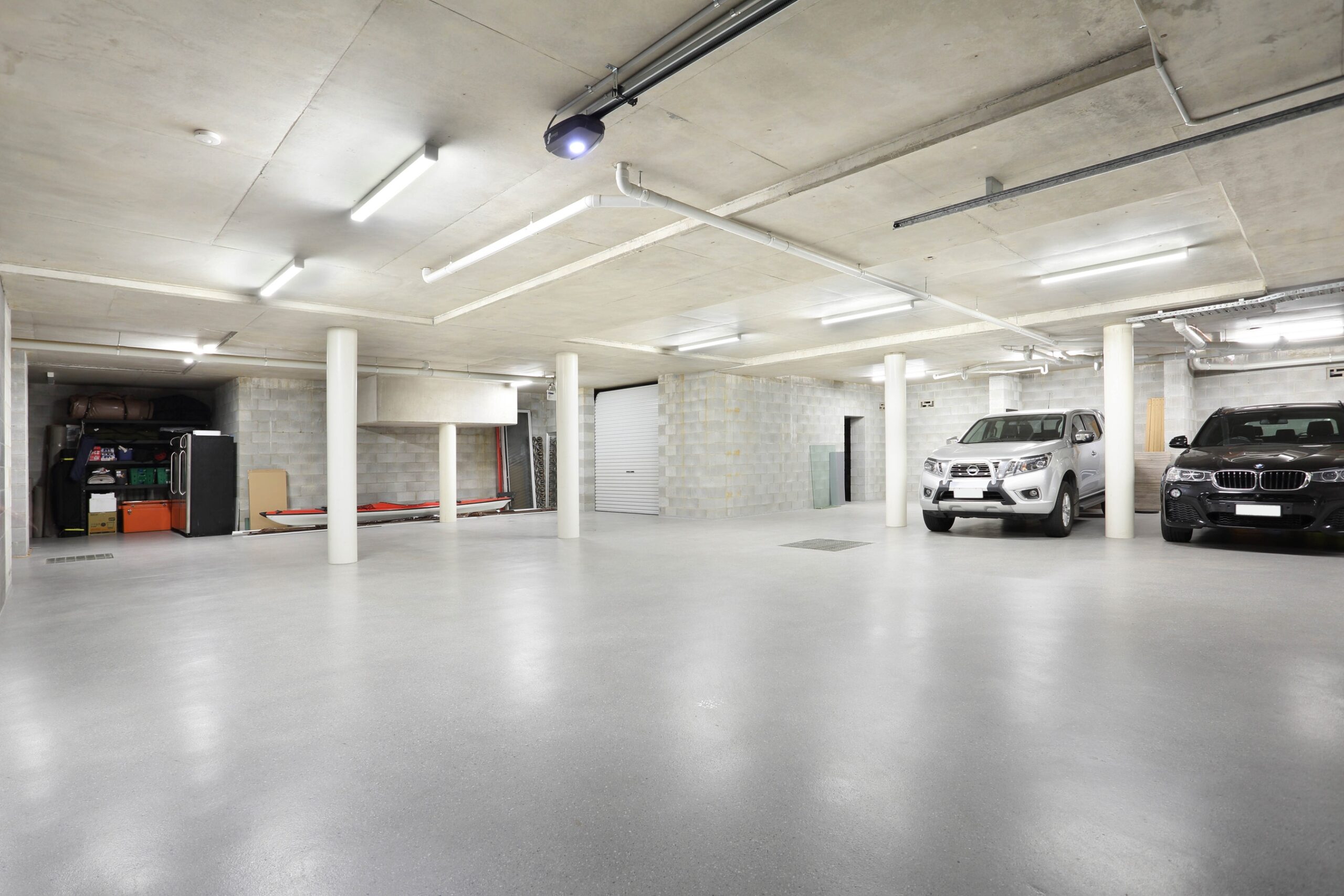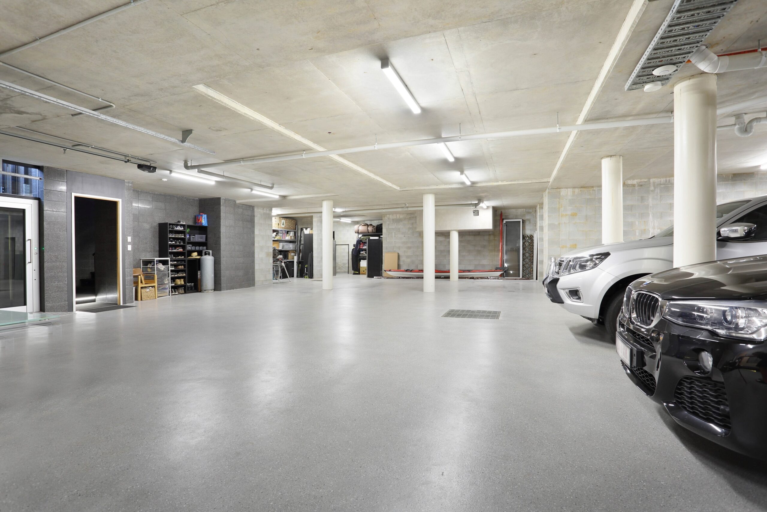 The basement is engineered with double-reinforced block walls, offering space for up to 10 cars, a 40m² gymnasium, 22m² workshop, and multiple storage zones. Epoxy-fleck seamless flooring and high ceilings provide a premium, functional finish.