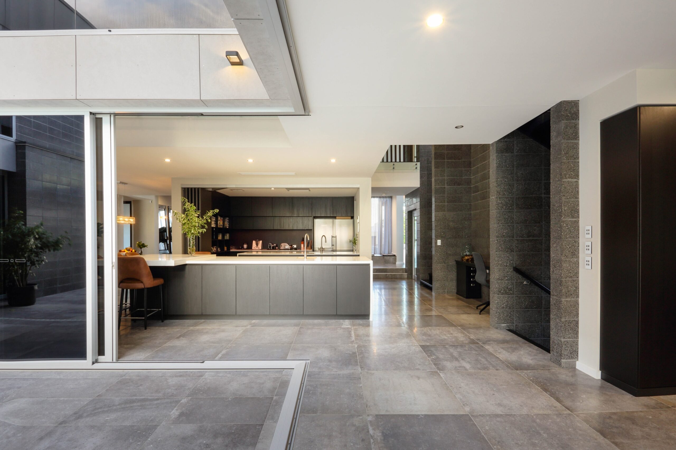 Upon entering, you’ll be captivated by the grandeur of double-height ceilings framed by polished National Masonry block walls and complemented by exquisite Italian porcelain tiles. Expansive retractable doors seamlessly connect the main living area to the outdoors, enhancing the home’s unparalleled sense of space and luxury.